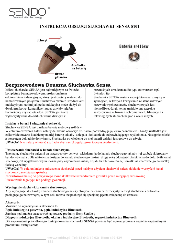 INSTRUKCJA OBSŁUGI SŁUCHAWKI SENSA S101 Bezprzewodowa Douszna Słuchawka Sensa Mikro-słuchawka SENSA jest najmniejszym na świecie, kompletnie bezprzewodowym, profesjonalnym odbiornikiem indukcyjnym, który jest częścią zestawu do kamuflowanych połączeń. Słuchawka razem z urządzeniami indukcyjnymi takimi jak pętla indukcyjna może służyć do dwukierunkowej komunikacji przez zwykły telefon komórkowy czy radiotelefon. SENSA jest także wykorzystywana do odsłuchiwania dźwięku z przenośnych urządzeń audio typu odtwarzacz mp3, dyktafon itp. Słuchawka SENSA została zaprojektowana z myślą o sytuacjach, w których korzystanie ze standardowych przewodowych zestawów słuchawkowych jest niemożliwe, dzięki temu znajduje ona szerokie zastosowanie w firmach ochroniarskich, filmowych i telewizyjnych studiach nagrań i wielu innych. Instalacja baterii i włączanie słuchawki. Słuchawka SENSA jest zasilana baterią srebrową sr416sw. W celu umieszczenia baterii należy delikatnie otworzyc szufladkę podwadzając ją lekko paznokciem . Kiedy szufladka jest całkowicie otwarta kładziemy na niej baterię tak aby dolegala dokladnie do odpowiadającego wyżłobienia. Następnie całość z powrotem dokładnie domykamy. Słuchawka po włożeniu do niej baterii działa i jest gotowa do użycia. UWAGA! Nie należy otwierać szufladki zbyt szeroko gdyż grozi to jej uszkodzeniem. Umieszczanie słuchawki w kanale słuchowym. Trzymając słuchawkę palcami za przezroczysty uchwyt wkładamy ją do kanału słuchowego tak aby jej czubek skierowany był do wewnątrz . Dla ułatwienia dostępu do kanału słuchowego można drugą ręką odciągnąć płatek ucha do dołu. Jeśli kanał słuchowy jest wyjątkowo wąski można przy użyciu bawełnianej szpatułki lub bawełnianej szmatki nasmarować go niewielką ilością wazeliny. UWAGA! W celu uniknięcia zniszczenia słuchawki przed każdym użyciem słuchawki należy dokłanie wyczyścić kanał słuchowy bawełnianą szpatułką. Niezastosowanie się do powyższego może skutkować uszkodzeniem głośnika przez zalegającą woskowinę . Uszkodzenie tego typu nie podlega gwarancji. Wyciąganie słuchawki z kanału słuchowego. Aby wyciągnąć słuchawkę z kanału słuchowego należy chwycić palcami przezroczysty uchwyt słuchawki i delikatnie pociągnąć go na zewnątrz, w tym celu można też posłużyć się specjalną pęcetą załączoną do zestawu. Akcesoria: Możliwe do wykorzystania akcesoria to: Pętla indukcyjna pasywna, pętla indukcyjna Bluetooth, Zamiast pętli można zastosować najnowsze produkty firmy Senido tj: Długopis indukcyjny Bluetooth, okulary indukcyjne Bluetooth, zegarek indukcyjny Bluetooth Dla zapewnienia prawidłowego funkcjonowania słuchawka SENSA powinna być wykorzystywana wspólnie oryginalnymi produktami firmy Senido. www.senido.pl Tel: 42 643 47 02; Kom: 692 429 151 Specyfikacja: Czestotliwość odbiornika 300-3000Hz Odbiornik magnetyczny Maksymalna głośność 120dB Współczynnik szumów +/-2% Bateria 1,55V typ 337 lub SR416sw Minimalne zasilanie 1.1V Czas pracy na jednej baterii do 10 godzin Przenoszenie dżwięku od 78 dB do 2kHz-10 mA/M Filtr przeciwwoskowinowy tulejka Rozwiązywanie problemów: Słuchawka działa cicho lub w ogóle nie działa: 1. Sprawdź czy bateria nie jest zużyta. Włóż nową baterię. 2. Sprawdź czy pętla indukcyjna jest dobrze podłączona do telefonu. W telefonie powinna być wyświetlona ikona zestawu słuchawkowego. 3. Sprawdź czy telefon ma ustawioną głośność na najwyższy poziom, jeśli nie podgłoś go do maksimum. 4. Podgłoś pętlę do maksimum - patrz instrukcja obsługi pętli (dotyczu pętli indukcyjnych z regulacją głośności). 5. Sprawdź czy słuchawka jest prawidłowo usytuowana w kanale słuchowym. Jeśli słuchawka jest ułożona nieprawidłowo jej otwór może być przytkany przez ścianę kanału słuchowego i wtedy dźwięk będzie bardzo cichy lub wogóle nie będzie nic słychać. Słuchawke w kanale słuchowym należy ułożyć tak aby dźwięk był jak najgłośniejszy. 6. Sprawdź czy pętla indukcyjna nie jest zbyt daleko w stosunku do słuchawki. Optymalna odległość to ok 30cm. Im pętla jest bliżej słuchawki tym dźwięk jest głośniejszy. 7. Sprawdź czy otwór słuchawki nie został przytkany woskowiną. Dno otworu jest na głębokości ok 2 mm i jego dno połyskuje w świetle. Jeśli jest inaczej, oznacza to, że słuchawka najprawdopodobniej jest zapchana, w tym przypadku należy słuchawkę odesłać do serwisu. Słuchawka piszczy: Taki dźwięk oznacza, że bateria znajdująca się w słuchawce uległa zużyciu i należy ją wymienić na nową. Słuchawka brzęczy: Oznacza to ,że słuchawka jest w pobliżu urządzenia elektrycznego emitującego pole elektro-magnetyczne tj. sprzęt komputerowy, sprzęt AGD, RTV, lub sieci energetycznej bądź transmisyjnej. W celu poprawy odbioru trzeba oddalić się od urządzenia. www.senido.pl Tel: 42 643 47 02; Kom: 692 429 151