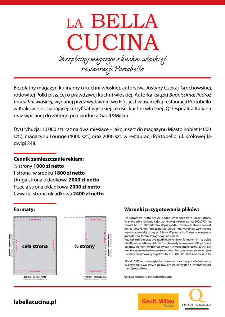 BELLA LA CUCINA Bezpłatny magazyn o kuchni włoskiej restauracji Portobello Bezpłatny magazyn kulinarny o kuchni włoskiej, autorstwa Justyny Czekaj-Grochowskiej, rodowitej Polki piszącej o prawdziwej kuchni włoskiej. Autorka książki Buonissima! Podróż po kuchni włoskiej, wydanej przez wydawnictwo Filo, jest właścicielką restauracji Portobello w Krakowie posiadającej certyfikat wysokiej jakości kuchni włoskiej „Q” Ospitalità Italiana oraz wpisanej do żółtego przewodnika Gault&Millau. Dystrybucja: 10 000 szt. raz na dwa miesiące – jako insert do magazynu Miasto Kobiet (4000 szt.), magazynu Lounge (4000 szt.) oraz 2000 szt. w restauracji Portobello, ul. Królowej Jadwigi 248. Cennik zamieszczanie reklam: ½ strony 1000 zł netto 1 strona w środku 1800 zł netto Druga strona okładkowa 2000 zł netto Trzecia strona okładkowa 2000 zł netto Czwarta strona okładkowa 2400 zł netto Formaty: Warunki przygotowania plików: margines 10mm ½ strony 275mm – format netto 281mm – format brutto margines 10mm margines 15mm cała strona margines 15mm margines 15mm 275mm – format netto 281mm – format brutto margines 15mm* Do formatów netto proszę dodać 3mm spadów z każdej strony. W przypadku reklamy całostronicowej: format netto: 200x275mm, format brutto: 206x281mm. W przypadku reklamy ½ strony: format netto: 100x275mm, format brutto: 106x281mm. Marginesy wewnętrzne w przypadku całej strony po 15mm. W przypadku ½ strony: marginesy góra/dół: po 15mm. Prawy/lewy: po 10mm. Wszystkie pliki muszą być zgodnie z wybranym formatem 1:1. W trybie CMYK bez dodatkowych kolorów. Elementy bitmapowe 300dpi. Suma kolorów elementów bitmapowych nie może przekraczać 300%. Elementy czarne nadrukowane (overprint). Fonty zamienione na krzywe. Formaty przyjmowanych plików to: PDF, TIFF, JPG (bez kompresji), EPS. Pliki do 5MB można wysyłać bezpośrednio na adres: [email protected] W przypadku większych plików proszę korzystać z internetowych transferów plików. margines 15mm margines 15mm 200mm – format netto 206mm – format brutto 100mm – format netto 106mm – format brutto labellacucina.pl *Wielkości marginesów dotyczą formatów netto