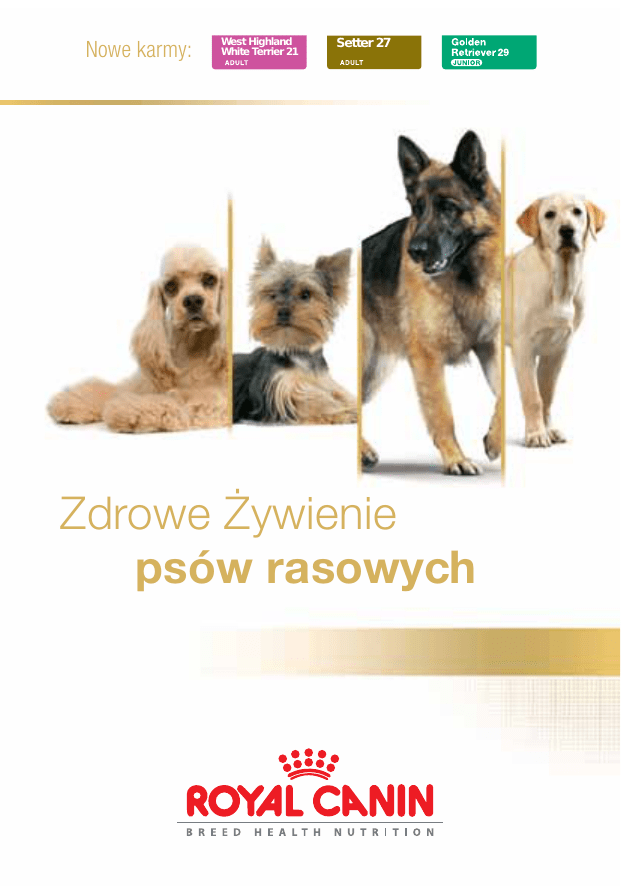Nowe karmy: West Highland White Terrier 21 Setter 27 Zdrowe Żywienie psów rasowych Unikalne doświadczenie żywieniowe Wiedza i szacunek, dewiza, która nas wyróżnia. • Od ponad 40 lat, zawsze to zwierzęta i ich potrzeby są w centrum naszych badań. • Dobrostan zwierząt: wyjściowy punkt wszelkich innowacji żywieniowych. Centrum Badań i Rozwoju, oś żywieniowej precyzji i innowacji. • W centrum pracują razem naukowcy, lekarze i dietetycy. • Zgrany zespół badawczy, gromadzący pasjonatów o zróżnicowanym podejściu do tematyki. • Niezmienny cel: opracowywanie wciąż bardziej precyzyjnych rozwiązań żywieniowych, jeszcze lepiej dostosowanych do potrzeb psów w zależności od rasy, wieku, trybu życia i poziomu aktywności. 2 Partnerstwo z profesjonalistami, nieocenione wsparcie z terenu. • Każdy nowy produkt powstaje w wyniku owocnej współpracy z profesjonalistami: hodowcami, groomerami i trenerami. • To efekt naukowej wiedzy i praktycznego doświadczenia. Pionier karm dla psów rasowych. • Rok 2002, pierwsze rozwiązanie żywieniowe opracowane dla psów rasy yorkshire terrier. • Od tego czasu, już ponad 15 ras ma specjalnie dedykowane im rozwiązania żywieniowe. Wiedza podstawą precyzji żywienia. • Odkrycie specyficznych dla rasy typów wrażliwości, znacznie bardziej istotnych niż tylko wielkość psa. • Wprowadzenie receptur karm opracowanych specjalnie według potrzeb psów wybranych ras. 3 Wynik ekspertyz technicznych: parametry krokieta. Kształt, wielkość i tekstura krokieta zostały opracowane odrębnie dla każdego z produktów linii Breed. Przykładowo: • Sprzyjanie utrzymaniu higieny jamy ustnej u yorkshire terrierów, dzięki zastosowaniu tekstury typu płatkowego. • Ułatwienie chwytania karmy psom o budowie brachycefalicznej (np. bokser), dzięki specjalnemu kształtowi krokieta. • Zmniejszenie tempa jedzenia u psów o dużym apetycie, takich jak labrador retriever. 4 Spis treści Wstęp 2 Yorkshire Terrier YORKSHIRE TERRIER ADULT / JUNIOR Jamnik DACHSHUND ADULT / JUNIOR 10 Chihuahua CHIHUAHUA 14 Shih Tzu SHIH TZU 16 Pudel POODLE 18 Cavalier King Charles Spaniel CAVALIER KING CHARLES 20 West Highland White Terrier WEST HIGHLAND WHITE TERRIER 22 Sznaucer Miniaturowy MINIATURE SCHNAUZER 24 Cocker Spaniel COCKER 26 Buldog Angielski BULLDOG 28 Seter SETTER 30 Owczarek Niemiecki GERMAN SHEPHERD ADULT / JUNIOR 32 Labrador Retriever LABRADOR RETRIEVER ADULT / JUNIOR 36 Golden Retriever GOLDEN RETRIEVER ADULT / JUNIOR 40 Bokser BOXER ADULT / JUNIOR 44 Rottweiler ROTTWEILER 48 Dog Niemiecki GREAT DANE 50 6 Zalecane dzienne dawki 52 Analizy składu 58 5 Yorkshire Terrier Użytkowy pies, który stał się luksusowym towarzyszem Na początku XIX w. przodkowie yorkshire terriera przybyli z Glasgow w Szkocji do angielskiego hrabstwa Yorkshire. Psy te kojarzono z innymi rasami, a w 1898 roku ustalono ostateczny wzorzec rasy. Pierwotnie yorkshire terriery używano do tępienia gryzoni w kopalniach, obecnie stały się cenionymi psami do towarzystwa. Dziś to najpopularniejsza rasa małych psów na świecie. Jedwabisty włos i wrażliwa skóra Jedwabista sierść yorkshire terrierów budową przypomina ludzki włos i również stale rośnie. Brak podszerstka sprawia, że skóra tych psów jest bardziej narażona na działanie czynników zewnętrznych (wahania temperatury, zanieczyszczenia) i wymaga dodatkowej ochrony. 6 Długie życie Psy rasy yorkshire terrier żyją nawet ponad 15 lat. Dlatego przez stosunkowo długi czas odczuwają efekty starzenia: schorzenia układu krążenia czy stawów. Wybredny apetyt Yorkshire terriery mają znacznie słabszy węch niż inne rasy, dlatego tak ważne jest podawanie im karmy o wysokiej smakowitości. Często też wybredny apetyt jest wynikiem rozpieszczania tych małych psów smakołykami. Silne zęby w delikatnej szczęce Tendencja do odkładania się płytki nazębnej i formowania kamienia nazębnego. 7 Yorkshire Terrier 29 Szybki wzrost JUNIOR < 10 miesiąca życia Pokrycie wysokich potrzeb pokarmowych w okresie intensywnego wzrostu, dzięki wysokiej zawartości tłuszczu oraz odpowiedniej ilości białka. Zapewnienie prawidłowego przebiegu mineralizacji szkieletu, dzięki precyzyjnym proporcjom wapnia do fosforu. Wysoka smakowitość Zaspokojenie nawet najbardziej wybrednego apetytu, dzięki unikalnej kombinacji naturalnych substancji aromatycznych. Ochrona przewodu pokarmowego Sprzyjanie prawidłowemu przebiegowi trawienia oraz zmniejszenie ilości odchodów. Wzmocnienie naturalnej odporności Pobudzenie rozwoju naturalnych mechanizmów obronnych organizmu szczenięcia. Unikalny krokiet Opakowania 0,5 kg, 1,5 kg oraz 8 kg SKŁADNIKI Suszone mięso drobiowe, ryż, mąka kukurydziana, tłuszcze zwierzęce, izolowane białka roślinne L.I.P.*, pulpa buraczana, hydrolizowane białka zwierzęce, sole mineralne, oleje roślinne (soja, ogórecznik), tran, drożdże, fruktooligosacharydy, polifosforan sodu, wyciąg z drożdży (źródło mannooligosacharydów), tauryna, DL-metionina, L-lizyna, proszek jajeczny, wyciąg z aksamitki wzniesionej (źródło luteiny). * L.I.P.- białka wyselekcjonowane pod kątem bardzo wysokiej przyswajalności 8 Piękna sierść Yorkshire Terrier 28 ADULT > 10 miesiąca życia Kombinacja działania oleju z ogórecznika i biotyny, sprzyja miękkiej i lśniącej sierści. Opatentowana formuła intensive color wzmacnia naturalne wybarwienie sierści. Zapewnienie optymalnego wzrostu włosa, dzięki precyzyjnej dawce aminokwasów siarkowych, niezbędnych do syntezy keratyny. Higiena jamy ustnej Ograniczenie powstawania kamienia nazębnego, dzięki specjalnie opracowanym krokietom oraz dodatkowi związków chelatujących (wiążących) wapń obecny w ślinie. Wysoka smakowitość Zaspokojenie nawet najbardziej wybrednego apetytu, dzięki unikalnej kombinacji naturalnych substancji aromatycznych. Opóźnianie efektów starzenia Zachowanie witalności, również u starszych