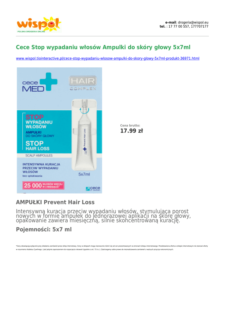 e-mail: [email protected] tel. : 17 77 00 557, 177707177 Cece Stop wypadaniu włosów Ampulki do skóry głowy 5x7ml www.wispol.tiointeractive.pl/cece-stop-wypadaniu-wlosow-ampulki-do-skory-glowy-5x7ml-produkt-36971.html Cena brutto: 17.99 zł AMPUŁKI Prevent Hair Loss Intensywna kuracja przeciw wypadaniu włosów, stymulująca porost nowych w formie ampułek do jednorazowej aplikacji na skórę głowy, opakowanie zawiera miesięczną, silnie skoncentrowaną kurację. Pojemności: 5x7 ml *Ceny obowiązują wyłącznie przy składaniu zamówień przez sklep internetowy. Ceny w sklepach mogą nieznacznie różnić się od cen prezentowanych na stronach sklepu internetowego. Przedstawiona oferta w sklepie internetowym nie stanowi oferty w rozumieniu Kodeksu Cywilnego, i jest jedynie zaproszeniem do rozpoczęcia rokowań (zgodnie z art. 71 k.c.). Zastrzegamy sobie prawo do niezrealizowania zamówień z ważnych przyczyn ekonomicznych.