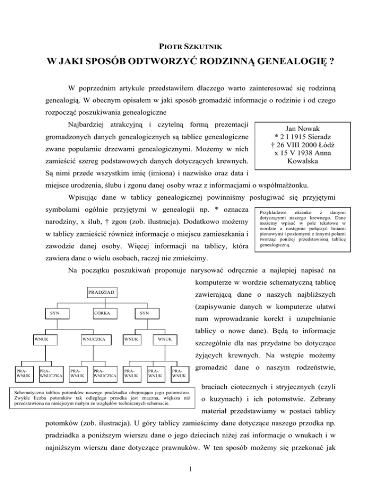 PIOTR SZKUTNIK W JAKI SPOSÓB ODTWORZYĆ RODZINNĄ GENEALOGIĘ ? W poprzednim artykule przedstawiłem dlaczego warto zainteresować się rodzinną genealogią. W obecnym opisałem w jaki sposób gromadzić informacje o rodzinie i od czego rozpocząć poszukiwania genealogiczne Najbardziej atrakcyjną i czytelną formą prezentacji gromadzonych danych genealogicznych są tablice genealogiczne zwane popularnie drzewami genealogicznymi. Możemy w nich zamieścić szereg podstawowych danych dotyczących krewnych. Jan Nowak * 2 I 1915 Sieradz † 26 VIII 2000 Łódź x 15 V 1938 Anna Kowalska Są nimi przede wszystkim imię (imiona) i nazwisko oraz data i miejsce urodzenia, ślubu i zgonu danej osoby wraz z informacjami o współmałżonku. Wpisując dane w tablicy genealogicznej powinniśmy posługiwać się przyjętymi symbolami ogólnie przyjętymi w genealogii np. * oznacza narodziny, x ślub, † zgon (zob. ilustracja). Dodatkowo możemy w tablicy zamieścić również informacje o miejscu zamieszkania i zawodzie danej osoby. Więcej informacji na tablicy, która Przykładowe okienko z danymi dotyczącymi naszego krewnego. Dane możemy wpisać w pole tekstowe w wordzie a następnie połączyć liniami pionowymi i poziomymi z innymi polami tworząc poniżej przedstawioną tablicę genealogiczną. zawiera dane o wielu osobach, raczej nie zmieścimy. Na początku poszukiwań proponuje narysować odręcznie a najlepiej napisać na komputerze w wordzie schematyczną tablicę PRADZIAD zawierającą dane o naszych najbliższych (zapisywanie danych w komputerze ułatwi SYN CÓRKA SYN nam wprowadzanie korekt i uzupełnianie tablicy o nowe dane). Będą to informacje WNUK WNUCZKA WNUK WNUK szczególnie dla nas przydatne bo dotyczące żyjących krewnych. Na wstępie możemy PRAWNUK PRAWNUCZKA PRAWNUK PRAWNUCZKA PRAWNUK PRAWNUK gromadzić dane o naszym rodzeństwie, PRAWNUK braciach ciotecznych i stryjecznych (czyli Schematyczna tablica potomków naszego pradziadka obejmująca jego potomstwo. Zwykle liczba potomków tak odległego przodka jest znaczna, większa niż przedstawiona na niniejszym małym ze względów technicznych schemacie. o kuzynach) i ich potomstwie. Zebrany materiał przedstawiamy w postaci tablicy potomków (zob. ilustracja). U góry tablicy zamieścimy dane dotyczące naszego przodka np. pradziadka a poniższym wierszu dane o jego dzieciach niżej zaś informacje o wnukach i w najniższym wierszu dane dotyczące prawnuków. W ten sposób możemy się przekonać jak 1 liczną posiadamy rodzinę. Kuzynów z którymi mamy wspólnego pradziadka a tym bardziej 2xpradziadka mogą być dziesiątki. Poszukiwania genealogiczne są zatem świetną okazją dla podtrzymania, odświeżenia czy w ogóle dla nawiązania kontaktów z dalszą rodziną. Drugą podstawową formą prezentacji danych genealogicznych jest wywód przodków. Obejmuje on tylko naszych przodków (tzw. ascendentów). PRADZIADEK PRABABCIA PRADZIADEK PRABABCIA PRADZIADEK PRABABCIA PRADZIADEK PRABABCIA By wykreślić wywód na dole strony wpisujemy w okienku nasze dane, wierszu następnie powyżej DZIADEK BABCIA DZIADEK BABCIA w dane TATA MAMA dotyczące naszych rodziców a nad nimi dane dziadków, JA wyżej zaś pradziadków itd. (zob. ilustracja). W ten sposób szybko ustalamy iż pradziadków obu płci mieliśmy aż ośmiu i jest nam wstyd że wszystkich dotąd nie znamy, a są to osoby z których krwi i kości my się zrodziliśmy! Co zatem należy zrobić? Proste, wystarczy porozmawiać z krewnymi. Punktem wyjścia dla badań genealogicznych jest zebranie informacji od najbliższych. Najlepiej zwrócić się do najstarszych członków rodziny. Informacje, które może nam przekazać krewny, dotyczą najczęściej osób jemu współczesnych, znanych osobiście, od których z kolei czerpał dane. Schematyczny wywód przodków. Najstarsi informatorzy dla dzisiejszych badaczy, to osoby urodzone zwykle ok. 1920 r. Wiedza seniorów rodów często ma charakter praktyczny i gromadzone przez nich w ciągu życia wiadomości najczęściej nie miały celu genealogicznego. Przekaz rodzinny dotyczy głównie wydarzeń z XX wieku. Wiadomości dotyczące wcześniejszych losów rodziny nieraz nieświadomie przeinaczone nie mogą zasługiwać na pełne zaufanie. Zwykle w wyniku gloryfikacji przodków, w relacji potomków stają się uczestnikami powstań narodowych lub zubożałymi szlachcicami, którzy stracili majątek. Nie należy jednak odrzucać informacji, które mogą nam się wydać mało prawdopodobne. Powinniśmy zebrać wszystkie wersje dotyczące danego wydarzenia, mimo iż mogą być one niespójne, gromadząc w ten sposób materiał do przeprowadzenia porównań. Wartościowym rdzeniem przekazów okazują się wskazówki typu geograficznego, czyli nazwy miejscowości, parafii, z których się wywodzili przodkowie. Relacjom krewnych musimy wierzyć jeśli są jedynym śladem stosunków pokrewieństwa lub pochodzenia rodziny. 2 Najczęściej jednak, dzięki zachowanym źródłom, jesteśmy w stanie zweryfikować przekaz rodzinny. Wywiady należy przeprowadzić z najstarszymi przedstawicielami rodziny bliższej i dalszej. Starszych osób nie należy zadręczać zbyt dużą ilością pytań i zrażać natarczywością w ich zadawaniu, cierpliwie natomiast wysłuchiwać opowieści nawet jeśli nas one nie interesują. Starsi zwykle pamiętają doskonale czasy swego dzieciństwa i chętnie o nich opowiadają. Umiejętne przeprowadzenie wywiadu może zaprocentować zdobyciem zaufania u naszego rozmówcy, a co za tym idzie, większego stopnia wiarygodności relacji, jego większej swobody w opowiadaniu swych i rodzinnych losów. Podczas wywiadu nie należy niczego sugerować, tak by otrzymać nieskażoną wersję wydarzeń czy punkt widzenia naszego rozmówcy. Rzetelność tych relacji możemy łatwo sprawdzić zadając po jakimś czasie podobne pytania. Powinniśmy zawsze pytać rozmówcę o źródło posiadanej przez niego wiedz