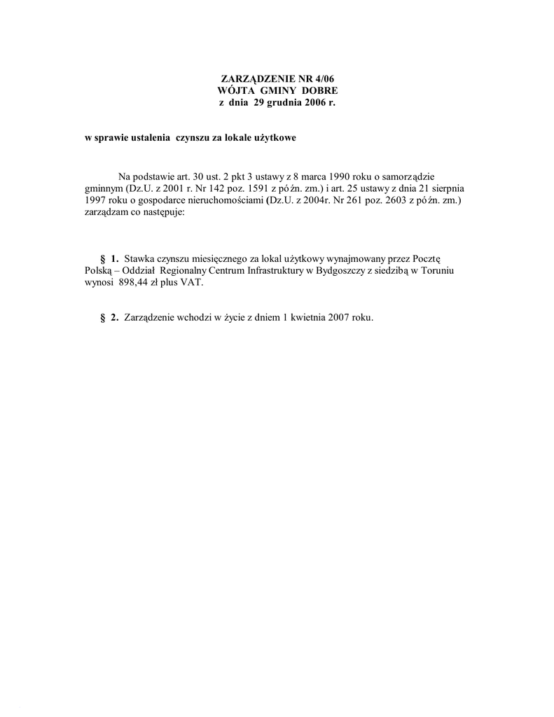 ZARZĄDZENIE NR 4/06 WÓJTA GMINY DOBRE z dnia 29 grudnia 2006 r. w sprawie ustalenia czynszu za lokale użytkowe Na podstawie art. 30 ust. 2 pkt 3 ustawy z 8 marca 1990 roku o samorządzie gminnym (Dz.U. z 2001 r. Nr 142 poz. 1591 z pó źn. zm.) i art. 25 ustawy z dnia 21 sierpnia 1997 roku o gospodarce nieruchomościami (Dz.U. z 2004r. Nr 261 poz. 2603 z pó źn. zm.) zarządzam co następuje: § 1. Stawka czynszu miesięcznego za lokal użytkowy wynajmowany przez Pocztę Polską – Oddział Regionalny Centrum Infrastruktury w Bydgoszczy z siedzibą w Toruniu wynosi 898,44 zł plus VAT. § 2. Zarządzenie wchodzi w życie z dniem 1 kwietnia 2007 roku.