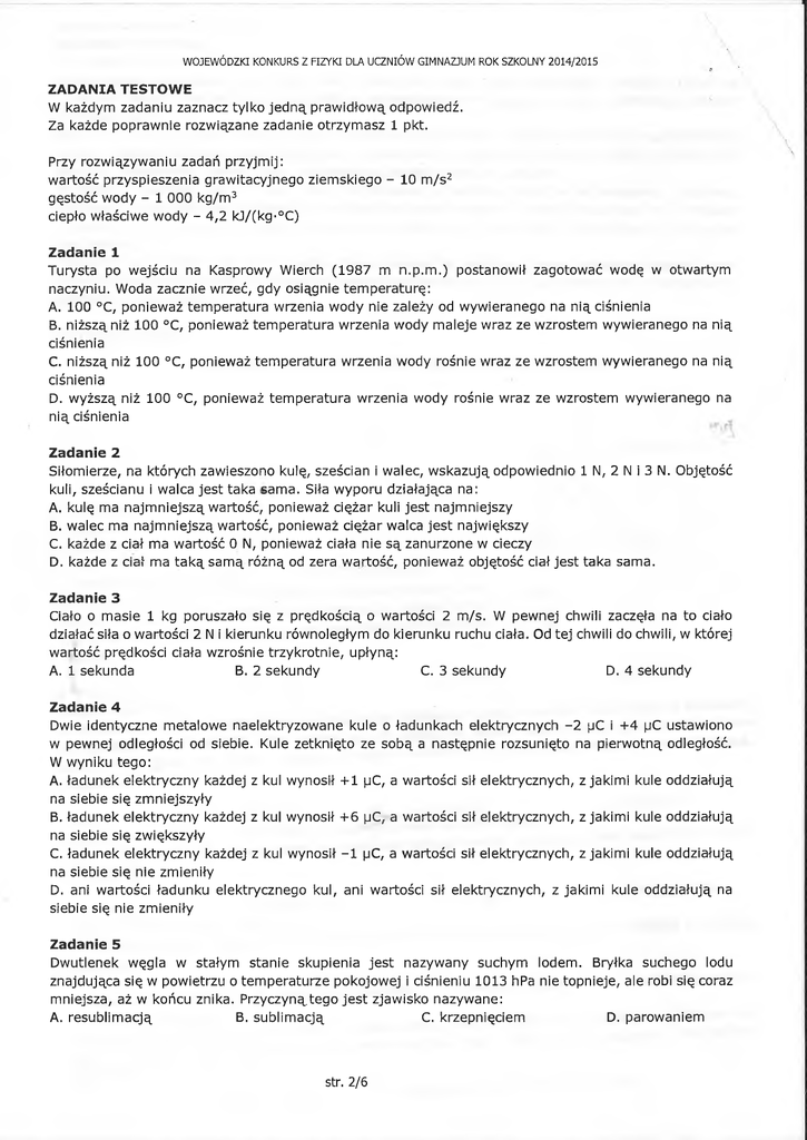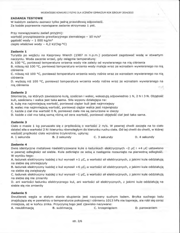 WOJEWÓDZKI KONKURS Z FIZYKI DLA UCZNIÓW GIMNAZJUM ROK SZKOLNY 2014/2015 ZADANIA TESTOW E W każdym zadaniu zaznacz tylko jedną prawidłową odpowiedź. Za każde poprawnie rozwiązane zadanie otrzymasz 1 pkt. Przy rozwiązywaniu zadań przyjm ij: wartość przyspieszenia grawitacyjnego ziemskiego - 10 m/s2 gęstość wody - 1 000 kg/m3 ciepło właściwe wody - 4,2 kJ/(kg-°C) Zadanie 1 Turysta po wejściu na Kasprowy Wierch (1987 m n .p .m .) postanowił zagotować wodę w otwartym naczyniu. Woda zacznie wrzeć, gdy osiągnie temperaturę: A. 100 °C , ponieważ temperatura wrzenia wody nie zależy od wywieranego na nią ciśnienia B. niższą niż 100 °C , ponieważ temperatura wrzenia wody maleje wraz ze wzrostem wywieranego na nią ciśnienia C. niższą niż 100 °C , ponieważ temperatura wrzenia wody rośnie wraz ze wzrostem wywieranego na nią ciśnienia D. w yższą niż 100 °C , ponieważ temperatura wrzenia wody rośnie wraz ze wzrostem wywieranego na nią ciśnienia Zadanie 2 Siłomierze, na których zawieszono kulę, sześcian i walec, w skazują odpowiednio 1 N, 2 N i 3 N. Objętość kuli, sześcianu i walca je st taka sam a. Siła wyporu działająca na: A. kulę ma najm niejszą wartość, ponieważ ciężar kuli jest najm niejszy B. walec ma najm niejszą wartość, ponieważ ciężar walca je st największy C. każde z ciał ma wartość 0 N, ponieważ ciała nie są zanurzone w cieczy D. każde z ciał ma taką sam ą różną od zera wartość, ponieważ objętość ciał jest taka sama. Zadanie 3 Ciało o masie 1 kg poruszało się z prędkością o wartości 2 m/s. W pewnej chwili zaczęła na to ciało działać siła o wartości 2 N i kierunku równoległym do kierunku ruchu ciała. Od tej chwili do chwili, w której wartość prędkości ciała wzrośnie trzykrotnie, upłyną: A. 1 sekunda B. 2 sekundy C. 3 sekundy D. 4 sekundy Zadanie 4 Dwie identyczne metalowe naelektryzowane kule o ładunkach elektrycznych -2 (j C i +4 pC ustawiono w pewnej odległości od siebie. Kule zetknięto ze sobą a następnie rozsunięto na pierwotną odległość. W wyniku tego: A. ładunek elektryczny każdej z kul wynosił +1 pC, a wartości sił elektrycznych, z jakim i kule oddziałują na siebie się zm niejszyły B. ładunek elektryczny każdej z kul wynosił +6 pC, a wartości sił elektrycznych, z jakim i kule oddziałują na siebie się zwiększyły C. ładunek elektryczny każdej z kul wynosił -1 pC, a wartości sił elektrycznych, z jakim i kule oddziałują na siebie się nie zmieniły D. ani wartości ładunku elektrycznego kul, ani wartości sił elektrycznych, z jakim i kule oddziałują na siebie się nie zmieniły Zadanie 5 Dwutlenek węgla w stałym stanie skupienia je st nazywany suchym lodem. Bryłka suchego lodu znajdująca się w powietrzu o temperaturze pokojowej i ciśnieniu 1013 hPa nie topnieje, ale robi się coraz mniejsza, aż w końcu znika. Przyczynątego je st zjawisko nazywane: A. resublimacją B. sublim acją C. krzepnięciem D. parowaniem str. 2/6 WOJEWÓDZKI KONKURS Z FIZYKI DLA UCZNIÓW GIMNAZJUM ROK SZKOLNY 2014/2015 Zadanie 6 S Hć F3 A. cztery razy większa s ss b. cztery razy m niejsza C. dwa razy większa D. dwa razy mniejsza Zadanie 7 z“ w yC ™ Lce t “ A' 54 k9/m3 2° * 10 ™ * 1 B ' 540 k9/m3 - k a z u * 54 N. Gęstość substancji, C. 27 kg/m3 D. 2 700 kg/n,3 Zadanie 8 osiągnęła wartość 20 »Ć'Początkowa te n C a tu r a wody""wynosilaokl"'''""'“ ^ bl C B - 31 °C r C.n0or C temperatUra wody D. 100 °C Zadanie 9 ■ w Z o i k s r r r E r r irn °u“ 3z i t CięŻar Wyn0Sl 500 B - 1'67 m A ' 1,35 m :e,7 ° r rii d e s k ę w S e / s t n if p L “ C. 2,70 m p o , o w i e ^ : D. 3,00 m Zadanie 10 , r — — .».«..u n y wc s y ¿die^nosci arogi od czasu dwóch ciał X i Y . Policzona dla pierwszych 3 godzin ruchu prędkość średnia ciała X w porównaniu z prędkością średnią ciała , policzoną także dla pierwszych 3 godzin ruchu, była: A. taka sama B. większa C. mniejsza D. zmienna. WOJEWÓDZKI KONKURS Z FIZYKI DLA UCZNIÓW GIMNAZJUM ROK SZKOLNY 2014/2015 ZADANIE OTW ARTE Zadanie 1 (O — 10 p.) Aby leżące na pewnym podłożu pudełko o masie 0,5 kg poruszało się po tym podłożu b e z przyspieszenia, działająca na nie siła o kierunku i zwrocie takim samym ja k kierunek i zwrot prędkości pudełka, musi a ) O b li^ T a k ą wartość musi mieć działająca na pudełko siła o kierunku i zwrocie takim samym ja k kierunek i zwrot prędkości pudełka, aby wartość prędkości pudełka w każdej sekundzie ruchu pudełka po podłożu zmieniała się o 1 m/s? Jako uzasadnienie rozwiązania podaj w odpowiednich miejscach o bliczeń (ro z w ią z a n ia ) nazwę i treść odpowiedniej zasady dynamiki Newtona. b) Oblicz wartość prędkości tego pudełka po 3 sekundzie ruchu liczonej od chwili, w której zacznie na n działać siła, o której mowa w podpunkcie a ), jeżeli wartość prędkość pudełka w ruchu bez przyspieszenia Narysuj wektory wszystkich sił działających na pudełko w obu przedstawionych sytuacjach: podczas ruchu pudełka po podłożu bez przyspieszenia i podczas ruchu z przyspieszeniem o wartości, takiej ja k w podpunkcie a ). Nazwij te siły. Obliczenia uzasadnij. M iejsce na ro z w ią za n ie i o d p o w ie d zi. KO N KU R S FIZYCZN Y ROK SZ K O LN Y 2014/2015 - ETAP SZ K O LN Y Zadania testow e. 1 Zad. C Odp. 2 D 3 B 4 5 6 7 8 9 10 A B B D A A B Z A D A N IA O TW A R TE (0 - 10 p.) a) określenie wartości siły tarcia (oporu) działającej na pudełko: siły ruch pudełka bez przyspieszenia -> Fwyp = 0 N CI I zasada dynam iki Newtona). wiadomo, że na pudełko działa siła o wartości F = 2 N równoległa do podłoża, zatem na pudełko musi działać siła tarcia (oporu) o w arto ści: Fwyp= F - T = 0 N - T = F - Fwyp = 2 N - ( W = 2N - lp k t. Zapisanie równania określającego w artość szukanej siły z uzasadnieniem , w którym znajdzie się treść II zasady dynam ik
