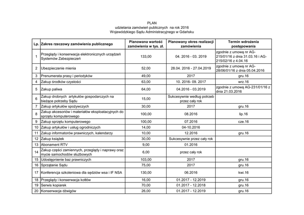 PLAN udzielania zamówień publicznych na rok 2016 Wojewódzkiego Sądu Administracyjnego w Gdańsku Lp. Zakres rzeczowy zamówienia publicznego Planowana wartość zamówienia w tys. zł. Planowany okres realizacji zamówienia 1 Przeglądy i konserwacja elektronicznych urządzeń Systemów Zabezpieczeń 133,00 04. 2016 - 03. 2019 2 Ubezpieczenie mienia 52,00 28.04. 2016 - 27.04.2019 3 Prenumerata prasy i periodyków 49,00 2017 4 Zakup środków czystości 63,00 10. 2016- 09. 2017 5 Zakup paliwa 64,00 04.2016 - 03.2019 zgodnie z umową nr AG215/01/16 z dnia 31.03.16 i AG215/02/16 z 4.04.16 zgodnie z umową nr AG28/06/01/16 z dnia 05.04.2016 gru.16 wrz.16 zgodnie z umową AG-231/01/16 z dnia 21.03.2016 30,00 Sukcesywnie według potrzeb przez cały rok 2017 gru.16 100,00 08.2016 lip.16 100,00 07.2016 cze.16 10 Zakup artykułów i usług ogrodniczych 14,00 04-10.2016 11 Zakup informatorów prawniczych, kalendarzy 10,00 12.2016 12 Zakup książek 30,00 Sukcesywnie przez cały rok 13 Abonament RTV Zakup części zamiennych, przeglądy i naprawy oraz 14 mycie samochodów służbowych 15 Udostępnienie baz prawniczych 9,00 01.2016 6,00 przez cały rok 103,00 2017 gru.16 16 Sprzątanie Sądu 75,00 2017 gru.16 17 Konferencja szkoleniowa dla sędziów wsa i IF NSA 130,00 06.2016 kwi.16 18 Przeglądy i konserwacja kotłów 19 Serwis kopiarek 16,00 70,00 01.2017 - 12.2019 01.2017 - 12.2018 gru.16 gru.16 20 Konserwacja dźwigów 26,00 01.2017 - 12.2019 gru.16 6 7 8 9 Zakup drobnych artykułów gospodarczych na bieżące potrzeby Sądu Zakup artykułów spożywczych Zakup akcesoriów i materiałów eksploatacyjnych do sprzętu komputerowego Zakup sprzętu komputerowego Termin wdrożenia postępowania 15,00 gru.16 PLAN udzielania zamówień publicznych na rok 2016 Wojewódzkiego Sądu Administracyjnego w Gdańsku Planowana wartość zamówienia w tys. zł. Planowany okres realizacji zamówienia Termin wdrożenia postępowania 21 zakup, dostawa i montaż mebli biurowych 22 Zakup materiałów biurowych 23 Usuwanie i wywóz śniegu 35,00 82,00 10,00 07.2016 09.2016 - 08.2017 11-12.2016 maj.16 sie.16 24 Obsługa serwisowa urządzeń chłodniczych 17,00 01.2017 - 12.2019 gru.16 25 Zakup usług zdrowotnych 33,00 07.2017 - 06.2019 cze.16 26 Prowadzenie archiwum i oprawa introligatorska 80,00 01.2017 - 12.2018 gru.16 Zakup opakowań kartonowych na potrzeby archiwum 2,00 09.2016 wrz.16 6,00 11.2016 lis.16 7,00 11-12.2016 lis.16 30 Zakup usług dostępu do sieci internet 37,00 10.2016 -10.2019 wrz.16 31 Zakup systemu do tworzenia kopii zapasowych 40,00 06.2016 cze.16 32 Zakup 5 kserokopiarek 42,00 05.2016 kwi.16 Lp. Zakres rzeczowy zamówienia publicznego 27 28 Czyszczenie rynien i rur spustowych 29 Czyszczenie kanalizacji sanitarnej, deszczowej oraz separatorów Remont budynku 16/17, budynku 21, naprawy 33 samochodów służbowych i urządzeń 420,00 przez cały rok 34 Szkolenia sędziów (wyjazdowe) i pracowników 53,00 sukcesywnie wg potrzeb przez cały rok zgodnie z wdrożonymi procedurami zamówień (przetarg nieograniczony, zamówienia podprogowe) Gdańsk, dnia 15.04.2016 AKCEPTUJĘ POD WZGLĘDEM FINANSOWYM ZATWIERDZAM
