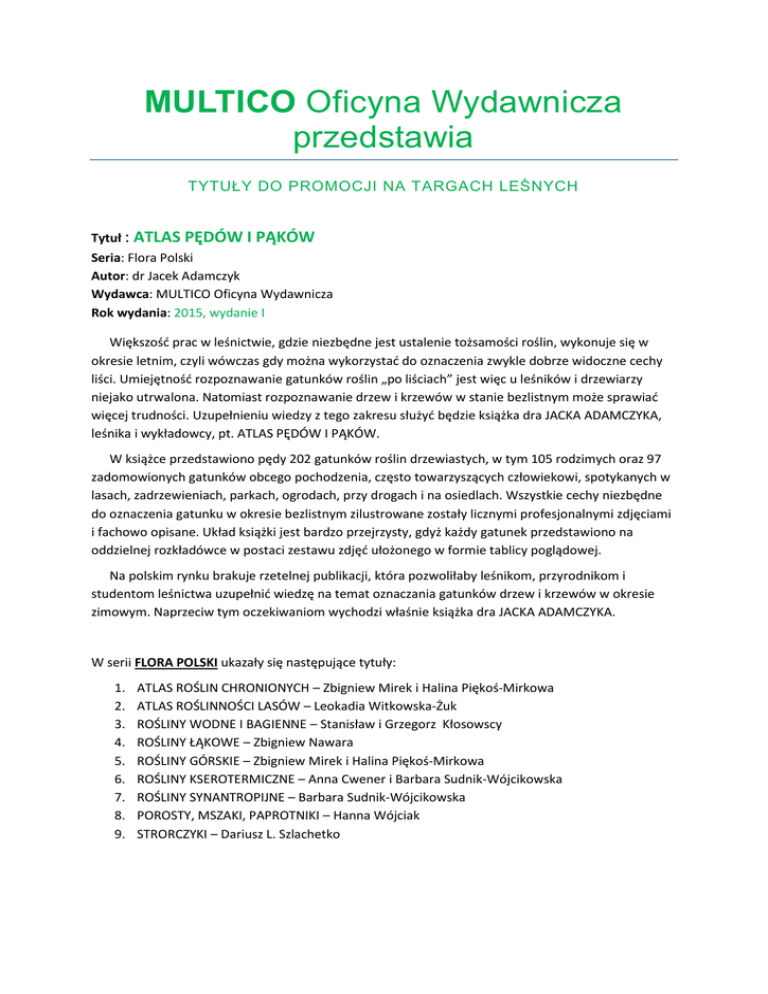 MULTICO Oficyna Wydawnicza przedstawia TYTUŁY DO PROMOCJI NA TARGACH LEŚNYCH Tytuł : ATLAS PĘDÓW I PĄKÓW Seria: Flora Polski Autor: dr Jacek Adamczyk Wydawca: MULTICO Oficyna Wydawnicza Rok wydania: 2015, wydanie I Większość prac w leśnictwie, gdzie niezbędne jest ustalenie tożsamości roślin, wykonuje się w okresie letnim, czyli wówczas gdy można wykorzystać do oznaczenia zwykle dobrze widoczne cechy liści. Umiejętność rozpoznawanie gatunków roślin „po liściach” jest więc u leśników i drzewiarzy niejako utrwalona. Natomiast rozpoznawanie drzew i krzewów w stanie bezlistnym może sprawiać więcej trudności. Uzupełnieniu wiedzy z tego zakresu służyć będzie książka dra JACKA ADAMCZYKA, leśnika i wykładowcy, pt. ATLAS PĘDÓW I PĄKÓW. W książce przedstawiono pędy 202 gatunków roślin drzewiastych, w tym 105 rodzimych oraz 97 zadomowionych gatunków obcego pochodzenia, często towarzyszących człowiekowi, spotykanych w lasach, zadrzewieniach, parkach, ogrodach, przy drogach i na osiedlach. Wszystkie cechy niezbędne do oznaczenia gatunku w okresie bezlistnym zilustrowane zostały licznymi profesjonalnymi zdjęciami i fachowo opisane. Układ książki jest bardzo przejrzysty, gdyż każdy gatunek przedstawiono na oddzielnej rozkładówce w postaci zestawu zdjęć ułożonego w formie tablicy poglądowej. Na polskim rynku brakuje rzetelnej publikacji, która pozwoliłaby leśnikom, przyrodnikom i studentom leśnictwa uzupełnić wiedzę na temat oznaczania gatunków drzew i krzewów w okresie zimowym. Naprzeciw tym oczekiwaniom wychodzi właśnie książka dra JACKA ADAMCZYKA. W serii FLORA POLSKI ukazały się następujące tytuły: 1. 2. 3. 4. 5. 6. 7. 8. 9. ATLAS ROŚLIN CHRONIONYCH – Zbigniew Mirek i Halina Piękoś-Mirkowa ATLAS ROŚLINNOŚCI LASÓW – Leokadia Witkowska-Żuk ROŚLINY WODNE I BAGIENNE – Stanisław i Grzegorz Kłosowscy ROŚLINY ŁĄKOWE – Zbigniew Nawara ROŚLINY GÓRSKIE – Zbigniew Mirek i Halina Piękoś-Mirkowa ROŚLINY KSEROTERMICZNE – Anna Cwener i Barbara Sudnik-Wójcikowska ROŚLINY SYNANTROPIJNE – Barbara Sudnik-Wójcikowska POROSTY, MSZAKI, PAPROTNIKI – Hanna Wójciak STRORCZYKI – Dariusz L. Szlachetko Tytuł : WOJCIECH GIL OPOWIADA O LESIE Seria: Opowiada o… Autor: Wojciech Gil Wydawca: MULTICO Oficyna Wydawnicza Rok wydania: 2015, wydanie I Las jest najbogatszym lądowym środowiskiem przyrodniczym, domem wielu zwierząt i roślin, fabryką tlenu, dawcą wielu dóbr niezbędnych nam do życia. Długo można by wyliczać jego zalety i rozmaite funkcje, a na pewno trudno wyobrazić sobie funkcjonowanie cywilizacji ludzkiej bez lasu. Ta opowieść jest przeznaczona przede wszystkim dla młodych ludzi –pasjonatów leśnej przyrody, ale także dla miłośników grzybów, ptaków i leśnych roślin, jak i dla osób, które swoją przygodę z lasem chcą dopiero rozpocząć. Mam nadzieję, że wiedza, którą starałem się tu przekazać pozwoli spojrzeć na las i pracę leśników ze zrozumieniem i rozbudzi pragnienie dalszego poznawania tego wspaniałego fragmentu naszej rodzimej przyrody. Pięknie i bogato ilustrowana książka dla całej rodziny sprawi przyjemność dzieciom, ale także dorosłym, którzy chcą przypomnieć sobie i uporządkować wiedzę o lesie. Tytuł : ŻYCIE LASU Seria: album leśny Autorzy zdjęć: LEŚNICY, scenariusz i sławo wiążące: dr Marek Sławski Wydawca: MULTICO Oficyna Wydawnicza Rok wydania: 2015, wydanie I Czy można stworzyć książkę, która opowie o życiu lasu, a nie będzie zwykłym podręcznikiem ekologii? O pomoc poprosiliśmy tych, którzy są lasu najbliżej – leśników. W codziennej pracy wykorzystują znajomość zasad, które żądzą życiem lasu. Codziennie patrzą, jak las zmienia się wraz z porami roku i upływem lat. Poprosiliśmy, by opowiedzieli o lesie nie za pomocą słów, ale fotografii, które najlepiej oddają jego piękno. Chcemy pokazać tę książkę wszystkim kochającym leśną przyrodę. Jest ona owocem wiedzy i wrażliwości leśników, którzy troszczą się o las – nasze wspólne dziedzictwo. Album „ŻYCIE LASU” składa się z następujących części: Ziemia, Woda, Powietrze, Ogień, Drzewo, Granice, Cykl, Powiązania, Krążenie materii, Dom. Każda z nich jest ilustrowana kilkunastoma zdjęciami starannie wybranymi spośród kilkunastu tysięcy zdjęć. Wysoki poziom nadesłanych fotografii sprawił poważny kłopot przy wyborze. Tu naprawdę „od przybytku głowa boli”. Świadczy to o wielkim zaangażowaniu leśników, którzy umieją dostrzec w swej codziennej pracy jej niecodzienną niezwykłość.