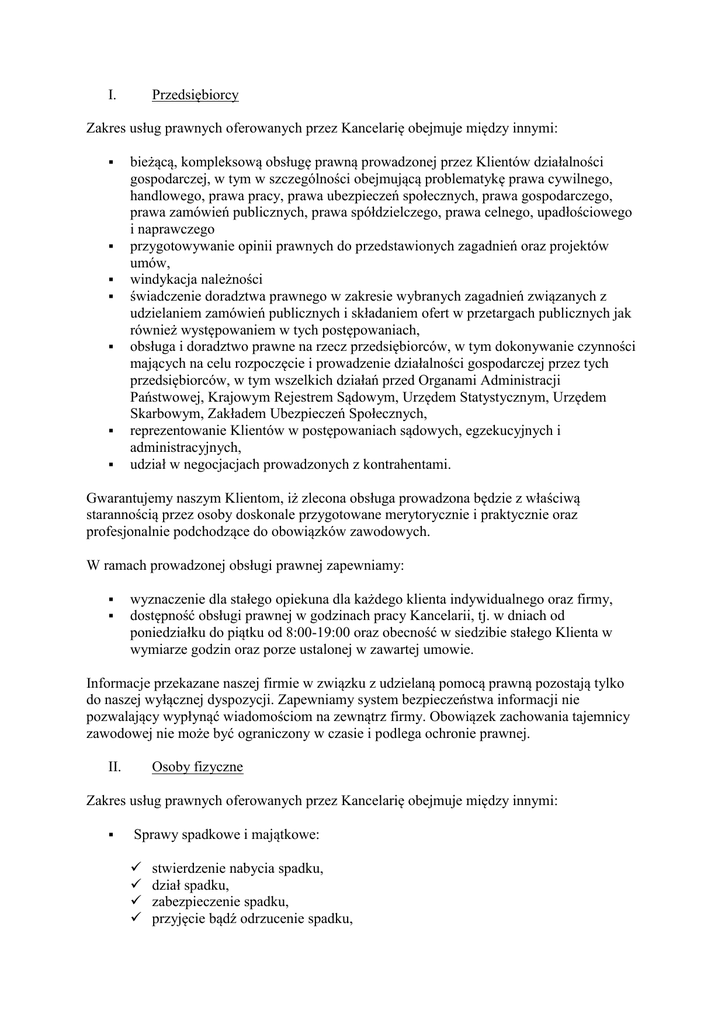 Przedsiębiorcy I. Zakres usług prawnych oferowanych przez Kancelarię obejmuje między innymi: bieżącą, kompleksową obsługę prawną prowadzonej przez Klientów działalności gospodarczej, w tym w szczególności obejmującą problematykę prawa cywilnego, handlowego, prawa pracy, prawa ubezpieczeń społecznych, prawa gospodarczego, prawa zamówień publicznych, prawa spółdzielczego, prawa celnego, upadłościowego i naprawczego przygotowywanie opinii prawnych do przedstawionych zagadnień oraz projektów umów, windykacja należności świadczenie doradztwa prawnego w zakresie wybranych zagadnień związanych z udzielaniem zamówień publicznych i składaniem ofert w przetargach publicznych jak również występowaniem w tych postępowaniach, obsługa i doradztwo prawne na rzecz przedsiębiorców, w tym dokonywanie czynności mających na celu rozpoczęcie i prowadzenie działalności gospodarczej przez tych przedsiębiorców, w tym wszelkich działań przed Organami Administracji Państwowej, Krajowym Rejestrem Sądowym, Urzędem Statystycznym, Urzędem Skarbowym, Zakładem Ubezpieczeń Społecznych, reprezentowanie Klientów w postępowaniach sądowych, egzekucyjnych i administracyjnych, udział w negocjacjach prowadzonych z kontrahentami. Gwarantujemy naszym Klientom, iż zlecona obsługa prowadzona będzie z właściwą starannością przez osoby doskonale przygotowane merytorycznie i praktycznie oraz profesjonalnie podchodzące do obowiązków zawodowych. W ramach prowadzonej obsługi prawnej zapewniamy: wyznaczenie dla stałego opiekuna dla każdego klienta indywidualnego oraz firmy, dostępność obsługi prawnej w godzinach pracy Kancelarii, tj. w dniach od poniedziałku do piątku od 8:00-19:00 oraz obecność w siedzibie stałego Klienta w wymiarze godzin oraz porze ustalonej w zawartej umowie. Informacje przekazane naszej firmie w związku z udzielaną pomocą prawną pozostają tylko do naszej wyłącznej dyspozycji. Zapewniamy system bezpieczeństwa informacji nie pozwalający wypłynąć wiadomościom na zewnątrz firmy. Obowiązek zachowania tajemnicy zawodowej nie może być ograniczony w czasie i podlega ochronie prawnej. II. Osoby fizyczne Zakres usług prawnych oferowanych przez Kancelarię obejmuje między innymi: Sprawy spadkowe i majątkowe: stwierdzenie nabycia spadku, dział spadku, zabezpieczenie spadku, przyjęcie bądź odrzucenie spadku, stwierdzenie nieważności testamentu, sporządzanie testamentów, wydziedziczanie, dochodzenie zachowku, dochodzenie wykonania zapisów, poleceń, dochodzenie uznania spadkobierców i zapisobierców za niegodnych dziedziczenia, podział majątku, zniesienie współwłasności, cofnięcie darowizny, rozwiązanie dożywocia, Sprawy z zakresu ochrony dóbr osobistych, Dochodzenie odszkodowań: Sprawy z zakresu prawa rodzinnego: szkody na osobie (urazy, uszkodzenia ciała, cierpienia psychiczne, śmierć osoby bliskiej w wypadku), odszkodowanie i zadośćuczynienie, szkody na mieniu, wypadki komunikacyjne, wypadek przy pracy, wypadek w rolnictwie, błędy lekarskie, roszczenia od Skarbu Państwa, waloryzacja polis z lat 80tych (posagowych, na życie) rozwód, separacja, alimenty, sprawy dotyczące władzy rodzicielskiej, sprawy dotyczące kontaktów z małoletnimi, unieważnienie małżeństwa, zaprzeczenie i ustalenie ojcostwa, rozdzielność majątkowa, podział majątku wspólnego (w tym także osób żyjących w konkubinacie), Sprawy dotyczące nieruchomości: ustanowienie służebności drogi koniecznej, ustanowienie służebności, w tym służebności przesyłu, zasiedzenie nieruchomości, uwłaszczenie, rozgraniczenie, ochrona własności, ochrona posiadania, sprawy o wynagrodzenie za korzystanie z nieruchomości, sprawy o kwestionowanie zasadności zmiany wysokości opłat za użytkowanie wieczyste, wnioski o wpisy do ksiąg wieczystych, obsługa prawna transakcji sprzedaży nieruchomości, Sprawy z zakresu prawa pracy i ubezpieczeń społecznych: sprawy o zapłatę wynagrodzenia, odprawy, ekwiwalentu za urlop, sprawy o odszkodowanie za niezgodne z prawem rozwiązanie stosunku pracy, mobbing, sprawy o przywrócenie do pracy, sprawy o ustalenie istnienia stosunku pracy, sprawy o odszkodowanie z tytułu wypadku przy pracy, doradztwo oraz reprezentowanie pracowników i pracodawców we wzajemnych sporach, negocjacje związkowe, przygotowywanie i opiniowanie aktów prawnych z zakresu prawa pracy (regulaminów, zarządzeń, pism, umów o pracę, o zakazie konkurencji, kontraktów menedżerskich): odwołania od decyzji ZUS i KRUS w sprawach rent, emerytur, świadczeń przedemerytalnych, o uwzględnienie okresów pracy w warunkach szczególnych. Sprawy z zakresu prawa administracyjnego prawo budowlane – wnioski, zgłoszenia, pozwolenia, odwołania od decyzji, reprezentowanie w postępowaniu administracyjnym, prawo ochrony środowiska, prawo wodne, inne dziedziny prawa administracyjnego, ochrona własności intelektualnej i przemysłowej, reprezentacja przez organami administracji państwowej i sądami administracyjnymi, sporządzanie skarg i odwołań, Sprawy z zakresu prawa spółdzielczego i mieszkaniowego spółdzielcze lokatorskie prawo do lokalu mieszkalnego, spółdzielcze własnościowe prawo do lokalu mieszkalnego, ustanowienie odrębnej własności lokalu, sprawy o eksmisję, sprawy o zapłatę czynszu, sprawy o zameldowanie i wymeldowanie, sprawy o wstąpienie w stosunek najmu, sprawy o nakazanie spółdzielni złożenia oświadczenia woli o przekształceniu spółdzielczego prawa do lokalu w prawo odrębnej własności. zaskarżanie uchwał wspólnot mieszkaniowych i spółdzielni, udział z głosem doradczym w zgromadzeniach właścicieli, walnych zgromadzeniach członków, doradztwo prawne przy kupnie i sprzedaży nieruchomości - analiza umów ze spółdzielniami i deweloperami. Sprawy z zakresu prawa karnego i wykroczeniowego: sprawy z oskarżenia prywatnego, reprezentacja pokrzywdzonego, występowan