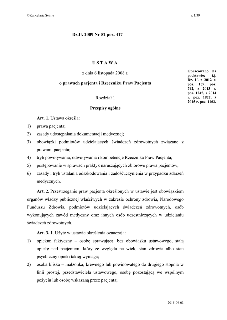 ©Kancelaria Sejmu s. 1/39 Dz.U. 2009 Nr 52 poz. 417 USTAWA Opracowano na podstawie: t.j. Dz. U. z 2012 r. poz. 159, poz. 742, z 2013 r. poz. 1245, z 2014 r. poz. 1822, z 2015 r. poz. 1163. z dnia 6 listopada 2008 r. o prawach pacjenta i Rzeczniku Praw Pacjenta Rozdział 1 Przepisy ogólne Art. 1. Ustawa określa: 1) prawa pacjenta; 2) zasady udostępniania dokumentacji medycznej; 3) obowiązki podmiotów udzielających świadczeń zdrowotnych związane z prawami pacjenta; 4) tryb powoływania, odwoływania i kompetencje Rzecznika Praw Pacjenta; 5) postępowanie w sprawach praktyk naruszających zbiorowe prawa pacjentów; 6) zasady i tryb ustalania odszkodowania i zadośćuczynienia w przypadku zdarzeń medycznych. Art. 2. Przestrzeganie praw pacjenta określonych w ustawie jest obowiązkiem organów władzy publicznej właściwych w zakresie ochrony zdrowia, Narodowego Funduszu Zdrowia, podmiotów udzielających świadczeń zdrowotnych, osób wykonujących zawód medyczny oraz innych osób uczestniczących w udzielaniu świadczeń zdrowotnych. Art. 3. 1. Użyte w ustawie określenia oznaczają: 1) opiekun faktyczny – osobę sprawującą, bez obowiązku ustawowego, stałą opiekę nad pacjentem, który ze względu na wiek, stan zdrowia albo stan psychiczny opieki takiej wymaga; 2) osoba bliska – małżonka, krewnego lub powinowatego do drugiego stopnia w linii prostej, przedstawiciela ustawowego, osobę pozostającą we wspólnym pożyciu lub osobę wskazaną przez pacjenta; 2015-09-03 ©Kancelaria Sejmu 3) s. 2/39 osoba wykonująca zawód medyczny – osobę wykonującą zawód medyczny, o której mowa w art. 2 ust. 1 pkt 2 ustawy z dnia 15 kwietnia 2011 r. o działalności leczniczej (Dz. U. Nr 112, poz. 654, Nr 149, poz. 887, Nr 174, poz. 1039 i Nr 185, poz. 1092); 4) pacjent – osobę zwracającą się o udzielenie świadczeń zdrowotnych lub korzystającą ze świadczeń zdrowotnych udzielanych przez podmiot udzielający świadczeń zdrowotnych lub osobę wykonującą zawód medyczny; 5) podmiot udzielający świadczeń zdrowotnych – podmiot wykonujący działalność leczniczą, o którym mowa w art. 2 ust. 1 pkt 5 ustawy z dnia 15 kwietnia 2011 r. o działalności leczniczej; 6) świadczenie zdrowotne – świadczenie zdrowotne, o którym mowa w art. 2 ust. 1 pkt 10 ustawy z dnia 15 kwietnia 2011 r. o działalności leczniczej; 7) (uchylony). 2. Ilekroć w ustawie jest mowa o lekarzu, rozumie się przez to także lekarza dentystę oraz felczera w zakresie wynikającym z przepisów o zawodzie felczera. Art. 4. 1. W razie zawinionego naruszenia praw pacjenta sąd może przyznać poszkodowanemu odpowiednią sumę tytułem zadośćuczynienia pieniężnego za doznaną krzywdę na podstawie art. 448 Kodeksu cywilnego. 2. W razie zawinionego naruszenia prawa pacjenta do umierania w spokoju i godności sąd może, na żądanie małżonka, krewnych lub powinowatych do drugiego stopnia w linii prostej lub przedstawiciela ustawowego, zasądzić odpowiednią sumę pieniężną na wskazany przez nich cel społeczny na podstawie art. 448 Kodeksu cywilnego. 3. Przepisu ust. 1 nie stosuje się do zawinionego naruszenia prawa pacjenta do: 1) przechowywania rzeczy wartościowych w depozycie podmiotu leczniczego wykonującego działalność leczniczą w rodzaju stacjonarne i całodobowe świadczenia zdrowotne; 2) informacji o rodzaju i zakresie świadczeń zdrowotnych udzielanych przez podmioty udzielające świadczeń zdrowotnych; 3) dostępu do dokumentacji medycznej dotyczącej jego stanu zdrowia; 4) zgłaszania działań niepożądanych produktów leczniczych. 2015-09-03 ©Kancelaria Sejmu s. 3/39 Art. 5. Kierownik podmiotu udzielającego świadczeń zdrowotnych lub upoważniony przez niego lekarz może ograniczyć korzystanie z praw pacjenta w przypadku wystąpienia zagrożenia epidemicznego lub ze względu na bezpieczeństwo zdrowotne pacjentów, a w przypadku praw, o których mowa w art. 33 ust. 1, także ze względu na możliwości organizacyjne podmiotu. Rozdział 2 Prawo pacjenta do świadczeń zdrowotnych Art. 6. 1. Pacjent ma prawo do świadczeń zdrowotnych odpowiadających wymaganiom aktualnej wiedzy medycznej. 2. Pacjent ma prawo, w sytuacji ograniczonych możliwości udzielenia odpowiednich świadczeń zdrowotnych, do przejrzystej, obiektywnej, opartej na kryteriach medycznych, procedury ustalającej kolejność dostępu do tych świadczeń. 3. Pacjent ma prawo żądać, aby udzielający mu świadczeń zdrowotnych: 1) lekarz zasięgnął opinii innego lekarza lub zwołał konsylium lekarskie; 2) pielęgniarka (położna) zasięgnęła opinii innej pielęgniarki (położnej). 4. Lekarz może odmówić zwołania konsylium lekarskiego lub zasięgnięcia opinii innego lekarza, jeżeli uzna, że żądanie, o którym mowa w ust. 3, jest bezzasadne. 5. Żądanie, o którym mowa w ust. 3, oraz odmowę, o której mowa w ust. 4, odnotowuje się w dokumentacji medycznej. 6. Przepisy ust. 4 i 5 stosuje się do pielęgniarki (położnej) w zakresie zasięgania opinii innej pielęgniarki (położnej). Art. 7. 1. Pacjent ma prawo do natychmiastowego udzielenia świadczeń zdrowotnych ze względu na zagrożenie zdrowia lub życia. 2. W przypadku porodu pacjentka ma prawo do uzyskania świadczeń zdrowotnych związanych z porodem. Art. 8. Pacjent ma prawo do świadczeń zdrowotnych udzielanych z należytą starannością przez podmioty udzielające świadczeń zdrowotnych w warunkach odpowiadających określonym w odrębnych przepisach wymaganiom fachowym i sanitarnym. Przy udzielaniu świadczeń zdrowotnych osoby wykonujące zawód medyczny kierują się zasadami etyki zawodowej określonymi przez właściwe samorządy zawodów medycznych. 2015-09-03 ©Kancelaria Sejmu s. 4/39 Rozdział 3 Prawo pacjenta do informacji Art. 9. 1. Pacjent ma prawo do informacji o swoim stanie zdrowia. 2. Pacjent, w tym małoletni, który ukończył 16 lat, lub jego ustawowy przedstawiciel mają prawo do uzyskani
