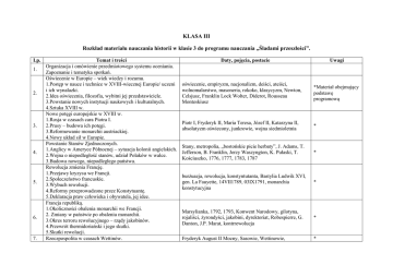 KLASA III Rozkład materiału nauczania historii w klasie 3 do programu nauczania „Śladami przeszłości”. Lp. 1. 2. 3. 4. 5. 6. 7. Temat i treści Organizacja i omówienie przedmiotowego systemu oceniania. Zapoznanie i tematyka spotkań. Oświecenie w Europie – wiek wiedzy i rozumu. 1.Postęp w nauce i technice w XVIII-wiecznej Europie/ uczeni i ich wynalazki. 2.Idea oświecenia, filozofia, wybitni jej przedstawiciele. 3.Powstanie nowych instytucji naukowych i kulturalnych. 4.Sztuka XVIII w. Nowe potęgi europejskie w XVIII w. 1.Rosja w czasach cara Piotra I. 2.Prusy – budowa ich potęgi. 3.Reformowanie monarchii austriackiej. 4.Nowy układ sił w Europie. Powstanie Stanów Zjednoczonych. 1.Anglicy w Ameryce Północnej – sytuacja kolonii angielskich. 2.Wojna o niepodległość stanów, udział Polaków w walce. 3.Budowa nowego, niepodległego państwa. Rewolucja zmienia Francję. 1.Przejawy kryzysu we Francji. 2.Społeczeństwo francuskie. 3.Wybuch rewolucji. 4.Reformy przeprowadzone przez Konstytuantę. 5.Deklaracja praw człowieka i obywatela, jej idee. Francja republiką. 1.Okoliczności obalenia monarchii we Francji. 2. Zmiany w państwie po obaleniu monarchii. 3.Okres terroru rewolucyjnego – rządy jakobinów. 4.Przewrót thermidoriański i jego skutki. 5.Skutki rewolucji. Rzeczpospolita w czasach Wettinów. Daty, pojęcia, postacie Uwagi oświecenie, empiryzm, nacjonalizm, deiści, ateiści, wolnomalarstwo, masoneria, rokoko, klasycyzm, Newton, Celsjusz, Franklin Lock Wolter, Diderot, Rousseau Monteskiusz *Materiał obejmujący podstawę programową Piotr I, Fryderyk II, Maria Teresa, Józef II, Katarzyna II, absolutyzm oświecony, junkrowie, wojna siedmioletnia * Stany, metropolia, „bostońskie picie herbaty”, J. Adams, T. Jefferson, B. Franklin, Jerzy Waszyngton, K. Pułaski, T. Kościuszko, 1776, 1777, 1783, 1787 * burżuazja, rewolucja, konstyntutanta, Bastylia Ludwik XVI, gen. La Fauyette, 14VII1789, 03IX1791, monarchia konstytucyjna * Marsylianka, 1792, 1793, Konwent Narodowy, gilotyna, rojaliści, żyrondyści, jakobini, dyrektoriat, Robespierre, G. Danton, J.P. Marat, kontrrewolucja * Fryderyk August II Mocny, Sasowie, Wettinowie, * 8. 9. 10. 11. 12. 1.Nowa unia personalna. 2.Wojna północna i jej skutki. 3.August III Sas i jego rządy w Rzeczypospolitej. 4.Skutki Unii polsko-saskiej. Stanisław August Poniatowski ostatnim królem elekcyjnym. 1.Elekcja króla. 2.Początek rządów Poniatowskiego. 3.Konfederacja barska, okoliczności jej zawiązania. 4.Przyczyny i skutki I rozbioru Polski. 5.”Kołacz królewski”, słynna rycina związana z I rozbiorem. Oświecenie w Rzeczypospolitej. 1.Ożywienie gospodarcze i kulturalne na ziemiach polskich za panowania Augusta III. 2.Reformy w szkolnictwie w XVIII-wiecznej Rzeczpospolitej. 3.Zasługi króla Poniatowskiego dla rozwoju polskiego oświecenia. 4.Sztuka. Sejm Wielki. 1.Okoliczności zwołania Sejmu. 2.Główne stronnictwa. 3.Reformy sejmu wielkiego. 4.Wojna w obronie Konstytucji 3 Maja – II rozbiór Polski. Ostatnie próby ratowania Rzeczypospolitej – Powstanie Kościuszkowskie. 1.Przyczyny wybuchu insurekcji. 2.Pierwsze sukcesy powstańców. 3.Uniwersał Połaniecki. 4.Upadek powstania. 5.III rozbiór Rzeczypospolitej. Pierwsze Konstytucje. 1.Konstytucja ustawą zasadniczą. 2.Konstytucja Stanów Zjednoczonych. 3.Pierwsza ustawa zasadnicza w Europie - Polska Konstytucja 3 Maja – nadzieje Polaków związane z tą Konstytucją. 4.Konstytucja Francji. konfederacja, podwójna elekcja, Stanisław Leszczyński, Sejm Niemy, Sejm Pacyfikacyjny, August III Sas, Order Orła Białego, 1699, 1709, 1717, 1721, 1705 Familia, sejm konwokacyjny, konfederacja, dysydenci, prawa kardynalne, ryngraf, Rada Nieustająca, Komisja Edukacji Narodowej, Branicki, Rzewuski, Szczęsny Potocki, Beniowski, Rejtan, 1772, 1768, 1773, 1764 * Collegium Nobilium, Szkoła Rycerska, KEN, Towarzystwo do Ksiąg Elementarnych, obiady czwartkowe, oświecenie stanisławowskie, Monitor, Konarski, Andrzej Zamoyski, Franciszek Bohomolec, Stanisław Staszic, Grzegorz Piramowicz, I. Krasicki, A. Naruszewicz, H. Kołłątaj, W. Bogusławski, F. Zabłocki, J.U. Niemcewicz, Canaletto, M. Bacciarelli, D. Merlini * Sejm Wielki, czarna procesja, konstytucja, Virtutti Militari, 1788, 03V1791, 1792, 1793, Małachowski, J. Poniatowski, T. Kościuszko, H. Kołłątaj, J.Dekert * insurekcja, Kościuszko, J. Kiliński, J. Jasiński, uniwersał, „Panorama Racławicka”, 24III1794, 04IV1794, 07V1794, 25XI1795, 03I1795 * Monteskiusz, J. Waszyngton, B. Franklin, H.Kołłątaj, S. Małachowki, konstytucja, 17IX1787, 03V1791, 03IX1791 * 13. 14. 15. 16. 17. 18. 19. 5.Podobieństwa i różnice między tymi konstytucjami. Rzeczpospolita XVIII wieku na tle wielkich zmian w Europie i na kontynencie amerykańskim – podsumowanie wiadomości. Rzeczpospolita XVIII wieku na tle wielkich zmian w Europie i na kontynencie amerykańskim – sprawdzian wiadomości. Europa w blasku Napoleona. 1.Przejęcie władzy we Francji przez Napoleona. 2.System napoleoński. 3.Ekspansja napoleońskiej Francji. 4.Armia napoleońska. 5.Wojna z Rosją i upadek Napoleona. Polacy pod napoleońską gwiazdą. 1.Polacy na emigracji. 2.Legiony polskie, szlak bojowy. 3.”Mazurek Dąbrowskiego”. 4.Utworzenie Księstwa Warszawskiego – jego ustrój, gospodarka, okoliczności upadku. 5.Armia Księstwa Warszawskiego. Europa po wojnach napoleońskich – Kongres Wiedeński. 1.Zwołanie kongresu zwanego ”tańczącym”. 2.Powrót Napoleona do Francji – 100 dni Napoleona. 3.Postanowienia Kongresu. 4.Zmiany terytorialne w Europie po 1815r. Europa po Kongresie Wiedeńskim. 1.Święte Przymierze – jego istota funkcjonowania. 2.Próby obalenia ładu wersalskiego w krajach europejskich a) działalność karbonariuszy b)powstanie Dekabrystów w Rosji c)rewolucja lipcowa we Francji d)uzyskanie niepodległości przez Greków i Belgów Rewolucja przemysłowa w Europie. 1.Przyczyny rewolucji przemysł