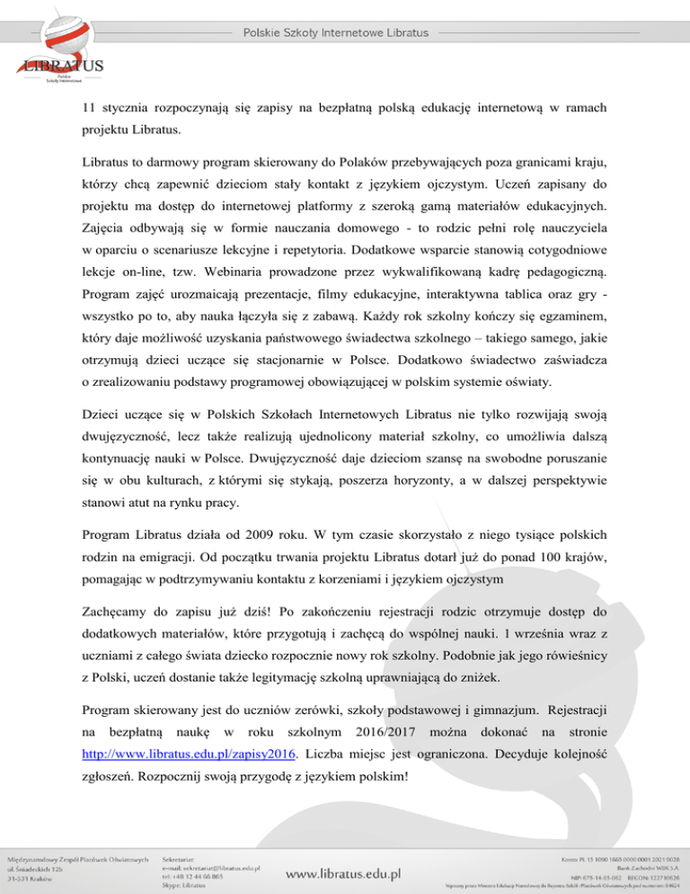 11 stycznia rozpoczynają się zapisy na bezpłatną polską edukację internetową w ramach projektu Libratus. Libratus to darmowy program skierowany do Polaków przebywających poza granicami kraju, którzy chcą zapewnić dzieciom stały kontakt z językiem ojczystym. Uczeń zapisany do projektu ma dostęp do internetowej platformy z szeroką gamą materiałów edukacyjnych. Zajęcia odbywają się w formie nauczania domowego - to rodzic pełni rolę nauczyciela w oparciu o scenariusze lekcyjne i repetytoria. Dodatkowe wsparcie stanowią cotygodniowe lekcje on-line, tzw. Webinaria prowadzone przez wykwalifikowaną kadrę pedagogiczną. Program zajęć urozmaicają prezentacje, filmy edukacyjne, interaktywna tablica oraz gry wszystko po to, aby nauka łączyła się z zabawą. Każdy rok szkolny kończy się egzaminem, który daje możliwość uzyskania państwowego świadectwa szkolnego – takiego samego, jakie otrzymują dzieci uczące się stacjonarnie w Polsce. Dodatkowo świadectwo zaświadcza o zrealizowaniu podstawy programowej obowiązującej w polskim systemie oświaty. Dzieci uczące się w Polskich Szkołach Internetowych Libratus nie tylko rozwijają swoją dwujęzyczność, lecz także realizują ujednolicony materiał szkolny, co umożliwia dalszą kontynuację nauki w Polsce. Dwujęzyczność daje dzieciom szansę na swobodne poruszanie się w obu kulturach, z którymi się stykają, poszerza horyzonty, a w dalszej perspektywie stanowi atut na rynku pracy. Program Libratus działa od 2009 roku. W tym czasie skorzystało z niego tysiące polskich rodzin na emigracji. Od początku trwania projektu Libratus dotarł już do ponad 100 krajów, pomagając w podtrzymywaniu kontaktu z korzeniami i językiem ojczystym Zachęcamy do zapisu już dziś! Po zakończeniu rejestracji rodzic otrzymuje dostęp do dodatkowych materiałów, które przygotują i zachęcą do wspólnej nauki. 1 września wraz z uczniami z całego świata dziecko rozpocznie nowy rok szkolny. Podobnie jak jego rówieśnicy z Polski, uczeń dostanie także legitymację szkolną uprawniającą do zniżek. Program skierowany jest do uczniów zerówki, szkoły podstawowej i gimnazjum. Rejestracji na bezpłatną naukę w roku szkolnym 2016/2017 można dokonać na stronie http://www.libratus.edu.pl/zapisy2016. Liczba miejsc jest ograniczona. Decyduje kolejność zgłoszeń. Rozpocznij swoją przygodę z językiem polskim!