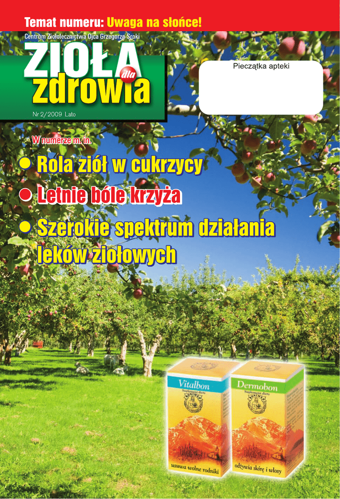 Nie stresuj sie! Stres to to, co na początku XXI wieku dosięga nas bez wyjątku. Najczęściej jest on skutkiem zbyt szybkiego trybu życia. Stres prowadzi do różnych schorzeń. Często są to choroby przewodu pokarmowego, np. słynne jelito drażliwe. Stres źle wpływa na serce, a zwłaszcza gdy jest ono już chore. Mało kto wie, że stres jest główną przyczyną zespołów bólowych kręgosłupa. Powoduje on również obniżenie odporności organizmu, a przez to zwiększa skłonność do infekcji i może przyczyniać się do szybszego rozwoju chorób nowotworowych. Najlepszym rozwiązaniem byłoby zwolnienie tempa życia, ale niestety nie zawsze jest to możliwe. Dlatego pozostaje stosowanie substancji, które uspokajają nasze skołatane nerwy. Niektórzy używają do tego leków syntetycznych. Uważamy to za błąd, gdyż jest to wyciąganie armaty na zająca. Na stres dużo lepiej działają preparaty ziołowe, które są bezpieczniejsze w stosowaniu, nie uzależniają, działają krótko, a jednocześnie intensywnie. Z naszych doświadczeń wynika, że na nagły stres znakomicie sprawdza się Nerwobonisol (1 łyżeczka minimalnie rozcieńczona wodą - im mniej wody tym lepiej). Nerwobonisol to lek zawierający alkohol i to powoduje, że wchłania się do krwi tym szybciej im jest bardziej stężony. Jeżeli ktoś cierpi na przewlekły stres, polecamy Nerwobon w postaci kapsułek ziołowych – działają one wolniej i dłużej niż preparat na alkoholu. Jeżeli stres nie pozwala nam zasnąć, pomocne będą 2 kapsułki Nerwobonu + 1 łyżeczka Nerwobonisolu przed snem. Jeżeli ktoś mimo tego przebudzi się w nocy – może powtórzyć zalecane 2 kapsułki Nerwobonu i 1 łyżeczkę Nerwobonisolu. Zatem nie dajmy się wpędzić w stres, ale jednocześnie nie dajmy się uzależnić od leków. 2 Upał przyczyną obrzęków nóg P odstawowym surowcem wykorzystywanym w celu poprawy krążenia krwi w naczyniach żylnych i włosowatych jest nasienie kasztanowca, rzadziej jego kora lub kwiat. Za najważniejszą substancję czynną tego surowca uważa się escynę, która jest mieszaniną związków saponinowych. Wyciąg z owoców kasztanowca wykazuje działanie ochronne względem żył i naczyń włosowatych. Zalecany jest on nie tylko doustnie, ale również jako składnik maści i kremów do stosowania miejscowego. Sprawdza się zarówno jako suplement w łagodzeniu obrzęków goleni wynikłych z długiego stania oraz jako lek roślinny (stosowany w większych dawkach) przy żylakach i obrzękach pourazowych, a nawet w zakrzepowym zapaleniu żył. Stosowanie ziół poprawiających krążenie krwi w żyłach kończyn dolnych, ważne jest zwłaszcza w okresie letnim. Ciepło znacznie pogarsza krążenie żylne, dlatego oprócz preparatów ziołowych wskazane jest latem spędzać więcej czasu w ruchu. Jeżeli nie mamy takich możliwości w pracy dobrze jest stanąć kilkanaście razy na palcach lub przez 2-3 minuty intensywnie ruszać stopą – takie ćwiczenia pomocne będą zwłaszcza Paniom „na szpilkach”. Dla osób mających pracę siedzącą wskazane jest wykładanie nóg na krzesło lub włożenie podudzi i stóp do zimnej wody. Lato to także okres letnich wyjazdów, co wiąże się z długimi godzinami spędzonymi w autobusie, samochodzie lub samolocie. Dlatego polecamy robić częste przerwy w siedzeniu i przespacerowanie się w trakcie podróży. W Centrum Ziołolecznictwa Ojca Grzegorza jako profilaktykę żylaków i pajączków naczyniowych polecamy Venobon (1-2 x dziennie 1 kapsułka) i Venobon krem (zewnętrznie na pajączki i żylaki). 3 Szerokie spektrum działania leków ziołowych Istnieje obiegowy pogląd, że zioła są dobre na wszystko. Czy Pan się z tym zgadza? W miarę jak upływają kolejne lata mojej praktyki lekarskiej w Centrum Ziołolecznictwa Ojca Grzegorza (w tym roku mija 18 lat), coraz bardziej przychylam się do tego obiegowego sądu. Do podobnych wniosków dochodzą także badacze, którzy odkrywają dla nauki coraz to nowsze tajemnice roślin leczniczych. Można powiedzieć, że im dłużej bada się jakieś zioło, tym więcej jego nowych prozdrowotnych własności się odkrywa. Może Pan podać jakiś przykład? Taką rośliną jest korzeń żeń–szenia. Kiedyś uważano, że jest to zioło nadające się do rekonwalescencji, poprawiające witalność i kondycję. Z biegiem czasu odkryto, że obniża on poziom cukru we krwi, podnosi odporność organizmu na stres i infekcje, a niedawno, że obniża poziom cholesterolu i poprawia ukrwienie tkanek. Podobnie sprawa ma się z miłorzębem japońskim. Czy zioła znajdą swe miejsce w dobie zchemizowanej medycyny i farmacji? Jak najbardziej. Właśnie w roślinach odkrywa się nowe związki chemiczne, które po ich analizie są syntetyzowane sztucznie i tworzone są z nich leki – już wtedy syntetyczne. Czy ciała czynne wyizolowane z roślin leczniczych, a później wytworzone syntetycznie nie są lepsze niż napary lub nalewki z ziół będących ich prekursorami? Według mnie nie. Dużo lepsze od syntetycznych, z pozoru tych samych związków, są ekstrakty ziołowe. W roślinie leczniczej substancja czynna występuje w połączeniu z innymi związkami chemicznymi i to właśnie ten zbiór substancji chemicznych działa najlepiej. 4 Czy nie wiedzą o tym farmakolodzy z wielkich koncernów farmaceutycznych? Wiedzą, ale zdają sobie sprawę, że nalewki, czy herbatki z zioła nie mogliby opatentować i jako właściciele patentu czerpać z niego zyski. Natomiast z substancji syntetycznej, która Wywiad z lek. med. Krzysztofem Błechą, internistą i specjalistą rehabilitacji medycznej jest opatentowana, mogą. Dlatego w medycynie stosuje się częściej substancje czyste o bardzo wąskim profilu działania. Rozumiem, że zioło lub mieszanka ziół ma szersze spektrum działania niż pojedynczy składnik? To oczywiste dla każdego. Niestety w czasie rejestracji nowatorskiego leku roślin