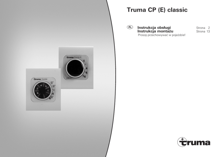 Truma CP (E) classic Instrukcja obsługi Instrukcja montażu Proszę przechowywać w pojeżdzie! Strona 2 Strona 13 Elementy obsługi CP (E) classic Spis treści Stosowane symbole .............................................................. 2 Przeznaczenie ...................................................................... 2 Stosowane symbole Montażu i naprawy urządzenia wolno dokonywać wyłącznie fachowcom. Instrukcja obsługi Wskazówka z informacjami i radami. Wskazówki bezpieczeństwa ............................................ 3 Elementy wskazywania i obsługi ..................................... 3 Panel obsługi – CP classic ..................................................... 3 Przełącznik preselekcyjny energii – CP E classic ................... 3 Uruchomienie ...................................................................... 4 Tryb ciepłej wody ................................................................... 4 Tryb grzewczy i ciepłej wody ................................................. 4 Wyłączanie .......................................................................... 5 Zakłócenie ........................................................................... 5 Tryb gazowy wzgl. tryb dieslowy ........................................... 5 Tryb elektryczny ..................................................................... 6 Tryb mieszany ........................................................................ 6 Wyposażenie ....................................................................... 7 Instrukcja wyszukiwania błędów (Ogrzewanie Combi Gas) ................................................... 8 Instrukcja wyszukiwania błędów (Ogrzewanie Combi Diesel) ............................................. 11 Dane techniczne ............................................................... 13 Konserwacja ...................................................................... 13 Utylizacja ........................................................................... 13 Deklaracja zgodności ....................................................... 13 Instrukcja montażu Wskazówki bezpieczeństwa .......................................... 13 Zakres dostawy ................................................................ 13 Montaż ............................................................................... 14 2 Przestrzegać przepisów ESD! Naładowania elektrostatyczne mogą spowodować zniszczenie elektroniki. Przed dotknięciem elektroniki wyrównać potencjały. Przeznaczenie Panel obsługi – CP classic Za pomocą panelu obsługi można na ogrzewaniu Truma Combi (E) ustawiać temperaturę pomieszczenia i wody. Przełącznik preselekcyjny energii – CP E classic Przełącznikiem preselekcyjnym energii można na ogrzewaniu Truma Combi E (z prętami grzejnymi do trybu elektrycznego) wybierać rodzaje energii – gaz wzgl. diesel i/lub energia elektryczna. Dodatkowo potrzebny jest panel obsługi CP classic. Elementy obsługi są przeznaczone do zabudowy w przyczepach kempingowych i silnikowych pojazdach kempingowych. Montaż w łodziach jest niedopuszczalny. Instrukcja obsługi Wskazówki bezpieczeństwa – Ogrzewanie lub element obsługi użytkować tylko w nienagannym stanie technicznym. – Niezwłocznie zlecać usunięcie zakłóceń. Zakłócenia można usuwać samodzielnie tylko wtedy, gdy usunięcie zostało opisane w instrukcji wyszukiwania błędów niniejszej instrukcji obsługi. – Nie dokonywać napraw ani zmian ogrzewania lub elementu obsługi! – Naprawę wadliwego ogrzewania lub wadliwego elementu obsługi zlecać tylko producentowi lub jego serwisowi. Elementy wskazywania i obsługi Panel obsługi – CP classic Combi 7 3 25 60° 5 9 4 a g, h b 40° c 60° f d e 3 1 1 a = pokrętło temperatury pomieszczenia (1 – 5) b = zielona dioda LED świeci się „Praca” c = tryb ciepłej wody (temperatura wody 40 °C lub 60 °C) d = tryb grzewczy i ciepłej wody (ogrzewanie bez kontrolowanej temperatury wody lub z opróżnioną instalacją wodną) e = tryb grzewczy i ciepłej wody (ogrzewanie z kontrolowaną temperaturą wody) f = przełącznik obrotowy „Wył.” g = żółta dioda LED świeci się „Faza nagrzewania bojlera” żółta dioda LED miga „Ostrzeżenie” h = czerwona dioda LED świeci się, czerwona dioda LED miga „Zakłócenie” Przełącznik preselekcyjny energii – CP E classic Combi E i o 230 V~ j k l m n i = przełącznik obrotowy wyboru energii j = tryb elektryczny 230 V, 1800 W k = tryb elektryczny 230 V, 900 W l = tryb gazowy wzgl. tryb dieslowy m = tryb mieszany* (tryb gazowy wzgl. tryb dieslowy i tryb elektryczny 900 W) n = tryb mieszany* (tryb gazowy wzgl. tryb dieslowy i tryb elektryczny 1800 W) o = żółta dioda LED świeci się „Tryb elektryczny” * Tryb ciepłej wody: W trybie ciepłej wody ogrzewanie wybiera automatycznie tryb elektryczny z wstępnie wybraną mocą 900 W lub 1800 W. Tryb grzewczy: W trybie grzewczym pierwszeństwo ma tryb elektryczny. Jeżeli moc grzewcza nie jest wystarczająca, dołączony zostaje tryb gazowy wzgl. tryb dieslowy. 3 Maksymalna moc grzewcza nie zwiększa się przez dołączenie elektrycznych prętów grzejnych. Uruchomienie Tryb grzewczy, zależnie od ustawienia trybu, jest możliwy zarówno z zawartością wody, jak i bez niej. Tryb grzewczy i ciepłej wody Urządzenia z elektrycznymi prętami grzejnymi Za pomocą przełącznika preselekcyjnego energii ustawić tryb gazowy wzgl. tryb dieslowy, tryb elektryczny lub tryb mieszany. Świecenie żółtej diody LED (o) na przełączniku preselekcyjnym energii sygnalizuje tryb 230 V. – Ogrzewanie z kontrolowaną temperaturą wody Tryb ciepłej wody To ustawienie trybu jest dopuszczalne tylko z napełnionym bojlerem. Urządzenia z elektrycznymi prętami grzejnymi Za pomocą przełącznika preselekcyjnego energii ustawić tryb gazowy wzgl. tryb dieslowy lub tryb elektryczny. Świecenie żółtej diody LED (o) na
