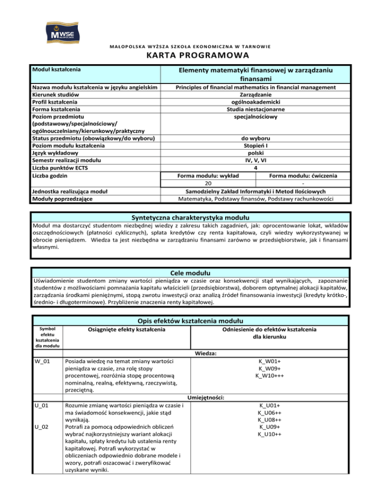 MAŁOP OLSKA WYŻSZ A SZ KOŁA E KONOMICZNA W TARN OW IE KARTA PROGRAMOWA Moduł kształcenia Elementy matematyki finansowej w zarządzaniu finansami Nazwa modułu kształcenia w języku angielskim Kierunek studiów Profil kształcenia Forma kształcenia Poziom przedmiotu (podstawowy/specjalnościowy/ ogólnouczelniany/kierunkowy/praktyczny Status przedmiotu (obowiązkowy/do wyboru) Poziom modułu kształcenia Język wykładowy Semestr realizacji modułu Liczba punktów ECTS Liczba godzin Principles of financial mathematics in financial management Zarządzanie ogólnoakademicki Studia niestacjonarne specjalnościowy do wyboru Stopień I polski IV, V, VI 4 Forma modułu: wykład Forma modułu: ćwiczenia 20 Samodzielny Zakład Informatyki i Metod Ilościowych Matematyka, Podstawy finansów, Podstawy rachunkowości Jednostka realizująca moduł Moduły poprzedzające Syntetyczna charakterystyka modułu Moduł ma dostarczyć studentom niezbędnej wiedzy z zakresu takich zagadnień, jak: oprocentowanie lokat, wkładów oszczędnościowych (płatności cyklicznych), spłata kredytów czy renta kapitałowa, czyli wiedzy wykorzystywanej w obrocie pieniądzem. Wiedza ta jest niezbędna w zarządzaniu finansami zarówno w przedsiębiorstwie, jak i finansami własnymi. Cele modułu Uświadomienie studentom zmiany wartości pieniądza w czasie oraz konsekwencji stąd wynikających, zapoznanie studentów z możliwościami pomnażania kapitału właścicieli (przedsiębiorstwa), doborem optymalnej alokacji kapitałów, zarządzania środkami pieniężnymi, stopą zwrotu inwestycji oraz analizą źródeł finansowania inwestycji (kredyty krótko-, średnio- i długoterminowe). Przybliżenie znaczenia renty kapitałowej. Opis efektów kształcenia modułu Symbol efektu kształcenia dla modułu Osiągnięte efekty kształcenia Odniesienie do efektów kształcenia dla kierunku Wiedza: W_01 Posiada wiedzę na temat zmiany wartości pieniądza w czasie, zna rolę stopy procentowej, rozróżnia stopę procentową nominalną, realną, efektywną, rzeczywistą, przeciętną. U_01 Rozumie zmianę wartości pieniądza w czasie i ma świadomość konsekwencji, jakie stąd wynikają. Potrafi za pomocą odpowiednich obliczeń wybrać najkorzystniejszy wariant alokacji kapitału, spłaty kredytu lub ustalenia renty kapitałowej. Potrafi wykorzystać w obliczeniach odpowiednio dobrane modele i wzory, potrafi oszacować i zweryfikować uzyskane wyniki. K_W01+ K_W09+ K_W10+++ Umiejętności: U_02 K_U01+ K_U06++ K_U08++ K_U09+ K_U10++ K_01 Kompetencje społeczne: Potrafi myśleć w sposób logiczny i precyzyjny oraz działać w sposób uporządkowany K_K03+ K_K05++ Treści kształcenia modułu 1. 2. 3. 4. 5. 6. Forma modułu: wykład Podstawy teorii wartości pieniądza w czasie; źródła zmiany wartości pieniądza w czasie: Podstawowe terminy i oznaczenia stosowane w matematyce finansowej, Stopa procentowa; teoria stopy procentowej (nominalna i realna stopa procentowa, stopa procentowa a inflacja), Kapitalizacja odsetek (prosta, złożona, ciągła, zgodna, niezgodna), Motywy utrzymywania wolnej gotówki w przedsiębiorstwie i sposoby jej alokacji, Efektywna stopa procentowa, porównywanie atrakcyjności ofert bankowych w zakresie lokat, wybór optymalnych sposobów alokacji kapitału, Kapitalizacja przy zmiennej stopie procentowej, Kapitalizacja z uwzględnieniem inflacji i podatku dochodowego, realna stopa procentowa, Wartość obecna pieniądza: Dyskontowanie; dyskonto matematyczne i handlowe, Stopa zwrotu inwestycji, Wartość przyszła i obecna płatności cyklicznych: Wkłady zgodne, Wkłady niezgodne: - I model niezgodności; okres wpłat i kapitalizacji pokrywa się – inny jest okres stopy procentowej, - II model niezgodności; wpłaty są częstsze niż kapitalizacja, - III model niezgodności; kapitalizacja jest częstsza niż wkłady, Porównywanie zyskowności kapitału w poszczególnych modelach, ustalenie czynników wpływających na optymalny zysk, Spłata kredytów krótkoterminowych; rodzaje kredytów krótkoterminowych. Spłata kredytów średnio- i długoterminowych: Spłata kredytu w zadanych ratach łącznych (niekoniecznie równych), Spłata kredytu w równych ratach łącznych, Spłata kredytu w równych ratach kapitałowych (raty „malejące”), Kredyt z opóźnionym okresem spłat, Efektywny koszt kredytu. Renty kapitałowe: Renty stałe zgodne, Renty niezgodne, renty wieczyste, Emerytury oparte o fundusz emerytalny; kapitał rentowy. Literatura podstawowa 1. 2. Forma modułu: ćwiczenia - E. Smaga, Arytmetyka finansowa, PWN, Warszawa – Kraków, 1999, J. Czekaj, Z. Dresler, Zarządzanie finansami przedsiębiorstw. Podstawy teorii, PWN, Warszawa 2001, Literatura uzupełniająca 3. M. Dąbrowa, Zbiór zadań z matematyki finansowej, Wydawnictwo MWSE, Tarnów 2000 1. Z. Dresler, (red. nauk.) Zarządzanie finansami przedsiębiorstw. Przykłady rachunków i analiz finansowych, Wydawnictwo AE w Krakowie, Kraków 2006, M. Sierpińska, T. Jachna, Metody podejmowania decyzji finansowych. Analiza przykładów i przypadków, PWN, Warszawa 2007, 2. Metody dydaktyczne Wykład problemowy, objaśnianie sposobów rozwiązywania problemów dotyczących zmiany wartości pieniądza w czasie oraz czynników wpływających na te zmiany, dyskusja, heureza, projekt.