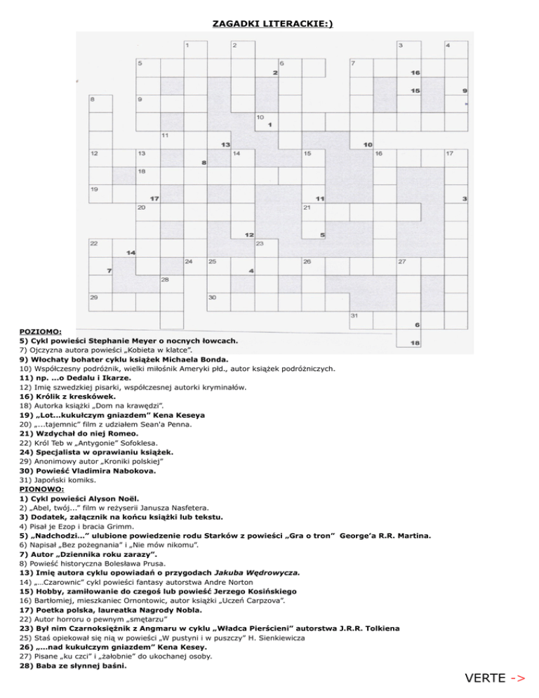 ZAGADKI LITERACKIE:) POZIOMO: 5) Cykl powieści Stephanie Meyer o nocnych łowcach. 7) Ojczyzna autora powieści „Kobieta w klatce”. 9) Włochaty bohater cyklu książek Michaela Bonda. 10) Współczesny podróżnik, wielki miłośnik Ameryki płd., autor książek podróżniczych. 11) np. ...o Dedalu i Ikarze. 12) Imię szwedzkiej pisarki, współczesnej autorki kryminałów. 16) Królik z kreskówek. 18) Autorka książki „Dom na krawędzi”. 19) „Lot...kukułczym gniazdem” Kena Keseya 20) „...tajemnic” film z udziałem Sean'a Penna. 21) Wzdychał do niej Romeo. 22) Król Teb w „Antygonie” Sofoklesa. 24) Specjalista w oprawianiu książek. 29) Anonimowy autor „Kroniki polskiej” 30) Powieść Vladimira Nabokova. 31) Japoński komiks. PIONOWO: 1) Cykl powieści Alyson Noël. 2) „Abel, twój...” film w reżyserii Janusza Nasfetera. 3) Dodatek, załącznik na końcu książki lub tekstu. 4) Pisał je Ezop i bracia Grimm. 5) „Nadchodzi…” ulubione powiedzenie rodu Starków z powieści „Gra o tron” George’a R.R. Martina. 6) Napisał „Bez pożegnania” i „Nie mów nikomu”. 7) Autor „Dziennika roku zarazy”. 8) Powieść historyczna Bolesława Prusa. 13) Imię autora cyklu opowiadań o przygodach Jakuba Wędrowycza. 14) „…Czarownic” cykl powieści fantasy autorstwa Andre Norton 15) Hobby, zamiłowanie do czegoś lub powieść Jerzego Kosińskiego 16) Bartłomiej, mieszkaniec Ornontowic, autor książki „Uczeń Carpzova”. 17) Poetka polska, laureatka Nagrody Nobla. 22) Autor horroru o pewnym „smętarzu” 23) Był nim Czarnoksiężnik z Angmaru w cyklu „Władca Pierścieni” autorstwa J.R.R. Tolkiena 25) Staś opiekował się nią w powieści „W pustyni i w puszczy” H. Sienkiewicza 26) „…nad kukułczym gniazdem” Kena Kesey. 27) Pisane „ku czci” i „żałobnie” do ukochanej osoby. 28) Baba ze słynnej baśni. VERTE -> HASŁO: (hasło powstaje po wpisaniu liter z kratek krzyżówki ponumerowanych w prawym dolnym rogu): 1. 2. 3. 4. 5. 6. 7. 8. 9. 10. 11. 12. 13. 14. 15. 16. 17. 18. IMIĘ I NAZWISKO, TELEFON/E-MAIL: ….............................................................................................................................. .................................................. Krzyżówkę z rozwiązanym hasłem można oddać przy ladzie bibliotecznej Planety11 lub hasło z krzyżówki wysłać na email: [email protected] w terminie do 8.07.2016 Do wygrania oczywiście nasz zestaw literacki: kubeczek, książka i abonament (1mies.) na wypożyczanie mediów w Planecie11. Przystąpienie do konkursu jest równoznaczne z wyrażeniem zgody na opublikowanie imienia i nazwiska na stronie internetowej biblioteki w celach informacyjnych. POWODZENIA!:)