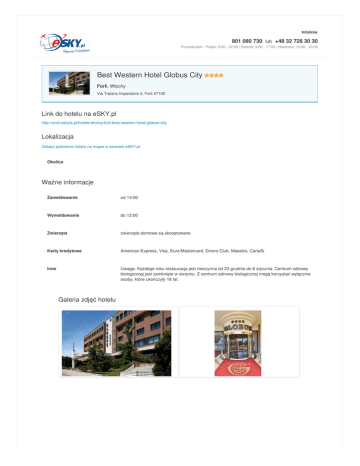 Infolinia 801 080 730 lub +48 32 728 30 30 Poniedziałek - Piątek: 8:00 - 22:00 | Sobota: 9:00 - 17:00 | Niedziela: 12:00 - 20:00 Best Western Hotel Globus City Forlì, Włochy Via Traiano Imperatore 4, Forli 47100 Link do hotelu na eSKY.pl http://onet.eskyts.pl/hotele/wlochy/forli-best-western-hotel-globus-city Lokalizacja Zobacz położenie hotelu na mapie w serwisie eSKY.pl Okolica Ważne informacje Zameldowanie od 14:00 Wymeldowanie do 12:00 Zwierzęta zwierzęta domowe są akceptowane Karty kredytowe American Express, Visa, Euro/Mastercard, Diners Club, Maestro, CartaSi Inne Uwaga: Każdego roku restauracja jest nieczynna od 23 grudnia do 6 stycznia. Centrum odnowy biologicznej jest zamknięte w sierpniu. Z centrum odnowy biologicznej mogą korzystać wyłącznie osoby, które ukończyły 18 lat. Galeria zdjęć hotelu Hotele – Bilety lotnicze – Tanie linie lotnicze – Ubezpieczenia Podróżne