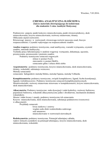 Wrocław, 7.03.2016. CHEMIA ANALITYCZNA ILOŚCIOWA Zakres materiału obowiązującego do kolokwium dla studentów I roku Analityki Medycznej Podstawowe pojęcia: punkt końcowy miareczkowania, punkt równoważnikowy, skok miareczkowania, krzywa miareczkowania, roztwory mianowane, titranty. Obliczanie stężeń roztworów. Równowagi jonowe w roztworach: równowaga roztwór nasycony-osad, iloczyn rozpuszczalności. Czynniki wpływające na rozpuszczalność osadów. Analiza wagowa: podstawy teoretyczne, osad analityczny, warunki wytrącania, czystość osadów, mnożnik analityczny. Technika pracy laboratoryjnej w analizie wagowej: wytrącanie, dekantacja, sączenie, przemywanie, przenoszenie i prażenie osadów. Podstawy teoretyczne oznaczeń wagowych: żelaza w postaci Fe2O3 siarczanów w postaci BaSO4 oznaczanie glinu i żelaza obok siebie Argentometria : podstawy teoretyczne, krzywe miareczkowania, skok miareczkowania, titranty, wskaźniki, substancje wzorcowe. Metody oznaczania: oznaczanie halogenków metodą Mohra, metodą Fajansa, metodą Volharda. Kompleksometria: podstawy teoretyczne, związki kompleksowe, ligand, liczba koordynacji, ligandy wielokleszczowe. Podstawy teoretyczne oznaczeń kompleksometrycznych. Metalowskaźniki, roztwory mianowane stosowane w kompleksometrii, krzywe miareczkowania, skok miareczkowania. Alkacymetria: Podstawy teoretyczne: stała dysocjacji i stała hydrolizy, roztwory buforowe, pojemność buforowa, wskaźniki alkacymetryczne jedno i dwubarwne, mechanizm działania wskaźników. Mocne i słabe kwasy i zasady, podstawy teoretyczne ich oznaczania. Krzywe miareczkowania, skok miareczkowania, substancje podstawowe (wzorcowe) w alkacymetrii. Przykłady oznaczeń: kwas siarkowy i octowy weglan sodu obok wodorotlenku sodowego sole amonowe miareczkowanie w roztworach niewodnych Redoksymetria: podstawy teoretyczne. Potencjał utleniajacy układu, wpływ różnych czynników na potencjał utleniajacy, krzywe miareczkowania, skok miareczkowania, wskaźniki. Manganianometria: podstawy teoretyczne, roztwór mianowany, substancje wzorcowe. Zasady oznaczania: żelaza (II) obok chlorków nadtlenku wodoru azotynów wapnia manganu obok żelaza Jodometria: podstawy teoretyczne, właściwości układu I2/2I-, mianowane roztwory jodu i tiosiarczanu sodowego, substancje wzorcowe. Oznaczanie: arseninów podchlorynów dichromianu(VI) potasi, miedzi Literatura zalecana: 1. Lipiec T., Szmal Z. - Chemia analityczna. PZWL 1997 2. Kocjan R. Chemia analityczna Tom 1, PZWL, 2005 3. Minczewski J., Marczenko Z. Chemia Tom 1, 2; PWN, 2007 4. Skoog D., West D., Holler J., Crouch S. Podstawy chemii analitycznej, PWN, 2007 5. Kealey D., Heines P.J. Krótkie wykłady. Chemia analityczna, PWN, 2005 6. Galus Z. Ćwiczenia rachunkowe z chemii analitycznej, PWN 1993 i nowsze
