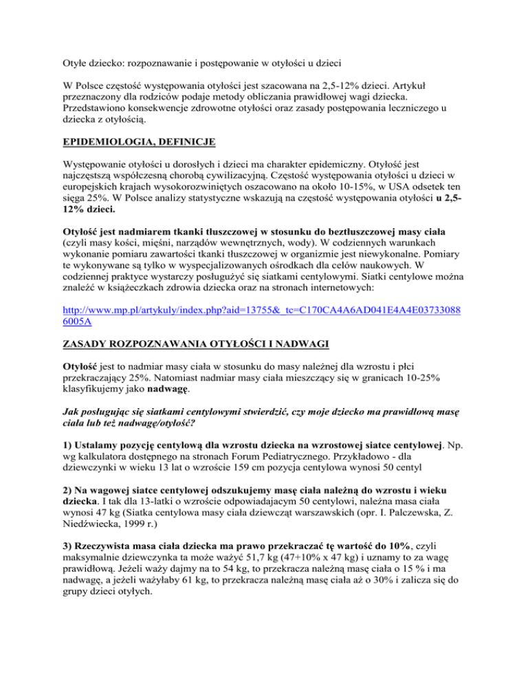 Otyłe dziecko: rozpoznawanie i postępowanie w otyłości u dzieci W Polsce częstość występowania otyłości jest szacowana na 2,5-12% dzieci. Artykuł przeznaczony dla rodziców podaje metody obliczania prawidłowej wagi dziecka. Przedstawiono konsekwencje zdrowotne otyłości oraz zasady postępowania leczniczego u dziecka z otyłością. EPIDEMIOLOGIA, DEFINICJE Występowanie otyłości u dorosłych i dzieci ma charakter epidemiczny. Otyłość jest najczęstszą współczesną chorobą cywilizacyjną. Częstość występowania otyłości u dzieci w europejskich krajach wysokorozwiniętych oszacowano na około 10-15%, w USA odsetek ten sięga 25%. W Polsce analizy statystyczne wskazują na częstość występowania otyłości u 2,512% dzieci. Otyłość jest nadmiarem tkanki tłuszczowej w stosunku do beztłuszczowej masy ciała (czyli masy kości, mięśni, narządów wewnętrznych, wody). W codziennych warunkach wykonanie pomiaru zawartości tkanki tłuszczowej w organizmie jest niewykonalne. Pomiary te wykonywane są tylko w wyspecjalizowanych ośrodkach dla celów naukowych. W codziennej praktyce wystarczy posługużyć się siatkami centylowymi. Siatki centylowe można znaleźć w książeczkach zdrowia dziecka oraz na stronach internetowych: http://www.mp.pl/artykuly/index.php?aid=13755&_tc=C170CA4A6AD041E4A4E03733088 6005A ZASADY ROZPOZNAWANIA OTYŁOŚCI I NADWAGI Otyłość jest to nadmiar masy ciała w stosunku do masy należnej dla wzrostu i płci przekraczający 25%. Natomiast nadmiar masy ciała mieszczący się w granicach 10-25% klasyfikujemy jako nadwagę. Jak posługując się siatkami centylowymi stwierdzić, czy moje dziecko ma prawidłową masę ciała lub też nadwagę/otyłość? 1) Ustalamy pozycję centylową dla wzrostu dziecka na wzrostowej siatce centylowej. Np. wg kalkulatora dostępnego na stronach Forum Pediatrycznego. Przykładowo - dla dziewczynki w wieku 13 lat o wzroście 159 cm pozycja centylowa wynosi 50 centyl 2) Na wagowej siatce centylowej odszukujemy masę ciała należną do wzrostu i wieku dziecka. I tak dla 13-latki o wzroście odpowiadajacym 50 centylowi, należna masa ciała wynosi 47 kg (Siatka centylowa masy ciała dziewcząt warszawskich (opr. I. Palczewska, Z. Niedźwiecka, 1999 r.) 3) Rzeczywista masa ciała dziecka ma prawo przekraczać tę wartość do 10%, czyli maksymalnie dziewczynka ta może ważyć 51,7 kg (47+10% x 47 kg) i uznamy to za wagę prawidłową. Jeżeli waży dajmy na to 54 kg, to przekracza należną masę ciała o 15 % i ma nadwagę, a jeżeli ważyłaby 61 kg, to przekracza należną masę ciała aż o 30% i zalicza się do grupy dzieci otyłych. Dla uproszczenia wyżej wymienionych obliczeń, które zajmują trochę czasu, można posługiwać się tzw. wskaźnikiem względnej masy ciała (BMI). Jest to najprostsza i najlepsza metoda dla stwierdzenia, czy dziecko ma nadwagę, bądź jest otyłe. Wskaźnik ten oblicza się dzieląc masę ciała wyrażoną w kilogramach przez kwadrat wzrostu wyrażony w metrach (kg/m2). Czyli chłopiec o masie ciała 65 kg i wzroście 155 cm będzie miał BMI=27 kg/m2 gdyż [65: (1.55)2]=27. BMI zmienia się w miarę wzrastania dziecka i dlatego wskaźnik ten należy interpretować posługując się siatkami centylowymi. Dostępne są one na stronie: http://www.mp.pl/artykuly/index.php?aid=13755&_tc=C170CA4A6AD041E4A4E03733088 6005A. Otyłość rozpoznaje się, jeśli wartość BMI przekracza 97 centyl, a wartość BMI mieszcząca się w przedziale 90-97 centyl traktuje się jako nadwagę. Np. 12-latek o BMI=25 kg/m2 ma nadwagę (gdyż jego BMI jest powyżej linii dla 90 centyla, ale poniżej linii dla 97 centyla), natomiast chłopiec w tym samym wieku z BMI=27 kg/m2 jest otyły (gdyż jego BMI jest powyżej linii 97 centyla) Uwaga – tak jak każda metoda, również i BMI posiada pewne ograniczenia. Przykładowo u dzieci wysportowanych, o dobrze rozwiniętych mięśniach, wskaźnik ten może sugerować nadwagę, której w rzeczywistości dziecko nie ma, gdyż zwiększenie masy ciała w stosunku do wzrostu wynika u niego z przyrostu tkanki mięśniowej a nie tłuszczowej.