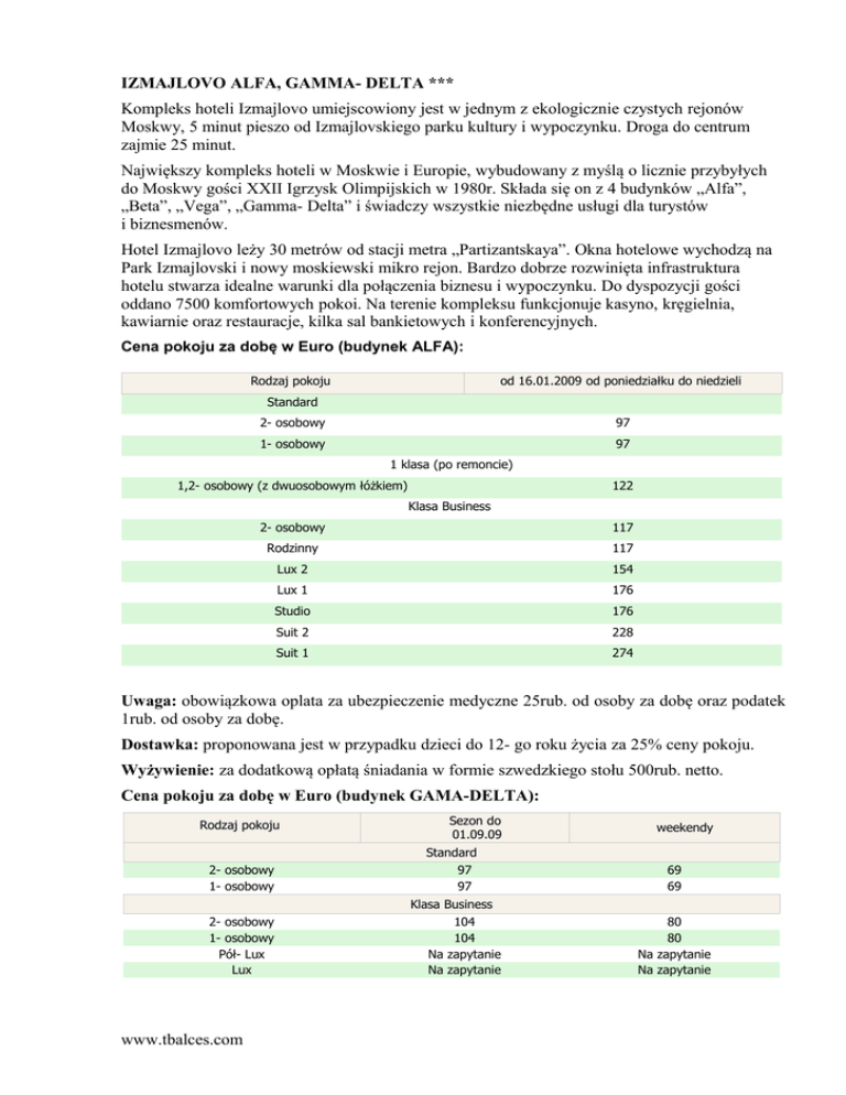 IZMAJLOVO ALFA, GAMMA- DELTA *** Kompleks hoteli Izmajlovo umiejscowiony jest w jednym z ekologicznie czystych rejonów Moskwy, 5 minut pieszo od Izmajlovskiego parku kultury i wypoczynku. Droga do centrum zajmie 25 minut. Największy kompleks hoteli w Moskwie i Europie, wybudowany z myślą o licznie przybyłych do Moskwy gości XXII Igrzysk Olimpijskich w 1980r. Składa się on z 4 budynków „Alfa”, „Beta”, „Vega”, „Gamma- Delta” i świadczy wszystkie niezbędne usługi dla turystów i biznesmenów. Hotel Izmajlovo leży 30 metrów od stacji metra „Partizantskaya”. Okna hotelowe wychodzą na Park Izmajlovski i nowy moskiewski mikro rejon. Bardzo dobrze rozwinięta infrastruktura hotelu stwarza idealne warunki dla połączenia biznesu i wypoczynku. Do dyspozycji gości oddano 7500 komfortowych pokoi. Na terenie kompleksu funkcjonuje kasyno, kręgielnia, kawiarnie oraz restauracje, kilka sal bankietowych i konferencyjnych. Cena pokoju za dobę w Euro (budynek ALFA): Rodzaj pokoju od 16.01.2009 od poniedziałku do niedzieli Standard 2- osobowy 97 1- osobowy 97 1 klasa (po remoncie) 1,2- osobowy (z dwuosobowym łóżkiem) 122 Klasa Business 2- osobowy 117 Rodzinny 117 Lux 2 154 Lux 1 176 Studio 176 Suit 2 228 Suit 1 274 Uwaga: obowiązkowa oplata za ubezpieczenie medyczne 25rub. od osoby za dobę oraz podatek 1rub. od osoby za dobę. Dostawka: proponowana jest w przypadku dzieci do 12- go roku życia za 25% ceny pokoju. Wyżywienie: za dodatkową opłatą śniadania w formie szwedzkiego stołu 500rub. netto. Cena pokoju za dobę w Euro (budynek GAMA-DELTA): Rodzaj pokoju Sezon do 01.09.09 weekendy Standard 2- osobowy 1- osobowy 97 97 69 69 Klasa Business 2- osobowy 1- osobowy Pół- Lux Lux www.tbalces.com 104 104 Na zapytanie Na zapytanie 80 80 Na zapytanie Na zapytanie Dostawka: proponowana jest w przypadku dzieci do 12- go roku życia za 800rub. netto bez śniadań. Wyżywienie: śniadania w formie szwedzkiego stołu za dodatkową opłatą 400 rub. netto. Uwagi: W okresie wystawowym ceny pokoi mogą ulec zmianie. Cena pokoju obejmuje: Pobyt w pokoju wybranej kategorii. Pozostałe usługi świadczone są za dodatkową opłatą. Doba hotelowa: 12:00 Informacje ogólne: Pokoje: 1- 2 osobowy Standard- Pokój z łazienką wyposażony w komplet mebli, dwa łóżka lub jedno dwuosobowe, telewizor, telefon, mini- bar. 1- 2 osobowy Business- Pokój z łazienką wyposażony w komplet mebli, dwa łóżka lub jedno dwuosobowe, telewizor, telefon, mini- bar. 1- 2 osobowy VIP- Pokój z łazienką wyposażony w komplet mebli, telewizor, telefon, mini- bar, zastaw kosmetyczny pod prysznic. 2 pokojowy Pół- Lux- apartament z łazienką wyposażony w komplet mebli, telewizor, telefon, mini- bar, przybory łazienkowe. 2 pokojowy Lux- apartament z łazienką wyposażony w komplet mebli, telewizor, telefon, minibar, dwie łazienki, przybory łazienkowe, suszarkę, szlafroki. Ponadto w budynku ALFA Suit 2- apartament z łazienką wyposażony w komplet mebli, telewizor, telefon, komputer, klimatyzację, mini- bar, przybory łazienkowe, suszarkę, szlafroki Suit 1- dwupoziomowe apartamenty wyposażone w komplet mebli, telewizor, radiotelefon na obu kondygnacjach, komputer, klimatyzację, mini- bar, dwie łazienki, przybory łazienkowe, suszarkę, szlafroki Wyżywienie: za dodatkowa opłatą. Dostęp do wody bieżącej: ciepła i zimna woda przez całą dobę. Infrastruktura: sejf depozytowy na recepcji, przechowalnia, bankomat, kantor, salon fryzjerski, salon urody, czyszczenie odzieży, pralnia chemiczna, usługi krawieckie i szewskie, apteka, optyk, punkt medyczny, sprzedaż biletów lotniczych i kolejowych, wypożyczalnia samochodów, sklepy, kioski z pamiątkami, kręgielnia, bilard, fitness centrum, restauracje, notariusz, usługi fotograficzne, usługi biznesowe, disco- bar, Internet- cafe, kasyno. Adres: Rosja, Moskwa Izmajlovskoe shosse 71. www.tbalces.com Budynki hotelowe Pokój dwuosobowy Pokój dwuosobowy www.tbalces.com Restauracja Restauracjia Sala konferencyjna www.tbalces.com