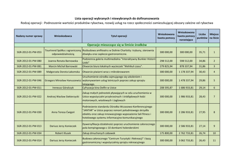 Lista operacji wybranych i niewybranych do dofinansowania Rodzaj operacji : Podnoszenie wartości produktów rybactwa, rozwój usług na rzecz społeczności zamieszkującej obszary zależne od rybactwa Nadany numer sprawy Wnioskodawca Tytuł operacji Wnioskowana Wnioskowana Liczba Miejsce kwota pomocy kwota pomocy punktów na liście narastająco Operacje mieszczące się w limicie środków SGR-2012-01-PW-053 Tourtrend Spółka z ograniczoną Rozbudowa amfiteatru w Dolinie Charlotty: trybuny, sterownia odpowiedzialnością dźwięku oraz zaplecze gastronomiczne. SGR-2012-01-PW-080 Joanna Renata Barnowska SGR-2012-01-PW-081 Marcin Michał Barnowski SGR-2012-01-PW-089 Małgorzata Dorota Łakomska SGR-2012-01-PW-046 SGR-2012-01-PW-011 Podziemna galeria multimedialna "Interaktywny Bunkier Historii Ustki" Otwarcie biura lokalnych wycieczek "Wehikuł czasu". Otwarcie piwiarni wraz z mikrobrowarem Uruchomienie ośrodka zajmującego się szkoleniem i Grzegorz Mirosław Hanuszewicz wykonywaniem usług lotniczych poprzez zakup sprzętu latającego. Ireneusz Góralczyk Cyfryzacja kina Delfin w Ustce 300 000,00 300 000,00 35,71 1 298 512,00 598 512,00 34,86 2 279 825,94 878 337,94 31,86 3 300 000,00 1 178 337,94 30,43 4 300 000,00 1 478 337,94 29,86 5 208 595,87 1 686 933,81 29,14 6 Andrzej Wacław Siekierzycki Zakup małych jednostek pływających w celu uruchomienia w Ustce wypożyczalni przybrzeżnych i śródlądowych łodzi motorowych, wiosłowych i żaglowych 300 000,00 1 986 933,81 28,43 7 SGR-2012-01-PW-030 Anna Teresa Ćwigoń Podniesienie standardu Ośrodka Wczasowo-Konferencyjnego "JANTAR" w Ustce poprzez remont południowego skrzydła obiektu oraz zakup innowacyjnego wyposażenia Sali fitness i hotelowego systemu informacyjno-komunikacyjnego 300 000,00 2 286 933,81 27,95 8 SGR-2012-01-PW-013 Dariusz Jerzy Konieczek Dywersyfikacja działalności poprzez uruchomienie całorocznego pola kempingowego z 10 domkami holenderskimi 300 000,00 2 586 933,81 27,14 9 SGR-2012-01-PW-034 Robert Klusek Zakup dmuchanych zabawek 175 800,00 2 762 733,81 26,74 10 SGR-2012-01-PW-014 Dariusz Jerzy Konieczek Budowa całorocznego "Centrum Turystyki i Rekreacji" i bazą gastronomiczną i wypożyczalnią sprzętu rekreacyjnego 300 000,00 3 062 733,81 26,43 11 SGR-2012-01-PW-022 Zakup oprogramowania i sprzętu do innowacyjnego wykonywania regionalnych obiektów mieszkalnych. 300 000,00 3 362 733,81 26,29 12 Paweł Grądzki Budowa wraz z elementami wyposażenia całorocznego kompleksu domków rekreacyjno-wypoczynkowych oraz tradycyjnej wędzarni w miejscowości Machowino, gmina Ustka. 300 000,00 3 662 733,81 26,29 13 SGR-2012-01-PW-088 Małgorzata Dorota Łakomska Zakup łodzi wraz z nowoczesnym wyposażeniem nawigacyjnym do turystycznych wypraw morskich. 300 000,00 3 962 733,81 26,23 14 SGR-2012-01-PW-045 Zygmunt Andrzej Karwacki Rozbudowa i przebudowa istniejącego budynku gospodarczego na salę weselną zlokalizowanego na działce nr 24/2 obręb ewidencyjny Jarosławiec Gmina Postomino 300 000,00 4 262 733,81 26,14 15 SGR-2012-01-PW-057 Tomasz Maciej Szwedkowicz 300 000,00 4 562 733,81 25,82 16 SGR-2012-01-PW-078 Dominik Kazimierz Ściepko 300 000,00 4 862 733,81 25,56 17 SGR-2012-01-PW-002 Cezary Król 117 000,00 4 979 733,81 25,00 18 SGR-2012-01-PW-084 Beata Ćwigoń 253 864,72 5 233 598,53 24,73 19 Krzysztof Woźniak Zakup sprzętu niezbędnego do prowadzenia działalności firmy budowlanej. 294 720,00 5 528 318,53 24,71 20 SGR-2012-01-PW-050 Nordica-Villan Sp. z o.o Budowa hali produkcyjnej wraz z zakupem linii technologicznej niezbędnej do rozwoju działalności związanej z usługami ciesielskimi na rzecz lokalnej społecznoślci zamieszkującej obszary zależne od rybactwa. 299 999,73 5 828 318,26 24,64 21 SGR-2012-01-PW-031 Paweł Dariusz Radliński Rozpoczęcie działalności gospodarczej w zakresie handlu materiałami hydraulicznymi oraz świadczeniem specjalistycznych usług serwisowych - 24 godziny na dobę. 163 683,00 5 992 001,26 24,55 22 SGR-2012-01-PW-004 Paweł Rojek Zakup wyposażenia niezbędnego do ROZWOJU działalności związanej z usługami kominiarskimi na rzecz lokalnej społeczności zamieszkującej obszary zależne od rybactwa. 18 585,53 6 010 586,79 24,36 23 SGR-2012-01-PW-075 Andrzej Przemysław Mielnik 157 096,80 6 167 683,59 24,00 24 SGR-2012-01-PW-070 Romuald Skrzypek 300 000,00 6 467 683,59 23,73 25 SGR-2012-01-PW-006 Andrzej Kawalec SGR-2012-01-PW-073 Otwarcie restauracji promującej pomorskie dziedzictwo kulinarne. Centrum zabaw wraz z mobilnym aquaparkiem Rozwój usług poprzez zakup specjalistycznego urządzenia diagnostycznego Ray Scan Syphony Alpha z Cephalo ONE SCHOT model OC. Innowacyjne usługi rehabilitacyjne w O.W. Kormoran Operacje niemieszczące się w limicie środków SGR-2012-01-PW-010 Etap I - zakup maszyn dla mobilnej stoczni jachtowej. Sprzedaż regionalnych produktów pomorskiego dziedzictwa kulinarnego. SGR-2012-01-PW-079 SGR-2012-01-PW-093 SGR-2012-01-PW-094 SGR-2012-01-PW-104 SGR-2012-01-PW-003 SGR-2012-01-PW-029 SGR-2012-01-PW-098 SGR-2012-01-PW-066 SGR-2012-01-PW-019 SGR-2012-01-PW-008 SGR-2012-01-PW-042 SGR-2012-01-PW-086 SGR-2012-01-PW-087 SGR-2012-01-PW-044 SGR-2012-01-PW-068 SGR-2012-01-PW-020 SGR-2012-01-PW-076 Dominik Kazimierz Ściepko Centrum rozrywkowe z kinem 7D Zakup nowoczesnego mobilnego aparatu rentgenowskiego z Pollex Continental Sp. z o.o. ramieniem C Pollex Continental Sp. z o.o. Otwarcie obiektu rehabilitacyjnego. Sylwester Biernacki Agroturystyka w sadzie Jarosław Janusz Kaczmarek Otwarcie budynku usług związanych z zakwaterowaniem. Uruchomienie punktu nauki i wypożyczalni pojazdów Marian Jan Olszewski dwukołowych pionowych (np. segway) Jacek Stefański Rozszerzenie działalności gospodarczej. Organizacja ekologicznego transportu wolnobieżnego na Edyta Ewa Salwowska terenie miasta Ustki. Doposażenie warsztatu stolarskiego w celu rozwoju usług Marcin Jakubczak produkcji mebli. Dokończenie budowy budynku pensjonatowego wraz 