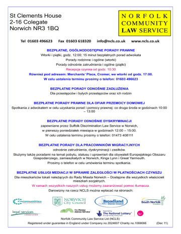St Clements House 2-16 Colegate Norwich NR3 1BQ Tel 01603 496623 Fax 01603 618320 [email protected] www.ncls.co.uk BEZPŁATNE, OGÓLNODOSTĘPNE PORADY PRAWNE Wtorki i piątki, godz. 12:00; 15 minut bezpłatnych porad adwokata Porady rodzinne i ogólne (wtorki) Porady odnośnie zatrudnienia i ogólne (piątki) Recepcja czynna od godz. 10:30 Również pod adresem: Merchants’ Place, Cromer, we wtorki od godz. 17:00. W celu ustalenia terminu prosimy o telefon: 01603 496623 BEZPŁATNE PORADY ODNOŚNIE ZADŁUŻENIA Dla przestępców i byłych przestępców oraz ich rodzin BEZPŁATNE PORADY PRAWNE DLA OFIAR PRZEMOCY DOMOWEJ Spotkania z adwokatem w celu uzyskania porad i pomocy prawnej: co druga środa w godzinach 10:00 – 13:00 BEZPŁATNE PORADY ODNOŚNIE DYSKRYMINACJI zapewniane przez Suffolk Discrimination Law Service w Norwich, w pierwszy poniedziałek miesiąca w godzinach 12:00 – 15:00. W celu ustalenia terminu prosimy o telefon: 01473 408111 BEZPŁATNE PORADY DLA PRACOWNIKÓW MIGRACYJNYCH odnośnie zatrudnienia, dyskryminacji i zasiłków. Służymy także poradami na temat pobytu, statusu i uprawnień dla obywateli Europejskiego Obszaru Gospodarczego, zamieszkałych w Norwich, Kings Lynn i Great Yarmouth. Prosimy o telefon w celu umówienia terminu spotkania. BEZPŁATNE USŁUGI MEDIACJI W SPRAWIE ZALEGŁOŚCI W PŁATNOŚCIACH CZYNSZU Dla mieszkańców lokali należących do Rady Miasta Norwich – Dostępne dla wszystkich właścicieli mieszkań socjalnych. W ramach wszystkich naszych usług możemy zaaranżować pomoc tłumacza. Darowizny na rzecz NCLS można wpłacać na stronach: Norfolk Community Law Service Ltd (NCLS) Registered under guarantee in England under Company no.3524607 Charity no.1069066 (Dec 11)