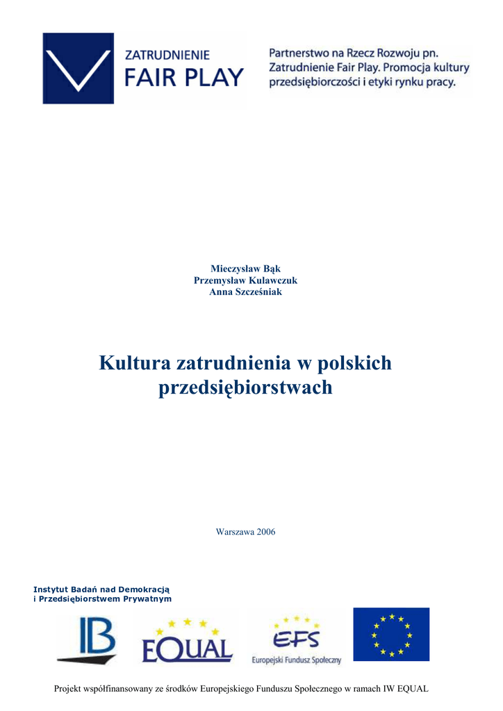 Mieczysław Bąk Przemysław Kulawczuk Anna Szcześniak Kultura zatrudnienia w polskich przedsiębiorstwach Warszawa 2006 Projekt współfinansowany ze środków Europejskiego Funduszu Społecznego w ramach IW EQUAL 2 Spis treści Wprowadzenie.......…………………………………………………........................................................ 1. Stereotypy w zatrudnieniu i ich wpływ na dyskryminację pracowników w polskich przedsiębiorstwach (Mieczysław Bąk) …………………………………………………… 1.1. Istota stereotypów w zatrudnieniu ………………………………….................................................. 1.2. Stereotypy związane z przyswajaniem nowych umiejętności ……………………………………… 1.3. Grupy pracowników stwarzających największe trudności w zatrudnieniu ………………………… 1.4. Stereotypy w zakresie motywacji do pracy ………………………………………………………… 1.5. Stereotypy w zakresie gotowości zaangażowania pracowników w pracę ………………………….. 1.6. Dyskryminacja w ramach zatrudniania nowych pracowników …….................................................. 1.7. Dyskryminacja w zakresie formy zawierania umowy o pracę ……………………………………... 1.8. Zagrożenie zwolnieniami w warunkach restrukturyzacji przedsiębiorstw …………………………. 1.9. Podsumowanie i wnioski …………………………………………………………………………… 2. Kultura rekrutacji w polskich przedsiębiorstwach (Anna Szcześniak)…………………………... 2.1. Miejsce rekrutacji w systemie zarządzania zasobami ludzkimi ……………………………………. 2.2. Sposoby poszukiwania nowych pracowników przez polskie przedsiębiorstwa…………………….. 2.3. Kryteria poszukiwania pracowników ………………………………………………………………. 2.4. Praktyka rozmów kwalifikacyjnych w polskich przedsiębiorstwach ………………………………. 2.5. Czynniki decydujące o przyjęciu do pracy …………………………………………………………. 2.6. Powiadamianie o wynikach rekrutacji ……………………………………………………………… 2.7. Podsumowanie i wnioski …………………………………………………………………………… 3. Elementy kultury zarządzania zasobami ludzkimi w polskich przedsiębiorstwach (Przemysław Kulawczuk) ………………............................................................................................ 3.1. Zasada równych szans ……………………………………………………………………………… 3.2. Formy zawierania umów o pracę z nowymi pracownikami ………………………………………... 3.3. Zakres szczegółowości umów o pracę ……………………………………………………………… 3.4. Formułowanie celów mierzalnych dla pracowników ………………………………………………. 3.5. Oceny okresowe pracowników ……………………………………………………………………... 3.6. Funkcjonowanie systemu kar i nagród w przedsiębiorstwach ……………………………………... 3.7. System nagród ……………………………………………………………………………………… 3.8. System kar ………………………………………………………….................................................. 3.9. Wnioski z analizy elementów kultury zarządzania polskimi przedsiębiorstwami………………….. 4. Rozwój osobisty pracowników w polskich przedsiębiorstwach (Mieczysław Bąk)……………… 4.1. Formy rozwoju osobistego pracowników dostępne w firmach …….................................................. 4.2. Systemy szkoleń ……………………………………………………………………………………. 4.3. Ustalanie problematyki szkoleń …………………………………………………………………….. 4.4. Badanie stopnia zadowolenia pracowników ………………………................................................... 4.5. Podsumowanie i wnioski……………………………………………………………………………. 5. Kultura organizacyjna polskich przedsiębiorstw (Anna Szcześniak)…………………………….. 5.1. Kultura organizacyjna w Polsce w okresie zmian ………………….................................................. 5.2. Strategiczne podejście do rozwoju zasobów ludzkich ………………................................................ 5.3. Kultura płatnicza w zakresie wypłaty wynagrodzeń ……………………………………………….. 5.4. Sposoby podejmowania decyzji kierowniczych ……………………………………………………. 5.5. Rozwiązywanie konfliktów w organizacji ………………………………………………………….. 5.6. Rola kodeksów etyki w kulturze organizacyjnej polskich przedsiębiorstw ………………………... 5.7. Podsumowanie i wnioski …………………………………………………………………………… 6. Metodologia badania i charakterystyka respondentów (Przemysław Kulawczuk)……………... 6.1. Metodologia badania ……………………………………………….................................................. 6.2. Charakterystyka respondentów ……………………………………................................................... 6.2.1. Pracownicy ……………………………………………………….................................................. 6.2.2. Menedżerowie kadrowi i przedsiębiorstwa przez nich reprezentowane………………………….. 7. Zarządzanie kapitałem ludzkim w polskich przedsiębiorstwach z punktu w