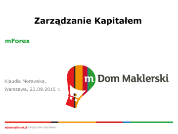 Zarządzanie Kapitałem mForex Klaudia Morawska, Warszawa, 23.09.2015 r. Zarządzanie kapitałem Rynek FX W skrócie FX, to międzynarodowy rynek walutowy. Jest to rynek międzybankowy, utworzony w roku 1971, kiedy to kursy walut w handlu międzynarodowym uległy transformacji ze stałych na zmienne. Oto niektóre niepowtarzalne cechy, które stanowią o jego sukcesie: •Pracują 24 godziny na dobę •Niezwykła płynność: dzienne obroty przekraczające 5.3 biliona dolarów, co ułatwia handel większością walut w trybie natychmiastowym •Wykonywanie transakcji kupna jak również sprzedaży •Możliwość skorzystania z dźwigni finansowej przy niskich wymogach depozytowych •Dostępność standardowych narzędzi pozwalających na kontrolę ryzyka •Doskonała Przejrzystość, Rynek Forex jest przejrzysty … wystarczy tylko być na bieżąco z informacjami. Zarządzanie kapitałem |2 Ważne pojęcia na Rynku FX Dużą rolę w odniesieniu sukcesu na Rynku FX odgrywa dobre przygotowanie, zrozumienie oraz zapoznanie się z terminologią stanowi duży plus dla każdego Inwestora. Cena rynkowa odnosi się do bieżącego kursu wymiany kwotowanej waluty w danym momencie. Pierwsza waluta w parze to waluta bazowa, podczas gdy druga określana jest mianem jej odpowiednika – kwotowana. Para walutowa jest kwotowana z dokładnością co do 1/100.000 (tj. co do 5 miejsca po przecinku); wyjątkiem są pary z jenem japońskim, gdzie kwotowanie jest dokonywane z dokładnością do 1/1 000 (tj. do 3 miejsca po przecinku). Spread różnica pomiędzy ceną sprzedaży a ceną kupna | Zarządzanie Kapitałem |3 BID i ASK BID - Kurs BID jest zawsze niższy od kursu ASK, a różnica pomiędzy tymi dwiema wartościami nosi nazwę spreadu transakcyjnego – rzeczywistego kosztu zawarcia transakcji. ASK – cena sprzedaży, zawsze wyższy od kursu BID. Transakcja BUY (pozycja długa) – otwarcie po ASK, zamknięcie po BID Transakcja SELL (pozycja krótka) – otwarcie po cenie BID, zamknięcie po cenie ASK Standardowo na wykresie platformy wyświetlany jest kurs BID Zarządzanie kapitałem Lot Lot jest standardową jednostką określającą wolumen transakcji. Standardowym rozmiarem lota jest 100.000 jednostek waluty bazowej. W transakcjach na rynku CFD standardowy rozmiar lota waha się od 10 do 10.000 kwotowanego instrumentu. Zarządzanie kapitałem Wymagany Depozyt Kwota środków wymagana do otwarcia pozycji. Margin jest obliczany w walucie bazowej, następnie przelutowywany na walutę rachunku. Do obliczenia wykorzystujemy poniższy algorytm: Dźwignia x Wielkość Transakcji x kurs EURPLN 1% x 100 000 EUR (1 lot) x kurs EURPLN 1 000 EUR x 4 (zakładamy kurs EURPLN) = 4 000 PLN Przykład: Transakcja 0.23 lota na EURUSD 1% x 0.23= 0.01 x 23 000 EUR 230 EUR x 4 = 920 PLN Zarządzanie kapitałem Wartość pipsa Pip Pips to najmniejsza możliwa zmiana wartości ceny. Dla większości par walut pipsem określamy 4 miejsce po przecinku. Wyjątkiem są pary z jenem japońskim, gdzie pips odnosi się do 2 liczby po przecinku. Punkt to dziesiąta część pipsa (0.00001) - 5 miejsce po przecinku Wartość pipsa Aby obliczyć wartość pipsa należy pomnożyć 1 pipsa przez wielkość lota. Wartość pipsa zawsze podajemy w walucie kwotowanej. W przypadku 1 lota EURUSD wartość 1 pipsa wynosi 10 USD, ponieważ: [0.0001] x [100 000 USD] = 10 USD (USD waluta kwotowana) Waluta każdego rachunku w mForex jest PLN, zatem wartość pipsa należy pomnożyć przez obecny kurs USDPLN. Zarządzanie kapitałem |7 Elementy zarządzania kapitałem 1) Dźwignia finansowa; 2) Otwarcie pozycji – jak dużą pozycję otworzyć (wolumen); 4) Obrona pozycji - Stop Loss; 5) Obrona zysku – przestawianie S/L lub T/P; 6) Wyjście z transakcji – po zrealizowaniu planu Zarządzanie kapitałem Jak ustalić wolumen transakcji i wielkość Ryzyka kapitał na rachunku: 10.000 PLN; zaangażowanie inwestora 30%; maksymalna strata 4%; rynek eur/usd, (eurpln=4.2000; usdpln=3.0000). 1) ILE LOTÓW MOGĘ KUPIĆ/SPRZEDAĆ? 2) ILE PUNKTÓW POWINIEN WYNOSIĆ STOP LOSS? | Tytuł Prezentacji |9 ROZWIĄZANIE ILE LOTÓW MOGĘ KUPIĆ/SPRZEDAĆ? Kwota na depozyt: 3.000 PLN Kwota potrzebna na 1 lota EURUSD: (1000eur) 4.200 PLN 3.000/4.200=0.71 w przybliżeniu 0.7 lota; ILE PUNKTÓW POWINIEN WYNOSIĆ STOP LOSS? Wartość 1punkt przy 0.7 lota = 7 usd 7USD * 3PLN= 21 PLN Wartość straty 4%*10000=400PLN 400/21=19 punktów. | Tytuł Prezentacji | 10 Dźwignia finansowa To możliwość zwielokrotnienia swoich dochodów dzięki mechanizmowi depozytów który jest procentową wartością nominalnej wartości kontraktu. Mała zmiana kursu kontraktu Zarządzanie Kapitałem Duża procentowa zmiana środków w depozycie | 11 Wielkość depozytu Wzór na wyliczanie rzeczywistej wartości kontraktu: loty = wielkość kontraktu x cena rynkowa 1 lot x EUR/USD = 100.000 Euro 1 Lot x Srebra = 2000 x 16.554 = 33108 USD Wyliczanie wielkości wymaganego depozytu: loty = wielkość kontraktu x dźwignia. 1 lot EUR/USD = 100.000 euro x 1% = 1000 euro 1 lot Srebra = (2000 uncji x 16.554 USD) x 2%= = 662.16 USD Zarządzanie kapitałem Definicje – Handel na MT4 Saldo rachunku (Balance) – stan środków pieniężnych na rachunku inwestora Saldo rejestru operacyjnego (Equity) – stan środków pieniężnych na rachunku Inwestora z uwzględnieniem zysków lub strat z otwartych pozycji rynkowych. Wymagany depozyt Margin – wielkość depozytu pobranego z rachunku Inwestora w celu zabezpieczenia otwartych pozycji na rynku. Depozyt jest zwracany na rachunek Inwestora w momencie zamknięcia pozycji. Wolne środki FreeMargin wielkość środków, które mogą posłużyć jako zabezpieczenie nowo otwieranych pozycji. Jeśli Balance>Equity, to Free Margin = Equity - Margin, Jeśli Balance<Equity, to Free Margin = Balance - Margin. Poziom zabezpieczenia (Margin level) - wartość wynikająca z podzielenia Equity przez Margin. Wartość Margin level równa 100% mówi, iż c