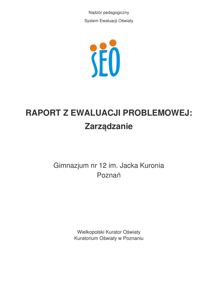 Nadzór pedagogiczny System Ewaluacji Oświaty RAPORT Z EWALUACJI PROBLEMOWEJ: Zarządzanie Gimnazjum nr 12 im. Jacka Kuronia Poznań Wielkopolski Kurator Oświaty Kuratorium Oświaty w Poznaniu Przebieg ewaluacji: Prezentowany raport jest rezultatem ewaluacji zewnętrznej przeprowadzonej w szkole (lub placówce) przez wizytatorów do spraw ewaluacji. Raport z ewaluacji problemowej dotyczy jednego z przedstawionych poniżej obszarów. Ewaluacja polega na zbieraniu i analizowaniu informacji: o efektach działalności dydaktycznej, wychowawczej i opiekuńczej oraz innej działalności statutowej szkoły lub placówki (na podstawie danych informujących o wynikach pracy szkoły (lub placówki) odzwierciedlonych w umiejętnościach, zachowaniach, postawach, działaniach uczniów i w osiąganych przez nich rezultatach na różnego rodzaju testach, egzaminach), o procesach zachodzących w szkole lub placówce (na podstawie danych, które informują o procesach i działaniach zachodzących i podejmowanych w szkole (lub placówce), a decydujących o sposobie funkcjonowania, charakterze szkoły (lub placówki) i przede wszystkim prowadzących do pożądanych efektów), o funkcjonowaniu szkoły lub placówki w środowisku lokalnym, w szczególności w zakresie współpracy z rodzicami uczniów (na podstawie danych informujących o sposobie współpracy ze środowiskiem i funkcjonowaniu w środowisku oraz wykorzystaniu tych zasobów w procesie nauczania i uczenia się), o zarządzaniu szkołą lub placówką (na podstawie danych informujących o sposobach zarządzania decydujących o jakości działań podejmowanych w szkole lub placówce). Ewaluacja ma na celu zebranie informacji i ustalenie poziomu spełniania przez szkołę lub placówkę wymagań zawartych w załączniku do Rozporządzenia Ministra Edukacji Narodowej z dnia 7 października 2009 r. w sprawie nadzoru pedagogicznego. Szkoła lub placówka może spełniać te wymagania na pięciu poziomach: Poziom E - oznaczający niski stopień wypełniania wymagania przez szkołę lub placówkę. Poziom D - oznaczający podstawowy stopień wypełniania wymagania przez szkołę lub placówkę. Poziom C - oznaczający średni stopień wypełniania wymagania przez szkołę lub placówkę. Poziom B - oznaczający wysoki stopień wypełniania wymagania przez szkołę lub placówkę. Poziom A - oznaczający bardzo wysoki stopień wypełniania wymagania przez szkołę lub placówkę. Raport z ewaluacji: Gimnazjum nr 12 im. Jacka Kuronia 2 / 14 Opis metodologii: Badanie zostało zrealizowane w dniach 23-01-2012 - 25-01-2012 przez zespół wizytatorów ds. ewaluacji, w skład którego weszli Wiesława Grabczyńska, Julitta Włodarczyk, Anetta Szurkowska. W trakcie ewaluacji w placówce zbierano informacje pochodzące z wielu źródeł - dyrektora, uczących w szkole nauczycieli, innych pracowników, uczniów, rodziców, partnerów szkoły i przedstawicieli samorządu lokalnego. Do gromadzenia danych wykorzystano metody ilościowe (ankiety w wersji elektronicznej i papierowej), jakościowe (wywiady indywidualne, grupowe, obserwację i analizę źródeł zastanych). Zestawienie metod, technik doboru próby i liczby osób, które wzięły udział w badaniach znajduje się w tabeli poniżej. Wywiady grupowe zostały przeprowadzone po realizacji i analizie ankiet, pełniąc wobec nich funkcję wyjaśniającą. Kategoria Metoda/technika badanych/źródła danych Dyrektor szkoły Indywidualny wywiad pogłębiony Nauczyciele Ankieta elektroniczna (CAWI) "Szkoła, w której pracuję" Wywiad grupowy zogniskowany (FGI) Pracownicy niepedagogiczni Uczniowie Rodzice Partnerzy szkoły, przedstawiciele samorządu lokalnego Obserwacja lekcji Obserwacja szkoły Analiza dokumentów Sposób doboru próby Wielkość próby nd nd Badanie na próbie pełnej Nauczyciele zróżnicowani pod względem stażu, nauczanego przedmiotu i pracy w zespołach zadaniowych oraz pedagog szkolny Wywiad grupowy Pracownicy inni niż zogniskowany (FGI) nauczyciele Ankieta elektroniczna Badanie na próbie pełnej (CAWI) "Moja szkoła" uczniów klas rok niższych od najstarszych Ankieta elektroniczna Badanie na próbie pełnej (CAWI) "Mój dzień" uczniów najstarszych klas Wywiad grupowy Przedstawiciele trzech zogniskowany (FGI) ostatnich roczników, dobrani losowo Wywiad grupowy Przedstawiciele rady zogniskowany (FGI) rodziców i rad klasowych, reprezentujący różne roczniki Ankieta audytoryjna (PAPI) Badanie na próbie pełnej rodziców uczniów klas rok niższych od najstarszych Wywiad grupowy Przedstawiciele samorządu zogniskowany (FGI) lokalnego i instytucji wskazanych przez dyrektora jako partnerzy Klasy pierwsze (gimnazja i szkoły ponadgimnazjalne) Na zewnątrz, przed i po lekcjach, podczas przerw, podczas zajęć pozalekcyjnych Raport z ewaluacji: Gimnazjum nr 12 im. Jacka Kuronia 48 8 5 201 0 8 8 310 5 nd nd 3 / 14 Informacja o placówce Nazwa placówki Gimnazjum nr 12 im. Jacka Kuronia Patron im.Jacka Kuronia Typ placówki Gimnazjum Miejscowość Poznań Ulica Osiedle Stefana Batorego Numer 101 Kod pocztowy 60-687 Urząd pocztowy Poznań Telefon 618217131 Fax Www gimnazjum12.pl Regon 63963173400000 Publiczność publiczna Kategoria uczniów Dzieci lub młodzież Charakter brak specyfiki Uczniowie, wychow., słuchacze 677 Oddziały 25 Nauczyciele pełnozatrudnieni 61 Nauczyciele niepełnozat. (stos.pracy) 13 Nauczyciele niepełnozat._(w etatach) 9 Średnia liczba uczących się w oddziale 27.08 Liczba uczniów przypadających na jednego pełnozatrudnionego nauczyciela 11.1 Województwo WIELKOPOLSKIE Powiat Poznań Gmina Poznań Typ gminy gmina miejska Liczba mieszkańców Wysokość wydatków na oświatę Stopa bezrobocia Raport z ewaluacji: Gimnazjum nr 12 im. Jacka Kuronia 4 / 14 Wprowadzenie: obraz placówki Zapraszamy Państwa do zapoznania się z treścią raportu z przeprowadzonej w dniach 23 – 25 stycznia 2012 r. przez wizytatorów Kuratorium Oświaty w Poznaniu ewaluacji zew