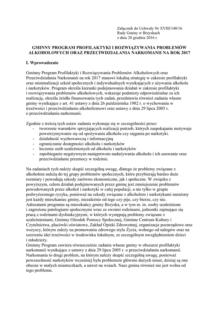 Załącznik do Uchwały Nr XVIII/140/16 Rady Gminy w Brzyskach z dnia 28 grudnia 2016 r. GMINNY PROGRAM PROFILAKTYKI I ROZWIĄZYWANIA PROBLEMÓW ALKOHOLOWYCH ORAZ PRZECIWDZIAŁANIA NARKOMANII NA ROK 2017 I. Wprowadzenie Gminny Program Profilaktyki i Rozwiązywania Problemów Alkoholowych oraz Przeciwdziałania Narkomanii na rok 2017 stanowi lokalną strategię w zakresie profilaktyki oraz minimalizacji szkód społecznych i indywidualnych wynikających z używania alkoholu i narkotyków. Program określa kierunki podejmowania działań w zakresie profilaktyki i rozwiązywania problemów alkoholowych, wskazuje podmioty odpowiedzialne za ich realizację, określa źródła finansowania tych zadań, przedstawia również zadania własne gminy wynikające z art. 41 ustawy z dnia 26 października 1982 r. o wychowaniu w trzeźwości i przeciwdziałaniu alkoholizmowi oraz ustawy z dnia 29 lipca 2005 r. o przeciwdziałaniu narkomanii. Zgodnie z treścią tych ustaw zadania wykonuje się w szczególności przez: - tworzenie warunków sprzyjających realizacji potrzeb, których zaspokajanie motywuje powstrzymywanie się od spożywania alkoholu czy sięgania po narkotyki. - działalność wychowawczą i informacyjną - ograniczanie dostępności alkoholu i narkotyków - leczenie osób uzależnionych od alkoholu i narkotyków - zapobieganie negatywnym następstwom nadużywania alkoholu i ich usuwanie oraz przeciwdziałanie przemocy w rodzinie. Na zadaniach tych należy skupić szczególną uwagę, dlatego że problemy związane z alkoholem należą do tej grupy problemów społecznych, które przybierają bardzo duże rozmiary i powodują szkody zarówno ekonomiczne, jak i społeczne. W związku z powyższym, celem działań podejmowanych przez gminę jest zmniejszenie problemów powodowanych przez alkohol i narkotyki w całej populacji, a nie tylko w grupie podwyższonego ryzyka, ponieważ na szkody związane z alkoholem i narkotykami narażony jest każdy mieszkaniec gminy, niezależnie od tego czy pije, czy bierze, czy nie. Adresatami programu są mieszkańcy gminy Brzyska, a w tym m. in. osoby uzależnione i zagrożone patologiami społecznymi wraz ze swoimi rodzinami, jednostki zajmujące się pracą z rodzinami dysfunkcyjnymi, w których występują problemy związane z uzależnieniami, Gminny Ośrodek Pomocy Społecznej, Gminne Centrum Kultury i Czytelnictwa, placówki oświatowe, Zakład Opieki Zdrowotnej, organizacje pozarządowe oraz wszyscy, którym zależy na promowaniu zdrowego stylu Życia, wolnego od nałogów oraz na szerzeniu idei trzeźwości w środowisku lokalnym, ze szczególnym uwzględnieniem dzieci i młodzieży. Gminny Program zawiera równocześnie zadania własne gminy w obszarze profilaktyki narkomanii wynikające z ustawy z dnia 29 lipca 2005 r. o przeciwdziałaniu narkomanii. Narkomania to drugi problem, na którym należy skupić szczególną uwagę, ponieważ powszechność narkotyków wcześniej była problemem głównie dużych miast, dzisiaj są one obecne w małych miasteczkach, a nawet na wsiach. Nasz gmina również nie jest wolna od tego problemu. II. Diagnoza problemów uzależnień w gminie Brzyska Gminy, z racji dysponowania największą wiedzą o problemach swoich społeczności, a także o dostępnych zasobach, mogą przedsięwziąć środki zaradcze oraz naprawcze skierowane do lokalnej społeczności. Konkretne działania profilaktyczne wymagają wiedzy o rozmiarach i charakterze zjawiska. Skala zjawiska uzależnienia od alkoholu na terenie gminy jest jednak trudna do precyzyjnego określenia, a poziom spożycia alkoholu, jak i rozpowszechnienie szkodliwych następstw picia, są różne w zależności od środowiska. Problemy związane z alkoholem to: duża dostępność fizyczna i ekonomiczna alkoholu: W gminie Brzyska znajduje się łącznie 12 punktów sprzedaży napojów alkoholowych i według oficjalnych oświadczeń składanych w Urzędzie Gminy przez podmioty gospodarcze w roku 2015 sprzedano alkoholu za kwotę 2 133.996,98 zł. III. Cele Celem Programu w 2017 roku jest: 1. Rozpoznawanie problemów na terenie gminy oraz potrzeb lokalnego środowiska w zakresie pomocy w ich rozwiązywaniu; 2. Zapobieganie powstawaniu nowych problemów: - poszerzanie wiedzy społeczności lokalnej ukierunkowanej na zwrócenie uwagi na problem używania alkoholu i narkotyków przez dzieci i młodzież , - poszerzanie umiejętności rodziców w zakresie ich kompetencji wychowawczych w obszarze profilaktyki zachowań ryzykownych dzieci, - poszerzanie wiedzy osób zajmujących się działaniami profilaktycznymi na temat szkodliwości alkoholu, narkotyków oraz obowiązujących w tym zakresie przepisów prawa; 3. Zmniejszenie rozmiarów problemów, które aktualnie występują: - stwarzanie warunków do prawidłowego funkcjonowania dzieci i młodzieży z rodzin z problemem alkoholowym, narkotykowym i dotkniętych przemocą domową oraz wyrównywanie ich szans, - zwiększanie kompetencji osób pomagających dzieciom i pracujących z rodzinami dotkniętymi problemem uzależnień, - poprawa funkcjonowania dorosłych członków rodzin osób uzależnionych oraz pijących szkodliwie i ryzykownie; 4. Zwiększenie zasobów niezbędnych do radzenia sobie z istniejącymi problemami: - zwiększanie dostępności pomocy terapeutycznej i rehabilitacyjnej dla osób uzależnionych od alkoholu i narkotyków, osób współuzależnionych oraz osób uwikłanych w przemoc, - poszerzanie wiedzy na temat szkód zdrowotnych wynikających z picia szkodliwego oraz uzależnienia od alkoholu i narkotyków, w tym wspieranie instytucji zajmujących się problematyką uzależnień; 5. Edukacja publiczna w zakresie: - informowania o konsekwencjach nadużywania alkoholu i narkotyków, - promocji zdrowego stylu życia, trzeźwości i abstynencji 6. Działalność profilaktyczna polegająca na wspieraniu klubów sportowych działających na terenie gminy, również finansowo, gdyż krzewienie kultury fiz