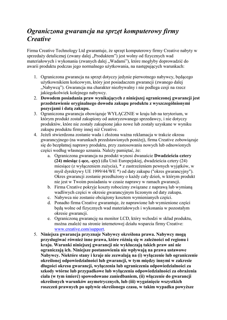 Firma Creative Technology Ltd gwarantuje, że sprzęt komputerowy firmy Creative nabyty w