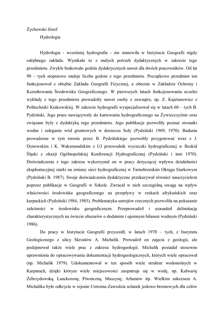Żychowski Józef Hydrologia Hydrologia - wcześniej hydrografia - nie stanowiła w Instytucie Geografii nigdy odrębnego zakładu. Wynikało to z małych potrzeb dydaktycznych w zakresie tego przedmiotu. Zwykle brakowało godzin dydaktycznych nawet dla dwóch pracowników. Od lat 90 – tych stopniowo maleje liczba godzin z tego przedmiotu. Początkowo przedmiot ten funkcjonował z obrębie Zakładu Geografii Fizycznej, a obecnie w Zakładzie Ochrony i Kształtowania Środowiska Geograficznego. W pierwszych latach funkcjonowania uczelni wykłady z tego przedmiotu prowadziły nawet osoby z zewnątrz, np. Z. Kajetanowicz z Politechniki Krakowskiej. W zakresie hydrografii wyspecjalizował się w latach 60 – tych B. Pydziński. Jego prace nawiązywały do kartowania hydrograficznego na Żywiecczyźnie oraz związane były z dydaktyką tego przedmiotu. Jego publikacje pozwoliły poznać stosunki wodne i zaleganie wód gruntowych w dorzeczu Soły (Pydziński 1969, 1970). Badania prowadzone w tym terenie przez B. Pydzińskiego pozwoliły przygotować wraz z J. Dynowskim i K. Waksmundzkim z UJ przewodnik wycieczki hydrograficznej w Beskid Śląski z okazji Ogólnopolskiej Konferencji Hydrograficznej (Pydziński i inni 1970). Doświadczenia z tego zakresu wykorzystał on w pracy dotyczącej wpływu działalności eksploatacyjnej siarki na zmiany sieci hydrograficznej w Tarnobrzeskim Okręgu Siarkowym (Pydziński B. 1987). Swoje doświadczenia dydaktyczne przekazywał również nauczycielom poprzez publikacje w Geografii w Szkole. Zwracał w nich szczególną uwagę na wpływ właściwości środowiska geograficznego na przepływy w rzekach afrykańskich oraz karpackich (Pydziński 1984, 1985). Problematyka ustrojów rzecznych pozwoliła na pokazanie zależności w środowisku geograficznym. Przeprowadził i uzasadnił delimitację charakterystycznych na świecie obszarów o dodatnim i ujemnym bilansie wodnym (Pydziński 1986). Do pracy w Instytucie Geografii przyszedł, w latach 1970 – tych, z Instytutu Geologicznego z ulicy Skrzatów A. Michalik. Prowadził on zajęcia z geologii, ale podejmował także wiele prac z zakresu hydrogeologii. Michalik posiadał stosowne uprawnienia do opracowywania dokumentacji hydrogeologicznych, których wiele opracował (np. Michalik 1979). Udokumentował w ten sposób wiele struktur wodonośnych w Karpatach, dzięki którym wiele miejscowości zaopatruje się w wodę, np. Kalwarię Żebrzydowską, Lanckoronę, Piwniczną, Muszynę, Arłamów itp. Wielkim sukcesem A. Michalika było odkrycie w rejonie Ustronia-Zawodzia solanek jodowo-bromowych dla celów kąpielowych oraz wody pitnej solanki wodorowęglanowej (Michalik 1972). Dzięki tym badaniom Ustroń uzyskał status uzdrowiska. Przedmiotem badań profesora były również wody mineralne Krakowa, Żywca, a nawet polskiej części Karpat Zachodnich (np. Michalik 1982). Pracował także nad metodyką badań hydrogeologicznych otworów studziennych w karpackim fliszu (Michalik 1969). Zaproponował nową metodę graficznego przedstawienia składu chemicznego wód pitnych (Michalik 1974). Swoją wiedzą służył również innym krajom, np. Irakowi, gdzie pod jego kierunkiem opracowano warunki geologicznoinżynierskie pod rozbudowę miast. Jako wybitny praktyk opracowywał także stosunki wodne, np. Oświęcimia (Michalik 1975). Michalik pozostawił po sobie przeglądowe mapy hydrogeologiczne różnych arkuszy południowej Polski wraz z objaśnieniami (np. Michalik 1968). Mocno angażował się w proces dydaktyczny. Prowadził społecznie wiele poznawczych wyjazdów geografów w teren, szczególnie w Pieniny i Tatry. Jednak opublikował niewiele takich wycieczek (Michalik 1963). Prace hydrologiczne, najczęściej z pogranicza geomorfologii, publikował także J. Lach. Badał on zmiany stosunków wodnych w Beskidzie Niskim wywołanych gospodarczą działalnością człowieka (Lach 1972, 1975). Szczególną uwagę zwrócił na zmiany w użytkowaniu ziemi, które zmieniły obieg wody i wpływają współcześnie na procesy erozyjne w korytach potoków. Rozpoczął również, na początku lat 90 – tych, rozwijane później przez współpracowników badania jakości wody. Pierwsza tego rodzaju praca została napisana wraz z A. Michalikiem i dotyczyła wód mineralnych Swoszowic (Michalik, Lach 1991). Badał także wraz z A. Michalikiem i F. Pulitem, końcem lat 80 – tych, warunki hydrogeologiczne województwa tarnowskiego. Na tej podstawie wydali oni interesującą monografię (Michalik, Lach, Pulit 1981). Lach pisał o gospodarce wodnej miast w bardzo licznych monografiach miast południowo-wschodniej Polski, o których wspomniano w innych rozdziałach. Szczegółowo badał również ten problem w Nowym Sączu (Lach 1997). Liczne jego prelekcje dla młodzieży, które zwracały uwagę na racjonalne gospodarowanie wodą, zaowocowały również opracowaniem dotyczącym zasobów wodnych Polski (Lach 1994). Podjął również badania dotyczące powodzi w karpackiej części dorzecza Wisłoki w związku ze wzrostem częstotliwości gwałtownych wezbrań na terenie Polski (Lach 1999). Poza historycznym ujęciem tego zagadnienia odniósł się w tej pracy do przyczyn tego ekstremalnego zjawiska. Szczególnie analizował przyczyny i skutki powodzi, która wystąpiła w lipcu 2001 roku na Sądecczyźnie (Lach 2003). Badał także wraz z E. Brzeźniakiem nieregularność miar odpływu w dorzeczu Wisłoka w drugiej połowie XX wieku (Lach, Brzeźniak 2002). Dla tego samego okresu określili oni również wpływ warunków pluwialnych na reżim hydrologiczny Wisłoka (Lach, Brzeźniak 2003). Lach rozpoczął także badania geomorfologiczne, omówione w innym rozdziale, które dotyczyły wpływu czynnika antropogenicznego na kształtowanie środowiska geograficznego. Problemem tym zainteresował również J. Żychowskiego, który koncentrował się nad wpływem użytkowania terenu na odpływy w małych zlewniach. Żychowski