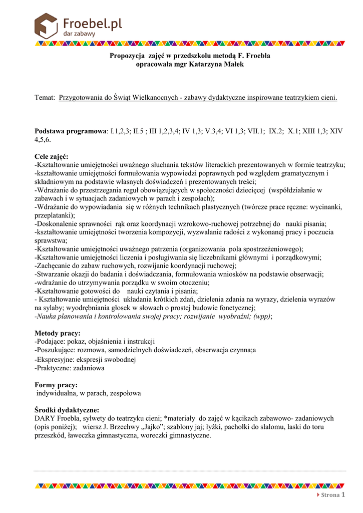 Propozycja zajęć w przedszkolu metodą F. Froebla opracowała mgr Katarzyna Małek Temat: Przygotowania do Świąt Wielkanocnych - zabawy dydaktyczne inspirowane teatrzykiem cieni. Podstawa programowa: I.1,2,3; II.5 ; III 1,2,3,4; IV 1,3; V.3,4; VI 1,3; VII.1; IX.2; X.1; XIII 1,3; XIV 4,5,6. Cele zajęć: -Kształtowanie umiejętności uważnego słuchania tekstów literackich prezentowanych w formie teatrzyku; -kształtowanie umiejętności formułowania wypowiedzi poprawnych pod względem gramatycznym i składniowym na podstawie własnych doświadczeń i prezentowanych treści; -Wdrażanie do przestrzegania reguł obowiązujących w społeczności dziecięcej (współdziałanie w zabawach i w sytuacjach zadaniowych w parach i zespołach); -Wdrażanie do wypowiadania się w różnych technikach plastycznych (twórcze prace ręczne: wycinanki, przeplatanki); -Doskonalenie sprawności rąk oraz koordynacji wzrokowo-ruchowej potrzebnej do nauki pisania; -kształtowanie umiejętności tworzenia kompozycji, wyzwalanie radości z wykonanej pracy i poczucia sprawstwa; -Kształtowanie umiejętności uważnego patrzenia (organizowania pola spostrzeżeniowego); -Kształtowanie umiejętności liczenia i posługiwania się liczebnikami głównymi i porządkowymi; -Zachęcanie do zabaw ruchowych, rozwijanie koordynacji ruchowej; -Stwarzanie okazji do badania i doświadczania, formułowania wniosków na podstawie obserwacji; -wdrażanie do utrzymywania porządku w swoim otoczeniu; -Kształtowanie gotowości do nauki czytania i pisania; - Kształtowanie umiejętności układania krótkich zdań, dzielenia zdania na wyrazy, dzielenia wyrazów na sylaby; wyodrębniania głosek w słowach o prostej budowie fonetycznej; -Nauka planowania i kontrolowania swojej pracy; rozwijanie wyobraźni; (wpp); Metody pracy: -Podające: pokaz, objaśnienia i instrukcji -Poszukujące: rozmowa, samodzielnych doświadczeń, obserwacja czynna;a -Ekspresyjne: ekspresji swobodnej -Praktyczne: zadaniowa Formy pracy: indywidualna, w parach, zespołowa Środki dydaktyczne: DARY Froebla, sylwety do teatrzyku cieni; *materiały do zajęć w kącikach zabawowo- zadaniowych (opis poniżej); wiersz J. Brzechwy „Jajko”; szablony jaj; łyżki, pachołki do slalomu, laski do toru przeszkód, ławeczka gimnastyczna, woreczki gimnastyczne. Strona 1 Przebieg zajęć: PORANNE KOŁO 1. Wyciszanka: Czas na teatrzyk, pora na skupienie, Zaraz na tej scenie wystąpią cienie. Wytęż więc wzrok, wyostrz swój słuch, byś jak najwięcej zapamiętać mógł. Wyprostuj plecy, usiądź wygodnie, Tak byś w teatrze poczuł się swobodnie. Dotknij swej głowy, Pomasuj uszy, Na usta swoje połóż paluszek…(K. Małek) 2. „Jajko”- J. Brzechwa- teatrzyk cieni. Było sobie raz jajko mądrzejsze od kury. Kura wyłazi ze skóry, Prosi, błaga, namawia: "Bądź głupsze!" Lecz co można poradzić, kiedy ktoś się uprze? Kura martwi się bardzo i nad jajkiem gdacze, A ono powiada, że jest kacze. Kura prosi serdecznie i szczerze: "Nie trzęś się, bo będziesz nieświeże." A ono właśnie się trzęsie I mówi, że jest gęsie. Kura do niego zwraca się z nauką, Że jajka łatwo się tłuką, A ono powiada, że to bajka, Bo w wapnie trzyma się jajka. Kura czule namawia: "Chodź, to cię wysiedzę." A ono ucieka za miedzę, Kładzie się na grządkę pustą I oświadcza, że będzie kapustą. Kura powiada: "Nie chodź na ulicę, Bo zrobią z ciebie jajecznicę." A jajko na to najbezczelniej: "Na ulicy nie ma patelni." Kura mówi: "Ostrożnie! To gorąca woda!" A jajko na to: "Zimna woda! Szkoda!" Wskoczyło do ukropu z miną bardzo hardą I ugotowało się na twardo. Strona 2 Rozmowa kierowana na podstawie treści teatrzyku. Kto wystąpił w przedstawieniu? O co prosiła mama kura? Jak zachowywało się jajko? Dlaczego należy słuchać rodziców? Pytanie problemowe: Co było na świecie pierwsze- jajko czy kura? (można polecić dzieciom, by zapytały o opinię rodziców- zadanie domowe). 3. Zabawa ruchowa: „Niech jajko nie spadnie”. Przenoszenie piłeczek z daru 1. na łyżkach – tor przeszkód (pachołki, laski gimnastyczne, ławeczka, woreczki). 4. Burza mózgów: Co można zrobić z jajka? Do czego są wykorzystywane? Prezentacja rymowanki (ilustrowanie gotowymi sylwetami, ozdobionymi zgodnie z treścią): Pisanki Poprosiłam dwie koleżanki, By ozdobiły ze mną pisanki. Pierwsza niech będzie w niewielkie kropki, Druga ozdobiona jest w stokrotki. Na trzeciej są w same gwiazdeczki, Czwarta ubrana w wijące wstążeczki. Piąta jest w kratkę a w paski szósta, Siódma pisanka zupełnie pusta. Ósma zdobiona jest kokardkami, Dziewiątą może ozdobicie sami? (K. Małek) - praca w parach (czas 5’)- ozdabianie wyciętych jajek z kartonu dowolnymi darami wg pomysłu dzieci -liczenie za pomocą liczebników głównych i porządkowych (przyporządkowywanie cyfr w odpowiedniej kolejności- dar 5p) *** (dla dzieci, które wcześniej skończyły swoje zadanie) układanie od najmniejszego do największego i odwrotnie (prawo serii); 5. Prezentacja pisanek- układanek. Porządkowanie stanowisk pracy. Praca w grupach: Grupa Darów: układanie z darów „podpisów” do obrazków (reprezentacje)- jajko, kura, baranek, sól, palma, woda sylaby: kwadraty z mozaiki- dar 7. głoski: punkty- dar 10. zdanie: najdłuższy patyczek (dzieci układają zdanie z nazwą obrazka); krótsze patyczki symbolizują słowa w zdaniu- dar 8. Inne propozycje: Wielkanocne mazurki- układanie z darów Froebla i darów natury inspirowane ilustracjami zachowaniem symetrii (na powierzchni prostokąta). Grupa Badawcza: „Czy jajko pływa?”- zanurzanie jajka w wodzie i roztworze wody z solą; zabawy badawcze z jajkami ugotowanymi na twardo i surowymi. „Które z jajek jest ugotowane na twardo?”- doświadczenia z wodą; obracanie jajka na powierzchni płaskiej. Strona 3 Inne propozycje: „Pisanki – obracanki”- przygotowanie doświadczenia: na patyczku mocuj