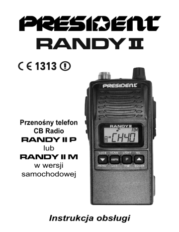 Przenośny telefon CB Radio RANDY II P lub RANDY II M w wersji samochodowej Instrukcja obsługi SPIS TREŚCI RANDY II - MOBILE......................................................................................................4 RANDY II P....................................................................................................................6 ELEMENTY STROJENIA I FUNKCJE...........................................................................6 WYŚWIETLACZ LCD Z IKONAMI.................................................................................7 OPIS FUNKCJI..............................................................................................................8 CHARAKTERYSTYKA TECHNICZNA........................................................................14 PODSTAWOWE PROBLEMY I SPOSOBY ICH ROZWIĄZYWANIA..........................14 SPOSÓB NADAWANIA I ODBIERANIA KOMUNIKATÓW GŁOSOWYCH.................15 TERMINOLOGIA.........................................................................................................15 DEKLARACJA ZGODNOŚCI......................................................................................17 ZOBOWIĄZANIA GWARANTA....................................................................................18 TABELA CZĘSTOTLIWOŚCI............................................................................. 21 ~ 23 TABELA NORMY-F......................................................................................................24 Zawartość opakowania: M P w wersji mobilnej (samochodowej) w wersji przenośnej antena Akumulator litowo-jonowy Adapter z gniazdem antenowym i wtykiem do gniazda zapalniczki samochodowej Instrukcja obsługi Ładowarka 230V i Instrukcja obsługi 3 OSTRZEŻENIE! Zanim zaczniesz użytkować CB radio należy bezwzględnie podłączyć antenę (gniazdo PL wyprowadzone z adaptera) lub ustawić (tylko w wersji M) SWR (Współczynnik Fali Stojącej)! Nie spełnienie tego wymogu może prowadzić do uszkodzenia wzmacniacza mocy, co nie jest objęte gwarancją. Radioodbiornik spełnia wymagane prawem normy!! Patrz rozdział „F” na stronie 13 i Tabela NORMY-F na stronie 24. Gwarancja na ten radioodbiornik obowiązuje wyłącznie w kraju jego nabycia! Witamy w świecie łączności z nową generacją radioodbiorników CB. Nowe modele PRESIDENT dają ci dostęp do sprzętu CB o największych możliwościach. Dzięki najnowocześniejszej technologii, gwarantującej nieocenioną jakość, wasz PRESIDENT RANDY II stanowi nowy krok w komunikacji cywilnej oraz stanowi najlepszy wybór dla najbardziej wymagających profesjonalnych użytkowników CB radia. Aby mieć pewność właściwego wykorzystania możliwości sprzętu, przed zainstalowaniem i użytkowaniem PRESIDENT RANDY II zalecamy dokładne przeczytanie Instrukcji obsługi. A)RANDY II - MOBILE - konfiguracja w wersji mobilnej (samochodowej1) 1)INSTALACJA - Podłącz przewód anteny do gniazda antenowego wyprowadzonego z adaptera. - Podłącz wtyk zasilania do gniazda zapalniczki w samochodzie. - Zamocuj adapter w radioodbiorniku. Patrz ilustracje na stronie 13. 2)INSTALACJA ANTENY a)Wybór anteny - W przypadku CB Radio, obowiązuje zasada im dłuższa antena, tym lepsze efekty. Twój sprzedawca powinien doradzić jaka antena będzie dla Ciebie najlepsza. b)Antena samochodowa - Antena samochodowa musi być zamocowana na samochodzie w miejscu zapewniającym jak największą powierzchnię z podłoża metalicznego (płaszczyzna masy), z dala od relingów itp. 4 - Jeśli posiadasz już w samochodzie antenę do radiotelefonu, antena CB powinna być od niej wyższa. - Istnieją dwa rodzaje anten. Pierwszy typ to anteny wstępnie strojone fabrycznie, które powinny być stosowane na dobrze uziemionej powierzchni (np. dach samochodu lub pokrywa bagażnika). Drugi typ to anteny do strojenia, które odznaczają się większym zasięgiem i mogą być stosowane na mniejszej powierzchni uziemienia (patrz punkt 4, Ustawienie SWR). - W przypadku anten, które muszą być mocowane w wywierconym otworze, musisz zapewnić dobry kontakt elektryczny pomiędzy anteną a masą. W tym celu powierzchnię styku, gdzie będzie dokręcana śruba z podkładką trójkątną, należy oczyścić z lakieru. - Przy doprowadzeniu koncentrycznego przewodu antenowego należy uważać, aby go nie zgnieść ani docisnąć, gdyż może to prowadzić do jego uszkodzenia tj. przecięcia lub zwarcia. Charakterystyka promieniowania anteny w - Podłącz antenę do adaptera. zależności od miejsca montażu c)Antena bazowa - Antena bazowa powinna być zamontowana w taki sposób, aby nie była niczym przysłonięta. Jeśli mocowana jest do masztu, musi pozostawać w pozycji pionowej, zgodnie z obowiązującym prawem (należy zwrócić o fachową pomoc). Wszystkie anteny i wyposażenie PRESIDENT są projektowane w sposób zapewniający maksymalną sprawność przy współpracy z każdym CB radiem, dla którego są przeznaczone. 3)PODSTAWOWE OPERACJE DO WYKONANIA PRZED PIERWSZYM UŻYCIEM RADIOODBIORNIKA (przed próbą nadawania i przed użyciem przełącznika „push-to-talk naciśnij, aby nadawać”) a) Sprawdź podłączenie anteny. b) Włącz urządzenia przekręcając gałkę Power (12) w prawo. c) Wyłącz squelch - blokadę szumów w pozycję OFF - WYŁ. Patrz punkt 16.1. strona 11. d) Ustaw głośność na odpowiednim poziomie. e) Za pomocą przycisków wybierania kanałów, przejdź na kanał 20 (przyciski 5 i 8). 4)USTAWIENIE SWR (standing wave ratio - współczynnik fali stojącej) OSTRZEŻENIE: strojenie to musi być przeprowadzone kiedy CB radio jest używane po raz pierwszy (i za każdym razem kiedy zmianie ulega pozycja anteny). Strojenie należy przeprowadzać w miejscu wolnym od zakłócających przeszkód. * Strojenie za pomocą zewnętrznego miernika SWR (np. TOS-1 PRESIDENT) 5 a) Aby podłączyć miernik SWR: - Podłącz miernik SWR pomiędzy CB radiem i anteną możliwie najbliżej CB 