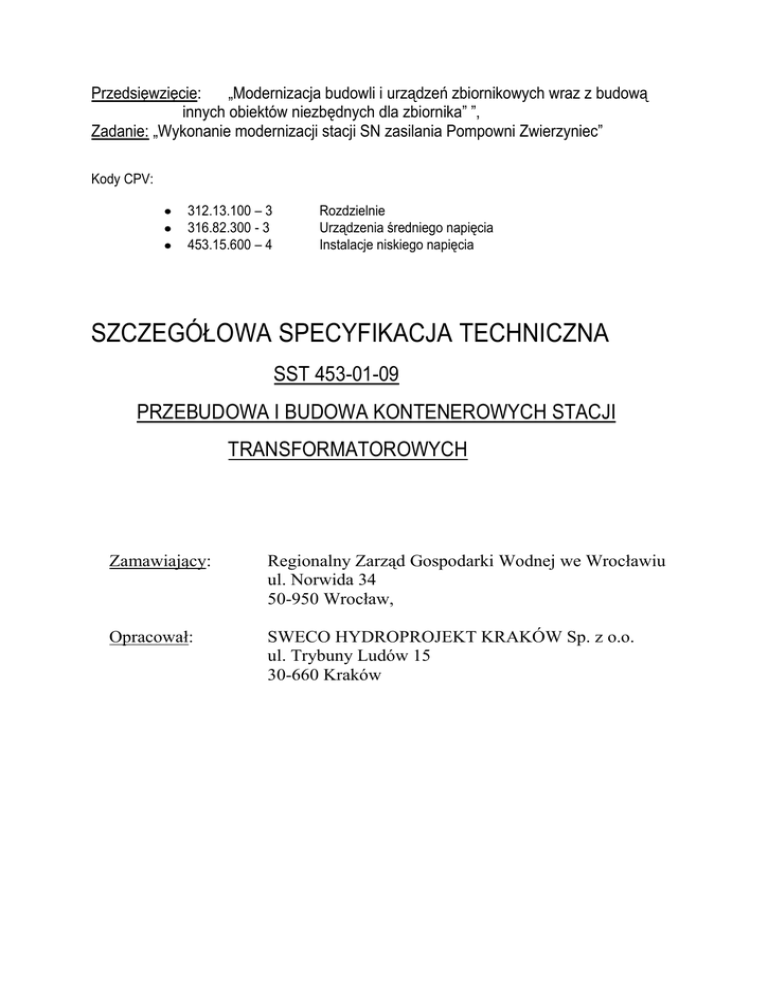 Przedsięwzięcie: „Modernizacja budowli i urządzeń zbiornikowych wraz z budową innych obiektów niezbędnych dla zbiornika” ”, Zadanie: „Wykonanie modernizacji stacji SN zasilania Pompowni Zwierzyniec” Kody CPV: 312.13.100 – 3 316.82.300 - 3 453.15.600 – 4 Rozdzielnie Urządzenia średniego napięcia Instalacje niskiego napięcia SZCZEGÓŁOWA SPECYFIKACJA TECHNICZNA SST 453-01-09 PRZEBUDOWA I BUDOWA KONTENEROWYCH STACJI TRANSFORMATOROWYCH Zamawiający: Regionalny Zarząd Gospodarki Wodnej we Wrocławiu ul. Norwida 34 50-950 Wrocław, Opracował: SWECO HYDROPROJEKT KRAKÓW Sp. z o.o. ul. Trybuny Ludów 15 30-660 Kraków 453-01-09 PRZEBUDOWA I BUDOWA KONTENEROWYCH STACJI TRANSFORMATOROWYCH 1. WSTĘP 1.1. Przedmiot Specyfikacji (S) Przedmiotem niniejszej Specyfikacji są wymagania dotyczące wykonania i odbioru robót związanych z modernizacją istniejącej stacji transformatorowej kontenerowej na pompowni Zwierzyniec. 1.2. Zakres stosowania Specyfikacji Specyfikacja jest stosowana jako dokument przetargowy i kontraktowy przy zlecaniu i realizacji robót wymienionych w pkt. 1.1. 1.3. Zakres robót objętych Specyfikacją Roboty, których dotyczy Specyfikacja obejmują wszystkie czynności umożliwiające i mające na celu wykonanie przebudowy stacji transformatorowej kontenerowej. W zakres prac wchodzą: - demontaż wkładek bezpiecznikowych w polach transformatorowych, - demontaż rozłączników bezpiecznikowych w polach transformatorowych, - demontaż szynoprzewodów w polach transformatorowych T1 i T2 (pomiędzy rozłącznikiem– demontowanym, a izolatorem przepustowym, - demontaż izolatorów przepustowych w polach transformatorowych T1 i T2, - demontaż szynoprzewodów pomiędzy izolatorem a zaciskami GN transformatora T1 i T2, - demontaż izolatorów wsporczych podtrzymujących szynoprzewody wraz z konstrukcją z kątowników mocowanych do ściany w komorze T1 i T2, - demontaż dwóch transformatorów olejowych, - demontaż szynoprzewodów między zaciskami strony DN transformatora a zaciskami śrubowymi na szynach nN w komorze T1 i T2, - demontaż istniejących żaluzji w drzwiach do komory T1 i T2, - demontaż istniejącego pokrycia dachowego z papy oraz obróbek blacharskich, - montaż rozłącznika bezpiecznikowego w komorze T1 i T2, - montaż napędu dźwigniowego na elewacji celki w polu transformatorowym T1 i T2, - montaż transformatorów, - montaż izolatorów wsporczych, - montaż szynoprzewodów w rozdzielni, - wykonanie instalacji wewnętrznej, - wykonanie połączeń w/w elementów, - wykonanie sprawdzeń i pomiarów elektrycznych, - wykonanie instalacji wentylacji komór T1 i T2, - wykonanie nawiewu kompensacyjnego w drzwiach do komór, - odmalowanie drzwi i elewacji stacji wraz z uzupełnieniem ubytków, - montaż pokrycia dachowego z papy termozgrzewalnej wraz z obróbką blacharską krawędzi, - porządkowanie terenu po wykonaniu prac. 1.4. Określenia podstawowe Określenia podane w Specyfikacji są zgodne z odpowiednimi normami. 1.4.1. Napięcie znamionowe linii lub stacji U - napięcie, na które stacja transformatorowa jest zbudowana. 1.4.2. Stacja transformatorowa - jest to zespół urządzeń, których głównym zadaniem jest przetwarzanie lub rozdział albo przetwarzanie i rozdział energii elektrycznej. 1.5. Ogólne wymagania dotyczące robót Ogólne wymagania dotyczące robót zgodnie z wymaganiami Zamawiającego. 2. MATERIAŁY 2.1. Ogólne wymagania Ogólne wymagania dotyczące materiałów zgodnie z wymaganiami Zamawiającego. 2.2. Wyposażenie stacji transformatorowej kontenerowej 2.2.1. Transformatory Transformatory powinny spełniać wymagania normy PN-EN 60076 – norma wieloarkuszowa, . W przebudowywanej stacji transformatorowej należy zastosować transformatory o przekładni 15/0,4 kV, z wbudowanym zabezpieczeniem termicznym – zgodnie z Dokumentacją Projektową. Transformatory posadowić na podkładkach antywibracyjnych. Wymagania podstawowe: - napięcie górne - 15 kV - napięcie dolne - 0,4/0,23 kV - moc znamionowa - 630 kVA - znamionowe napięcie zwarcia - 7% - rodzaj izolacji - żywiczna, samogasnąca - grupa połączeń - Dyn 5. 2.2.2. Szynoprzewody W rozdzielnicy średniego napięcia w istniejącej stacji transformatorowej znajduje się pojedynczy układ szyn zbiorczych wykonanych z płaskowników AP 50x5 wspartych na izolatorach stacyjnych wsporczych porcelanowych. Do budowy nowych szyn w rozdzielni należy zastosować płaskowniki aluminiowej AP 50x5 wsparte na izolatorach wsporczych porcelanowych na napięcie nie mniejsze niż 15kV. Połączenia pomiędzy izolatorami a szynami należy wykonać w sposób trwały za pomocą śrub i uchwytów. 2.2.3. Rozłączniki bezpiecznikowe W rozdzielnicy średniego napięcia zamontować nowe rozłączniki bezpiecznikowe z wyzwalaczem wzrostowym 230V AC. W celkach rozłączniki przymocować do istniejącej konstrukcji z kątowników stalowych – w miejsce demontowanych rozłączników przy pomocy adaptera. Na drzwiach rozdzielnicy zabudować dźwignię manewrową. Rozłączniki wyposażyć dodatkowo w napędy tarczowe z cięgnem. W rozłączniku zamontować wkładki bezpiecznikowe 442mm. Wymagania podstawowe: - napięcie znamionowe Ur - 24kV - napięcie udarowe piorunowe Up - 50kV - napięcie wytrzymywane o często. sieci Ud - 125/145 kV - maksymalny prąd ciągły ograniczony wkładką Ir - 63A - długość wkładki topikowe - 442mm 2.2.4. Bezpieczniki mocy W celu zabezpieczenia strony GN transformatorów w rozdzielnicy SN zabudować wkładki bezpiecznikowe wielkiej mocy 442mm 40A na napięcie min. 17,5kV – zgodnie z Dokumentacją Projektową. 2.2.5. Wyposażenie tablicy pomiarowej Układ kontrolny i rozliczeniowy należy doposażyć o układ rezystorów dociążających zgodnie z Dokumentacją Projektową i wymaganiami Tauron Dystrybucja S.A. Wymagania podstawowe: - rezystancja i moc znamionowa - 3x5kΩ, 3x0,67W - tolerancja wartości rezystancji - 5% - rezystancja izolacji -