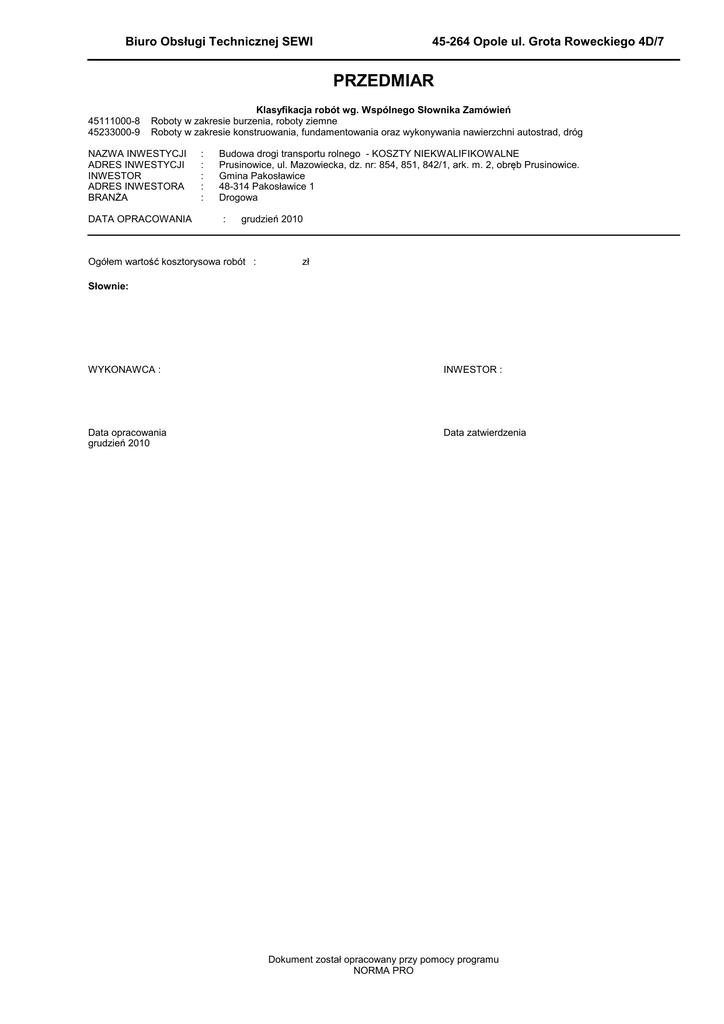 Biuro Obsługi Technicznej SEWI 45-264 Opole ul. Grota Roweckiego 4D/7 PRZEDMIAR 45111000-8 45233000-9 Klasyfikacja robót wg. Wspólnego Słownika Zamówień Roboty w zakresie burzenia, roboty ziemne Roboty w zakresie konstruowania, fundamentowania oraz wykonywania nawierzchni autostrad, dróg NAZWA INWESTYCJI ADRES INWESTYCJI INWESTOR ADRES INWESTORA BRANŻA DATA OPRACOWANIA : : : : : Budowa drogi transportu rolnego - KOSZTY NIEKWALIFIKOWALNE Prusinowice, ul. Mazowiecka, dz. nr: 854, 851, 842/1, ark. m. 2, obręb Prusinowice. Gmina Pakosławice 48-314 Pakosławice 1 Drogowa : grudzień 2010 Ogółem wartość kosztorysowa robót : zł Słownie: WYKONAWCA : INWESTOR : Data opracowania grudzień 2010 Data zatwierdzenia Dokument został opracowany przy pomocy programu NORMA PRO OGÓLNA CHARAKTERYSTYKA OBIEKTU 1. Zakres opracowania. Zakres opracowania obejmuje projekt budowlany i wykonawczy budowy drogi transportu rolnego w m. Prusinowice, ul. Mazowiecka na dz. nr: 854, 851, 842/1, ark. m. 2, obręb Prusinowice. 2. Opis stanu istniejącego. Ulica Mazowiecka na przedmiotowym odcinku jest o nawierzchni gruntowej. Szerokość w linach rozgraniczających wynosi około 7,5 m. Droga powiatowa (Nr 1602 O) na przedmiotowym odcinku jest o nawierzchni bitumicznej szerokości 5,1 m. Na przedmiotowym terenie jest usytuowana następująca infrastruktura: sieć energetyczna, sieć wodociągowa, sieć teletechniczna. 3. Opis stanu projektowanego. Projektuje się nawierzchnię drogi transportu rolnego z betonu asfaltowego (KR1) o szerokości 3,5 - 5,0 m (wg rys. 1). Projektowane poszerzenia i zwężenia jezdni na skrzyżowaniach z drogą powiatową i gminną zaprojektowano dwustronnie o skosie 1:15. Pobocza wykonać z mieszanki tłucznia (0 - 31,5 mm) grubości 8 cm i szerokości 0,75 m (nie dotyczy miejsc zawężeń pasa drogowego). Na całej długości połączenia z drogą powiatową należy sfrezować istniejącą nawierzchnię bitumiczną na głębokość 4 cm i szerokość 0,5 m, a następnie ułożyć warstwę ścieralną z betonu asfaltowego AC11S o grubości 4 cm. Projektuje się przedłużenie (z dwóch stron) istniejącego przepustu betonowego ? 400, wyprofilowanie skarp (1:1,5) oraz obłożenie wylotów przepustu kostką granitową 8/10 cm na podsypce cementowo - piaskowej 1:4 grubości 12 cm. Istniejący rów (rys. 1) należy oczyścić na łącznej długości 42,5 m Na połączeniu z drogą gminną projektuje się oporniki betonowe 12×25×75 na podsypce cementowo - piaskowej i ławie betonowej z oporem, ułożone na równi z projektowaną nawierzchnią drogi (szczegół "B"). Na całej długości połączenia z drogą gminną należy zlikwidować istniejący krawężnik betonowy oraz przełożyć istniejącą trylinkę na szerokości 0,7 m. Przekładaną trylinkę należy odpowiednio dociąć do projektowanego opornika. Istniejące zjazdy wykonać do granicy pasa drogowego o konstrukcji jak projektowanej jezdni. Roboty ziemne polegać będą na wykonaniu koryta pod nową konstrukcję jezdni, zjazdów i pobocza. Po wykonaniu koryta podłoże należy dogęścić mechanicznie. Roboty ziemne należy wykonywać mechanicznie a w miejscach występowania istniejącego uzbrojenia roboty prowadzić ręcznie. Od kilometra 0 + 0,00 do 0 +150,00 należy wykonać stabilizację gruntu cementem o Rm=2,5 MPa grubości 20 cm w celu podniesienia parametrów podłoża. Od kilometra 0 + 150,00 do 284,14 należy wykonać warstwę mrozoodporną z pospółki 0/20 grubości 15 cm. Przed przystąpieniem do robót wykonania stabilizacji wykonawca winien wykonać receptę roboczą i określić potrzebną ilość cementu do uzyskania wytrzymałości Rm=2,5 MPa. 4. Konstrukcje nawierzchni: a) jezdni, zjazdów: w-wa ścieralna z betonu asfaltowego AC11S - 4 cm, w-wa wiążąca z betonu asfaltowego AC16W - 4 cm, podbudowa z mieszanki bazaltowej lub granitowej 0/31,5 mm - 25 cm, w-wa z gruntu stabilizowanego cementem o Rm=2,5 MPa - 20 cm (od kilometra 0 + 0,00 do 0 + 150,00), w-wa mrozoodporna z pospółki 0/20 mm - 15 cm (od kilometra 0 + 150,00 m do 0 + 284,14), grunt rodzimy. b) połączenia drogi wewnętrznej z drogą powiatową: w-wa ścieralna z betonu asfaltowego AC11S - 4 cm, frezowanie istn. nawierzchni bitumicznej - 4 cm, istniejąca konstrukcja. Podbudowę wykonać i zagęścić warstwami zgodnie z istniejącymi normami. 5. Parametry geometryczne: Kategoria ruchu - KR 1, Długość odcinka drogi - 284,14 m, Szerokość pobocza (dwustronne) - 0,75 m, Spadek poprzeczny jezdni - 2 %, Spadek poprzeczny poboczy - 6 %, Szerokość nawierzchni - 3,0 - 5,0 m. -2- Norma PRO Wersja 4.31a Nr seryjny: 2107 Prusinowice IV kw 2010 NK Lp. Podstawa OBMIAR Nr spec. techn. 1 45100000-8 1.1 1 KNR 2-01 D-01.01.01 d.1. 0119-03 1 Opis i wyliczenia PRZYGOTOWANIE TERENU POD BUDOWĘ Roboty pomiarowe Roboty pomiarowe przy liniowych robotach ziemnych - trasa drogi w terenie równinnym 0,01 1.2 2 KNR AT-03 D-05.03.11 d.1. 0101-01 2 3 KNR AT-03 D-05.03.11 d.1. 0102-02 2 4 KNR 4-04 d.1. 1103-01 2 5 KNR 4-04 d.1. 1103-04 2 1103-05 6 d.1. kalk. włas2 na 1.3 7 KNR 2-01 d.1. 0206-05 3 0214-04 D-05.03.11 D-05.03.11 D-05.03.11 D-02.02.01 9 d.1. kalk. włas3 na D-02.02.01 D-02.02.01 10 na podsta- D-02.03.01 d.1. wie KNR 23 01 0235-01 Roboty rozbiórkowe Roboty remontowe - cięcie piłą nawierzchni bitumicznych na gł. do 5 cm m 20,9+0,5*2 m Roboty remontowe - frezowanie nawierzchni bitumicznej o gr. 4 cm m2 20,9*0,5 m2 Załadowanie gruzu koparko-ładowarką przy obsłudze na zmianę roboczą przez 3 samochody samowyładowcze m3 poz.3*0,04 m3 Wywiezienie gruzu z terenu rozbiórki przy mechanicznym załadowaniu i wyładowaniu samochodem samowyładowczym na odległość 10 km poz.4 m3 Koszty składowania gruzu bitumicznego t poz.3*0,04*2,5 t m3 D-04.04.02 poz.7A*10% m3 Koszty składowania ziemi t poz.7A*1,8 t Zasypanie brzegów konstrukcji drogi i przpustu - GRUNT Z DOWOZU m3 m3 0,010 RAZEM 0,010 21,900 RAZEM 21,900 10,450 RAZEM 10,450 0,418 RAZEM 0