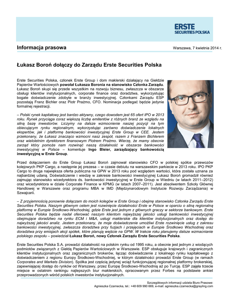 Informacja prasowa Warszawa, 7 kwietnia 2014 r. Łukasz Boroń dołączy do Zarządu Erste Securities Polska Erste Securities Polska, członek Erste Group i dom maklerski działający na Giełdzie Papierów Wartościowych powołał Łukasza Boronia na stanowisko Członka Zarządu. Łukasz Boroń skupi się przede wszystkim na rozwoju biznesu, zwłaszcza w obszarze obsługi klientów instytucjonalnych, corporate finance oraz doradztwa, wykorzystując bogate doświadczenie zdobyte w branży inwestycyjnej. Członkami Zarządu ESP pozostają Franz Bichler oraz Piotr Prażmo, CFO. Nominacja podlegać będzie jedynie formalnej rejestracji. – Polski rynek kapitałowy jest bardzo aktywny, czego dowodem jest 65 ofert IPO w 2013 roku. Rynek przyciąga coraz większą liczbę emitentów z różnych branż ze względu na silną bazę inwestorów. Liczymy na dalsze wzmocnienie naszej pozycji na tym obiecującym rynku regionalnym, wykorzystując zarówno doświadczenie lokalnych ekspertów, jak i platformę bankowości inwestycyjnej Erste Group w CEE. Jestem przekonany, że Łukasz znacząco wzmocni nasz zespół, razem z Franzem Bichlerem oraz wieloletnim dyrektorem finansowym Piotrem Prażmo. Wierzę, że mamy obecnie zarząd który pomoże nam rozwinąć naszą działalność w obszarze bankowości inwestycyjnej w Polsce – komentuje Ingo Bleier, zarządzający bankowością inwestycyjną w Erste Group. Przed dołączeniem do Erste Group Łukasz Boroń zajmował stanowisko CFO w polskiej spółce przewozów kolejowych PKP Cargo, a następnie jej prezesa – w czasie debiutu na warszawskim parkiecie w 2013 roku. IPO PKP Cargo to druga największa oferta publiczna na GPW w 2013 roku pod względem wartości, która została uznana za najbardziej udaną. Doświadczenie i wiedzę w zakresie bankowości inwestycyjnej Łukasz Boroń gromadził również zajmując stanowisko wicedyrektora ds. bankowości inwestycyjnej w Erste Group w Wiedniu (w latach 2011–2012) oraz wicedyrektora w dziale Corporate Finance w KPMG (w latach 2007–2011). Jest absolwentem Szkoły Głównej Handlowej w Warszawie oraz programu MBA w IMD (Międzynarodowym Instytucie Rozwoju Zarządzania) w Szwajcarii. – Z przyjemnością ponownie dołączam do moich kolegów w Erste Group i obejmę stanowisko Członka Zarządu Erste Securities Polska. Naszym głównym celem jest rozwinięcie działalności Erste w Polsce w oparciu o silną regionalną platformę w Europie Środkowo-Wschodniej, gdzie Erste jest jednym z głównych graczy w sektorze bankowym. Erste Securities Polska będzie nadal oferować naszym klientom najwyższej jakości usługi bankowości inwestycyjnej obejmujące doradztwo na rynku ECM i M&A, usługi maklerskie dla klientów instytucjonalnych oraz dostęp do najwyższej jakości analiz. Jestem przekonany, że moje doświadczenie umożliwi Erste rozwinięcie usług z zakresu bankowości inwestycyjnej, zwłaszcza doradztwa przy fuzjach i przejęciach w Europie Środkowo Wschodniej oraz doradztwa przy emisjach akcji spółek, które planują wejście na GPW. W trakcie roku planujemy dalsze wzmacnianie polskiego zespołu – powiedział Łukasz Boroń, nowy Członek Zarządu Erste Securities Polska. Erste Securities Polska S.A. prowadzi działalność na polskim rynku od 1995 roku, a obecnie jest jednym z wiodących podmiotów związanych z Giełdą Papierów Wartościowych w Warszawie. ESP obsługuje krajowych i zagranicznych klientów instytucjonalnych oraz zagranicznych brokerów, łącząc doświadczenie z lokalnego rynku kapitałowego z doświadczeniem z regionu Europy Środkowo-Wschodniej, w którym działalności prowadzi Erste Group (w ramach Corporates and Markets Division). Spółka jest częścią jedynej wciąż funkcjonującej regionalnej platformy brokerskiej, zapewniającej dostęp do rynków od Warszawy, przez Europę Środkowo-Wschodnią aż po Turcję. ESP zajęła trzecie miejsce w ostatnim rankingu najlepszych biur maklerskich, opracowanym przez Forbes na podstawie ankiet przeprowadzonych wśród polskich inwestorów instytucjonalnych. Szczegółowych informacji udziela Biuro Prasowe: Agnieszka Czarnecka, tel.: +48 609 990 669, e-mail: [email protected]