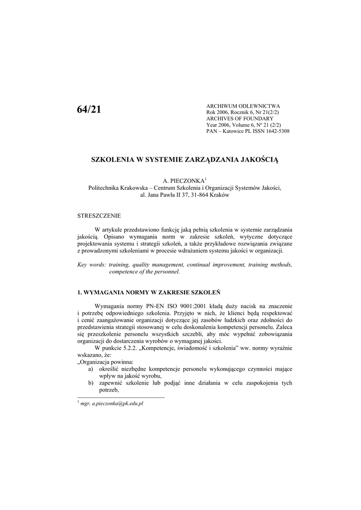 64/21 ARCHIWUM ODLEWNICTWA Rok 2006, Rocznik 6, Nr 21(2/2) ARCHIVES OF FOUNDARY Year 2006, Volume 6, Nº 21 (2/2) PAN – Katowice PL ISSN 1642-5308 SZKOLENIA W SYSTEMIE ZARZĄDZANIA JAKOŚCIĄ A. PIECZONKA1 Politechnika Krakowska – Centrum Szkolenia i Organizacji Systemów Jakości, al. Jana Pawła II 37, 31-864 Kraków STRESZCZENIE W artykule przedstawiono funkcję jaką pełnią szkolenia w systemie zarządzania jakością. Opisano wymagania norm w zakresie szkoleń, wytyczne dotyczące projektowania systemu i strategii szkoleń, a także przykładowe rozwiązania związane z prowadzonymi szkoleniami w procesie wdrażaniem systemu jakości w organizacji. Key words: training, quality management, continual improvement, training methods, competence of the personnel. 1. WYMAGANIA NORMY W ZAKRESIE SZKOLEŃ Wymagania normy PN-EN ISO 9001:2001 kładą duży nacisk na znaczenie i potrzebę odpowiedniego szkolenia. Przyjęto w nich, że klienci będą respektować i cenić zaangażowanie organizacji dotyczące jej zasobów ludzkich oraz zdolności do przedstawienia strategii stosowanej w celu doskonalenia kompetencji personelu. Zaleca się przeszkolenie personelu wszystkich szczebli, aby móc wypełnić zobowiązania organizacji do dostarczenia wyrobów o wymaganej jakości. W punkcie 5.2.2. „Kompetencje, świadomość i szkolenia” ww. normy wyraźnie wskazano, że: „Organizacja powinna: a) określić niezbędne kompetencje personelu wykonującego czynności mające wpływ na jakość wyrobu, b) zapewnić szkolenie lub podjąć inne działania w celu zaspokojenia tych potrzeb, 1 mgr, [email protected] c) ocenić skuteczność podjętych działań, d) zapewnić, aby personel organizacji był świadomy istoty i ważności swoich działań i tego, jak przyczynia się do osiągania celów dotyczących jakości, e) utrzymywać odpowiednie zapisy dotyczące wykształcenia, szkolenia, umiejętności i doświadczenia.” Natomiast w punkcie 6.2. pt. „Zasoby ludzkie” zawarto stwierdzenie: „Personel wykonujący pracę wpływającą na jakość wyrobu powinien być kompetentny”. Tak więc w rozumieniu tej normy powinien posiadać odpowiednie wykształcenie i doświadczenie, uczestniczyć w szkoleniach oraz podnosić swoje umiejętności. Kaoru Ishikawa, wielki autorytet w problematyce jakościowej, stwierdził kiedyś, że „sterowanie jakością zaczyna się od szkolenia i kończy szkoleniem". Integralną częścią wdrożenia systemu zarządzania jakością jest zatem podniesienie świadomości projakościowej wśród pracowników. Jednym z najbardziej skutecznych sposobów osiągnięcia tego celu są szkolenia i treningi. Prace w zakresie wprowadzania systemu zarządzania jakością w firmie należy rozpocząć od prawidłowego zdefiniowania strategii i uzyskania porozumienia w tej kwestii z zatrudnionymi pracownikami. Chodzi o stworzenie w firmie sprzyjającego klimatu wśród pracowników i kierownictwa dla procesu wdrażania systemu jakości oraz wypracowanie wśród nich świadomości i przekonania, że są oni współautorami systemu i z nim się identyfikują. 2. ANALIZA POTRZEB SZKOLENIOWYCH I PLANOWANIE SZKOLEŃ Zarządzanie szkoleniami może się kojarzyć z polityką inicjowaną i stosowaną przez dział personalny, tzn. menedżer czy specjalista ds. szkoleń, mówią nam co, dla kogo, jak i kiedy. Tymczasem kierowanie kompetencjami, a więc między innymi zapewnianie odpowiednich szkoleń, dla odpowiednich osób i we właściwym czasie, powinno spoczywać w rękach tych, którzy najlepiej znają pracowników i profil ich zadań. Tak więc odpowiedzialność jakościowa za szkolenia - organizacyjnie zarządzane przez dział personalny - należy do najwyższego kierownictwa. Wiele firm posiada swoje własne zasady określające precyzyjnie role, jakie kierownictwo spełnia w procesie przygotowywania i realizowania planu szkoleniowego. Jednak samo posiadanie zbioru zasad nie wystarczy do aktywnego włączenia kierownictwa w proces szkoleniowy. Istotną rolą działu personalnego jest nie tylko egzekwowanie od menedżerów identyfikacji potrzeb szkoleniowych danego działu czy zespołu, ale przede wszystkim uświadomienie im roli, jaką odgrywają w poszczególnych etapach owego procesu. Można wyróżnić kilka faz przygotowania i realizacji planu szkoleń: • analiza potrzeb szkoleniowych jednostki; • identyfikacja najbardziej adekwatnych rozwiązań szkoleniowych; • udział we wdrażaniu planu szkoleń; • stwarzanie warunków do efektywnego wypełnienia procesu szkoleniowego; • monitorowanie realizacji planu; 76 • monitorowanie zastosowania w praktyce wiedzy i umiejętności zdobytej na szkoleniach. Identyfikacja potrzeb szkoleniowych w zakresie kompetencji jest związana w dużej mierze z generalną strategią firmy. To, jakie zadania i cele firma sobie i pracownikom wyznaczy, determinuje nam profil kompetencji, które będą potrzebne do realizacji tych celów. Wdrażanie planu szkoleniowego to nie tylko zlecanie szkoleń firmom zewnętrznym, lecz także aktywne podejście kierownictwa do przekazywania własnej wiedzy podwładnym, a więc realizowanie pojedynczych bądź cyklicznych szkoleń dla większych grup pracowników. 3. REALIZACJA SZKOLENIA - WYTYCZNE W normie PN ISO 10015:2004 podano wytyczne dotyczące projektowania, wdrażania, utrzymywania i doskonalenia strategii i systemów szkolenia, które mogą być pomocne organizacjom i ich personelowi podczas rozpatrywania zagadnień związanych ze szkoleniami; „norma może być stosowana ilekroć potrzebne są wytyczne do zinterpretowania odwołania się do „kształcenia” i „szkolenia” w normach rodziny ISO 9000 dotyczących zarządzania jakością.” Niniejszą normę mogą stosować prowadzący szkolenia przy rozpatrywaniu potrzeb szkoleniowych własnego personelu. Nie jest ona przeznaczona do stosowania przez świadczących usługi szkoleniowe innym organizacjom, nie jest również przeznaczona