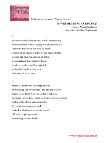 12 Konkurs Piosenki „Wygraj Sukces” W WESOŁYM MIASTECZKU słowa: Marek Sochacki muzyka: Jarosław Piątkowski I. W mieście dziś od rana ruch wielki nad rzeczką To na błoniach rośnie w górę wesołe miasteczko Ogromna huśtawka poniesie do nieba A na pięknej karuzeli pokręcić się będzie trzeba Głośno gra muzyka, dokoła publika Z uśmiechami ktoś rozłożył kram Atrakcji wiele, wokół przyjaciele można być tu dwie niedziele I nie znudzi się tu nam II. Mama z tatą mocno trzymają za ręce Ja nie mogę już wytrzymać i jak bąk się wiercę Wreszcie w dłoni bilet już siedzę w rakiecie Karuzela już się kręci zaraz w kosmos mnie wyniesie Pędzą grube słonie galopują konie I żyrafa głową sięga gwiazd A obok maluch to z wrażenia zamókł Od atrakcji głowy zawrót I na twarzy trochę zbladł www.wygrajsukces.com.pl III. W gabinecie śmiechu dziwne lustra wiszą Odchudzają, pogrubiają a ludzie się cieszą Mamo zeszczuplałaś, zjesz dziś czekoladę Tato przytył, dietetyczny będzie musiał zjeść obiadek Jeszcze na huśtawce chwycę jakąś gwiazdkę Przecież ich na niebie mnóstwo tam Gdy przyjdą święta, to rzecz niepojęta Na choince będzie piękna Najpiękniejsza z wszystkich, najpiękniejsza z wszystkich Najpiękniejsza z wszystkich gwiazd www.wygrajsukces.com.pl