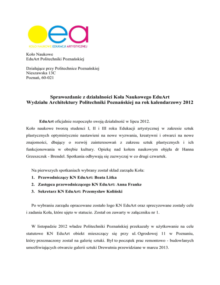 Koło Naukowe EduArt Politechniki Poznańskiej Działające przy Politechnice Poznańskiej Nieszawska 13C Poznań, 60-021 Sprawozdanie z działalności Koła Naukowego EduArt Wydziału Architektury Politechniki Poznańskiej na rok kalendarzowy 2012 EduArt oficjalnie rozpoczęło swoją działalność w lipcu 2012. Koło naukowe tworzą studenci I, II i III roku Edukacji artystycznej w zakresie sztuk plastycznych optymistycznie nastawieni na nowe wyzwania, kreatywni i otwarci na nowe znajomości, dbający o rozwój zainteresowań z zakresu sztuk plastycznych i ich funkcjonowania w obrębie kultury. Opiekę nad kołem naukowym objęła dr Hanna Grzeszczuk - Brendel. Spotkania odbywają się zazwyczaj w co drugi czwartek. Na pierwszych spotkaniach wybrany został skład zarządu Koła: 1. Przewodniczący KN EduArt: Beata Litka 2. Zastępca przewodniczącego KN EduArt: Anna Franke 3. Sekretarz KN EduArt: Przemysław Koliński Po wybraniu zarządu opracowane zostało logo KN EduArt oraz sprecyzowane zostały cele i zadania Koła, które ujęto w statucie. Został on zawarty w załączniku nr 1. W listopadzie 2012 władze Politechniki Poznańskiej przekazały w użytkowanie na cele statutowe KN EduArt obiekt mieszczący się przy ul. Ogrodowej 11 w Poznaniu, który przeznaczony został na galerię sztuki. Był to początek prac remontowo - budowlanych umożliwiających otwarcie galerii sztuki Drewutnia przewidziane w marcu 2013. 29.11.2012 na zebraniu KN podjęto uchwałę w celu powołania dwóch opiekunów Koła: dr Hanny Grzeszczuk – Brendel oraz dra sztuki Przemysława Tomczaka. Uchwała została zawarta w załączniku nr 2. 30.11.2012 ogłoszono konkurs na logo Galerii Drewutnia. Galeria Drewutnia jest aktualnie głównym narzędziem pracy, miejscem, gdzie odbywać będą się spotkania, wystawy, promocje, a jednocześnie promocją działalności naszego Koła Naukowego EduArt, jak i promocją nowego kierunku na Politechnice Poznańskiej jakim jest Edukacja artystyczna w zakresie sztuk plastycznych. ZAŁĄCZNIK NR 1. Statut Koła Naukowego „EduArt” Politechniki Poznańskiej I. Postanowienia ogólne §1 Podstawą prawną działania Koła Naukowego „EduArt” są: 1. Ustawa z dnia z dnia 27 lipca 2005 r. Prawo o szkolnictwie wyższym (Dz. U. Nr 65, poz. 385), 2. Regulamin Studiów Politechniki Poznańskiej, 3. Niniejszy statut. §2 1. Koło Naukowe „EduArt” Politechniki Poznańskiej, zwane dalej „Kołem Naukowym” jest podstawową formą organizacyjną studenckiego ruchu naukowego. 2. Koło Naukowe jest formą aktywności naukowej studentów, zwiększającą zainteresowania związane z działalnością naukową i dydaktyczną na Wydziale Architektury Politechniki Poznańskiej. §3 Koło Naukowe nie posiada osobowości prawnej. II. Nazwa i siedziba Koła Naukowego §4 1. Koło Naukowe działa przy Wydziale Architektury Politechniki Poznańskiej. 2. Siedzibą Koła Naukowego jest: Wydział Architektury Politechniki Poznańskiej, 3. przy ul. Nieszawskiej 13c, 61- 021 Poznań. III. Znak graficzny i pieczęć §5 1. Koło może używać własnego znaku graficznego i pieczęci oraz znaku graficznego i pieczęci Wydziału Architektury Politechniki Poznańskiej i Politechniki Poznańskiej. 2. Wzór znaku graficznego oraz pieczęci Koła Naukowego ustala Rada Koła i przedstawia w formie załączników do Statutu (załącznik nr 1). IV. Cele i zadania Koła Naukowego §6 1. Koło Naukowe służy rozwojowi aktywności naukowej i społecznej studentów. 2. Celem Koła Naukowego jest rozwój zainteresowań studentów problematyką z zakresu sztuk plastycznych i ich funkcjonowania w obrębie kultury. 3. Cele statutowe Koła Naukowego, o których mowa w § 6 pkt. 2 realizowane są między innymi poprzez: a) pogłębianie wiedzy i umiejętności samodzielnego oraz zespołowego rozwiązywania problemów naukowych, technicznych i artystycznych. b) rozwijanie zainteresowań naukowych i badawczych, c) inicjowanie i realizowanie prac mających na celu doskonalenie procesu dydaktyczno-wychowawczego, realizowanie prac naukowo-badawczych prowadzonych na Wydziale Architektury Politechniki Poznańskiej, d) organizacja szkoleń, spotkań naukowych, lekcji muzealnych, warsztatów, konferencji i wykładów dla studentów, e) organizowanie wjazdów naukowych i objazdów zabytkowych, f) wyjazdy na targi i wystawy, g) współpraca z innymi kołami naukowymi również Wydziału Architektury Politechniki Poznańskiej, Uniwersytetu Adama Mickiewicza i Uniwersytetu Artystycznego, a także z innymi uczelniami w kraju i zagranicą, h) prowadzenie strony internetowej Koła Naukowego, i) prezentowanie osiągnięć własnych Koła Naukowego, j) promocja Wydziału Architektury Politechniki Poznańskiej, k) inne działanie ku realizowaniu celów niniejszego statutu. V. Odpowiedzialność za realizację celów §7 1. Za realizację celów statutowych odpowiedzialny jest każdy członek Koła Naukowego. 2. W szczególnych przypadkach realizacja celów statutowych może zostać powierzona osobom i instytucjom trzecim. VI. Członkostwo §8 1. Członkami zwyczajnymi Koła Naukowego mogą być studenci Wydziału Architektury Politechniki Poznańskiej zainteresowani sztukami plastycznymi. 2. Członkami wspierającymi Koła Naukowego mogą zostać wszyscy studenci, którzy wykazują taką chęć oraz chcą uczestniczyć w działalności Koła Naukowego. 3. Członek Koła Naukowego ma prawo: a) korzystania z pomocy pracowników Politechniki Poznańskiej współpracujących z Kołem Naukowym, b) uczestnictwa w przedsięwzięciach organizowanych przez Koło Naukowe, c) do czynnego oraz biernego prawa wyborczego. 4. Członek Koła Naukowego jest zobowiązany: a) przestrzegać postanowień Statutu Koła Naukowego, b) uczestniczyć w pracach Koła Naukowego, c) dbać o dobre imię Koła Naukowego, d) potwierdzać w terminach ustalonych przez Zarząd swoje członkostwo. 5. Podstawą do pozbawienia członkostwa Koła Naukowego jest:
