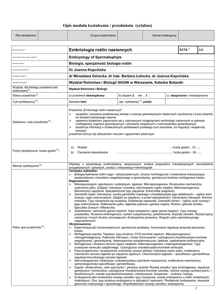 Opis modułu kształcenia / przedmiotu (sylabus) Rok akademicki: Grupa przedmiotów: Numer katalogowy: ECTS 2) Embriologia roślin nasiennych 1) Nazwa przedmiotu : 3) Tłumaczenie nazwy na jęz. angielski : 3.0 Embryology of Spermatophyta Biologia, specjalność biologia roślin 4) Kierunek studiów : Dr Joanna Kopcińska 5) Koordynator przedmiotu : dr Mirosława Górecka, dr hab. Barbara Łotocka, dr Joanna Kopcińska 6) Prowadzący zajęcia : Wydział Rolnictwa i Biologii SGGW w Warszawie, Katedra Botaniki 7) Jednostka realizująca : Wydział, dla którego przedmiot jest realizowany8): 9) Wydział Rolnictwa i Biologii Status przedmiotu : a) przedmiot obowiązkowy b) stopień 2. Cykl dydaktyczny10): Semestr letni Jęz. wykładowy11): polski Założenia i cele przedmiotu12): Przedmiot „Embriologii roślin nasiennych” : uzupełnia i poszerza podstawową wiedzę o rozwoju generatywnym nasiennych wyniesioną z kursu botaniki na studiach pierwszego stopnia zapewnia studentom zapoznanie się z najnowszymi osiągnięciami embriologii nasiennych w zakresie morfogenezy organów generatywnych i procesów związanych z rozmnażaniem generatywnym dostarcza informacji o molekularnych podstawach przebiegu tych procesów, ich regulacji i wzajemnej korelacji przedmiot kończy się zaliczeniem ćwiczeń i egzaminem pisemnym Formy dydaktyczne, liczba godzin13): Metody dydaktyczne14): Pełny opis przedmiotu15): a) Wykład b) Ćwiczenia laboratoryjne rok …1… c) stacjonarne / niestacjonarne ; liczba godzin ..15.....; …………………………………………………; liczba godzin ..30.....; Wykłady z prezentacją multimedialną, eksperyment, analiza preparatów mikroskopowych samodzielnie przygotowanych i gotowych, analiza i interpretacja mikrofotografii Tematyka wykładów: Biologia kwitnienia roślin nago- i okrytonasiennych: zmiany morfologiczne i molekularne towarzyszące przekształceniu merystemu wegetatywnego w generatywny, genetyczna kontrola morfogenezy kwiatu. Nagonasienne Mikrosporangium: egzotecjum i endotecjum, tapetum. Mikrosporogeneza. Strukturalne mechanizmy uwalniania pyłku. Zalążek: orientacja i symetria, różnicowanie części zalążka. Makrosporogeneza. Mechanizmy zapylenia. Specjalistyczne typy zapylenia. Entomofilia (sagowce). Gametofit męski: mikrospora, rozwój gametofitu męskiego i charakterystyka jego składowych – ogólny wzór rozwoju i jego zróżnicowanie. Zalążek po zapyleniu, a przed zapłodnieniem. Zamknięcie mikropyle. Komora rodniowa. Typy rozrastania się nucellusa. Substancje zapasowe. Gametofit żeński – ogólny wzór rozwoju i jego zróżnicowanie. Kiełkowanie pyłku, łagiewka pyłkowa i gamety męskie. Rodnia i gameta żeńska. Specyfika Gnetum i Wliwitschia. Zapłodnienie: uwolnienie gamet męskich, fuzja cytoplazmy i jąder gamet męskich. Typy rozwoju prazarodka. Wczesna embriogeneza: system suspensorowy, poliembrionia. Dojrzały zarodek. Rozwój łupiny nasiennej i innych struktur okrywających. Endosperma pierwotna. Długość cyklu reprodukcyjnego nagonasiennych. Okrytonasienne Determinacja płci okrytonasiennych: genetyczne podstawy, hormonalna regulacja ekspresji płciowości kwiatu. Morfogeneza pręcika. Tapetum: typy struktury, PCD komórek tapetum. Mikrosporogeneza i mikrogametogeneza. Polarność mikrospor, model różnicowania i cytologiczna charakterystyka komórek wegetatywnej i generatywnej. Heterospermia cytoplazmatyczna i jądrowa, zapłodnienie preferencyjne. Morfogeneza i struktura różnych typów zalążków. Makrosporogeneza i makrogametogeneza. Typy rozwojowe woreczka zalążkowego. Cytologiczna charakterystyka komórek woreczka. Faza progamiczna: receptywność znamienia, proces adhezji i hydratacji ziaren pyłku, molekularny mechanizm wzrostu łagiewki po zapyleniu zgodnym. Chemotropizm łagiewki – sporofitowa i gametofitowa regulacja kierunkowego wzrostu łagiewki. Samoniezgodność: lokalizacja i charakterystyka czynników rozpoznania; molekularne mechanizmy samoniezgodności sporofitowej i gametofitowej. Zygota: ultrastruktura, „stan spoczynku”, pierwszy podział. Rozwój zarodka: typy embriogenezy, regulacja genetyczna i hormonalna, cytologiczna charakterystyka komórek zarodka, różnice rozwoju zarodka jedno- i dwuliściennych, zarodki wysokozróżnicowane i zredukowane. Suspensor – budowa i funkcje. Endosperma jako środowisko rozwoju zarodka: typy rozwojowe, rozwój endospermy u roślin modelowych, Arabidopsis i Zea, typy struktury endospermy w dojrzałych nasionach. Ploidalność endospermy, stosunek genomów matczynego i ojcowskiego. Współzależność rozwoju zarodka i endospermy. 1 Powstawanie nasion i owoców. Apomiksja. Budowa nasion z uwzględnieniem wyspecjalizowanych struktur dodatkowych i ich funkcji. Nasiona erozyjne. Owoce w rozumieniu botanicznym i potocznym, owocostany. Autochoria i allochoria Tematyka ćwiczeń Morfologia ziaren pyłku nago- i okrytonasiennych – barwienie potrójne wg Alexandra, autofluorescencja w ultrafiolecie. Określenie stadiów rozwojowych gametofitów w trakcie wypylania – barwienie DAPI Budowa kwiatów męskich i kwiatostanów żeńskich u różnych taksonów nagonasiennych, struktura zalążków w różnych stadiach rozwoju – analiza preparatów trwałych Kiełkowanie ziaren pyłku i wzrost łagiewki na różnych podłożach, identyfikacja łagiewek w szlaku transmisyjnym słupka – barwienie błekitem aniliny Ocena receptywności znamion w oparciu o: obserwację morfologii znamienia, wykrywanie reaktywnych form tlenu w brodawkach znamieniowych (barwienie NBT, DAB) Ultrastruktura komórek szlaku transmisyjnego słupka – analiza mikrofotografii. Lokalizacja Ca+2 w komórkach znamienia, szlaku transmisyjnym słupka i w zalążkach – barwienie czerwienią alizaryny Obserwacja specyficznie zbudowanych nasion i zarodków np.: nasiona balonowe, zredukowany zarodek (Orchidaceae); bielmo erozyjne (Annona cherimola). Zarodek - morfologia zarodków w