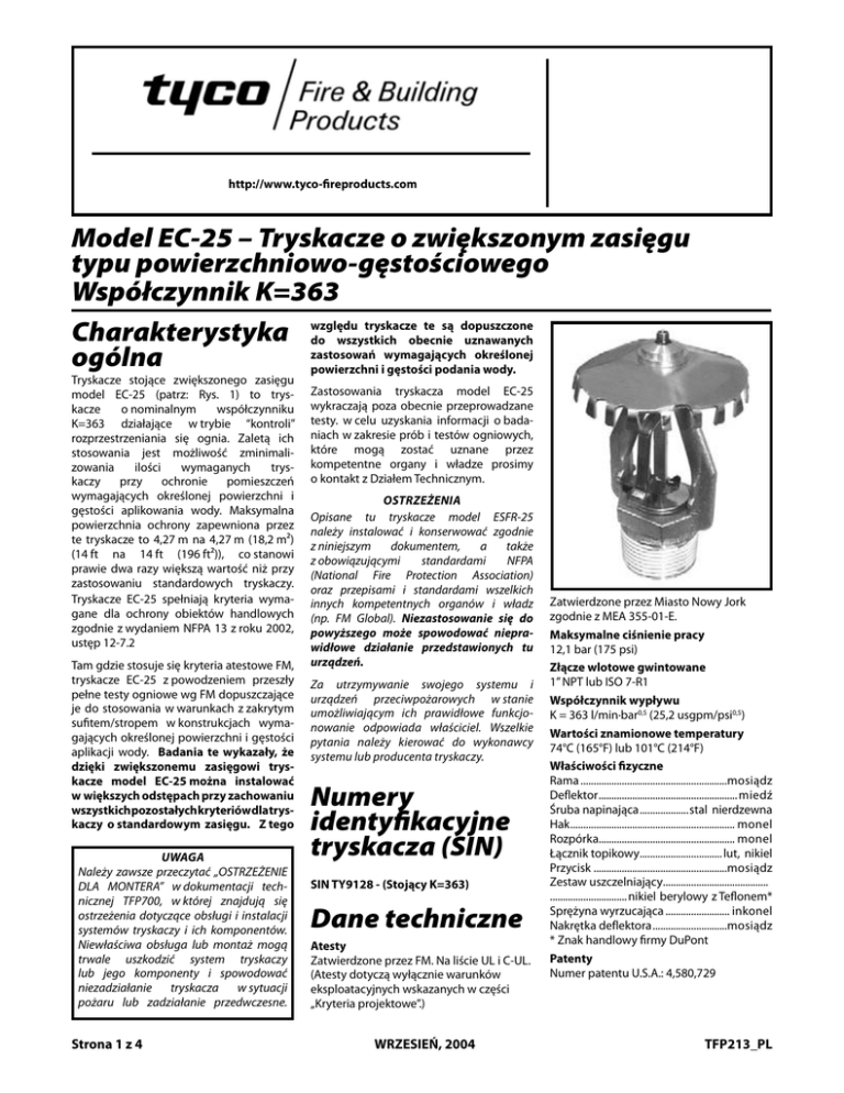Technical Services: Tel: (800) 381-9312 / Fax: (800) 791-5500 http://www.tyco-fireproducts.com Model ModelEC-25 EC-25 – Tryskacze o zwiększonym zasięgu Extended Coverage Area Density Sprinklers typu powierzchniowo-gęstościowego 25.2 K-factor K=363 Współczynnik Charakterystyka General ogólna Description Tryskacze stojące zwiększonego zasięgu względu tryskacze te Model są dopuszczone Applications for the EC-25 do wszystkich obecnie beyond uznawanych Sprinklers are expanding the current testing.wymagających For informationokreślonej regardzastosowań ing additionali gęstości researchpodania fire tests that powierzchni wody. may be acceptable to an Authority Zastosowania tryskacza Having Jurisdiction pleasemodel contact EC-25 the wykraczająServices poza obecnie przeprowadzane Technical Department. testy. w celu uzyskania informacji o badaniach w zakresie prób i testów ogniowych, WARNINGS The dektóreModel mogąEC-25 zostaćSprinklers uznane przez scribed herein organy must be installedprosimy and kompetentne i władze maintained in compliance with this o kontakt z Działem Technicznym. document, as well as with the applicable standards OSTRZEŻENIA of the National Fire Protection in addition the OpisaneAssociation, tu tryskacze model to ESFR-25 standards of any other authoritieszgodnie havnależy instalować i konserwować ing jurisdiction dokumentem, (e.g., FM Global). z niniejszym a Failtakże ure to do so may impair the performz obowiązującymi standardami NFPA ance of these (National Fire devices. Protection Association) orazowner przepisami i standardami wszelkich The is responsible for maintaininnych organówand i władz ing their kompetentnych fire protection system devices in Global). proper Niezastosowanie operating condition. (np. FM się do The installingmoże contractor or sprinkler powyższego spowodować niepramanufacturer should be contactedtu widłowe działanie przedstawionych with any questions. urządzeń. The ModelEC-25 EC-25(patrz: Extended model Rys. Coverage 1) to trysUpright (Ref. Figure 1) are kacze Sprinklers o nominalnym współczynniku “Control-Mode Extended Coverage K=363 działające w trybie “kontroli” Sprinklers” having asię nominal rozprzestrzeniania ognia. K-factor Zaletą ich of 25.2. Their use especially advanstosowania jest is możliwość zminimalitageous as a means of decreasing the zowania ilości wymaganych trysnumber of required sprinklers to prokaczy przy ochronie pomieszczeń tect occupancies requiring an wymagających określonej powierzchni i area/density application of water. gęstości aplikowania wody. Maksymalna These sprinklers offer maximum covpowierzchnia ochrony zapewniona przez erage areas ofto144,27 feet (196m²) te tryskacze m by na 14 4,27feet m (18,2 sq.(14 ft.)ftwhich that of na is14almost ft (196double ft²)), co stanowi standard coverage sprinklers used for prawie dwa razy większą wartość niż przy similar applications. zastosowaniu standardowych tryskaczy. The EC-25 Sprinklers comply with wymathe Tryskacze EC-25 spełniają kryteria criterion for the protection of retail gane dla ochrony obiektów handlowych stores as described in NFPA the 2002 zgodnie z wydaniem 13 z edition roku 2002, of NFPA 13, Section 12-7.2 ustęp 12-7.2 Where the FM Approval is utilized, the Tam gdzie się kryteria atestowe FM, EC-25 has stosuje successfully undergone tryskacze z powodzeniem full-scale fireEC-25 testing at FM for useprzeszły unZa utrzymywanie swojego systemu i testy ogniowe wgconditions FM dopuszczające derpełne obstructed ceiling for urządzeń przeciwpożarowych w stanie je do stosowania warunkach z zakrytym area/density designwapplications. This umożliwiającym ich prawidłowe funkcjosufitem/stropem w konstrukcjach wyma- nowanie odpowiada właściciel. Wszelkie testing has demonstrated that the Model EC-25 at its extended gających określonej powierzchnicoveri gęstości pytania należy kierować do wykonawcy age spacings canBadania be installed using że systemu lub producenta tryskaczy. aplikacji wody. te wykazały, all dzięki other zwiększonemu standard coverage sprinzasięgowi trysSIN TY9128 - (Upright K=25.2) kler criteria. AsEC-25 such,można they are ackacze model instalować ceptable for allodstępach currentlyprzy recognized w większych zachowaniu area/density applications. wszystkich pozostałych kryteriów dla tryskaczy o standardowym zasięgu. Z tego Sprinkler Identification Number Numery UWAGA Należy zawsze przeczytać „OSTRZEŻENIE IMPORTANT DLA MONTERA” w dokumentacji techAlways refer to Technical Data nicznej TFP700, w której znajdują się Sheet TFP700 for the “INSTALLER ostrzeżenia that dotyczące obsługi i instalacji WARNING” provides cautions systemów i ich and komponentów. with respecttryskaczy to handling instalNiewłaściwa obsługa lub montaż mogą lation of sprinkler systems and components. intrwale Improper uszkodzićhandling system and tryskaczy stallation permanently damage lub jegocan komponenty i spowodować a sprinkler system or its componiezadziałanie tryskacza w sytuacji nents and lub cause the sprinkler to fail pożaru zadziałanie przedwczesne. to operate in a fire situation or cause it to operate prematurely. Strona 1 z 4 Page 1 of 4 Technical identyfikacyjne Data tryskacza (SIN) Approvals FM UL and C-UL Listed. SINApproved. TY9128 - (Stojący K=363) (Approvals only apply to the service conditions indicated in the Design Criteria section.) NYC under MEA 355-01-E. Atesty Maximum Working Pressure Zatwierdzone przez FM. Na liście UL i C-UL. 175 psi dotyczą (12,1 bar) (Atesty wyłącznie warunków eksploatacyjnych wskazanych w części Pipe Thread Connection projektowe”.) 1 „Kryteria inch NPT or ISO 7-R1 Dane techniczne WRZESIEŃ, 2004 SEPTEMBER, 2004 Zatwierdzone przez Miasto Nowy Jork zgodnie z MEA 355-01-E. Discharge Coefficient Maksymalne ciśnienie 1/2 pracy K = 25.2 GPM/psi 12,1 bar LPM/bar (175 psi) 1/2) (362,9 Złącze wlotoweRatings