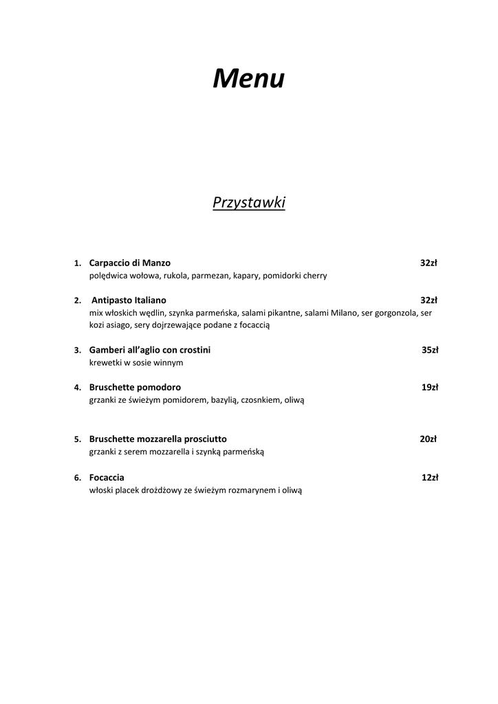 Menu Przystawki 1. Carpaccio di Manzo polędwica wołowa, rukola, parmezan, kapary, pomidorki cherry 2. Antipasto Italiano 32zł 32zł mix włoskich wędlin, szynka parmeńska, salami pikantne, salami Milano, ser gorgonzola, ser kozi asiago, sery dojrzewające podane z focaccią 3. Gamberi all’aglio con crostini krewetki w sosie winnym 35zł 4. Bruschette pomodoro grzanki ze świeżym pomidorem, bazylią, czosnkiem, oliwą 19zł 5. Bruschette mozzarella prosciutto grzanki z serem mozzarella i szynką parmeńską 20zł 6. Focaccia włoski placek drożdżowy ze świeżym rozmarynem i oliwą 12zł Zupy 1. Crema al pomodoro 13zł Krem z pomidorów 2. Zupa rybna 17zł 3. Zupa dnia 8zł Sałatki 1. Insalata cezar 24zł Mix sałat, kurczak, grzanki, pomidorki cherry, sos cezar 2. Insalata caprese 14zł Pomidory, ser mozzarella, bazylia, oliwa 3. Insalata grecka Mix sałat, pomidor, ogórek, cebula czerwona, oliwki, papryka, ser feta 16zł Wspaniały smak naszej pizzy jest wynikiem ręcznie wyrabianego ciasta oraz starannie dobranych składników! Pizza 1. Margherita Ser mozzarella/sos pomidorowy 17zł 2. Capricciosa Ser mozzarella/sos pomidorowy/szynka/pieczarki 21zł 3. Salami 19zł Ser mozzarella/ sos pomidorowy /salami milano 4. Hawai Ser mozzarella/sos pomidorowy/szynka/ananas 20zł 5. Spianata Ser mozzarella/sos pomidorowy/spianata picante/rucola/pomidorki cherry 23zł 6. Tonno Ser mozzarella/sos pomidorowy/tuńczyk/cebula czerwona/kapary 25zł 7. Napoletana 19zł Ser mozzarella/sos pomidorowy/czosnek świeży/anchovis 8. Quattro stagioni Ser mozzarella/sos pomidorowy/ szynka cotto/pieczarki/karczochy/oliwki 27zł 9. Quattro formaggi Ser mozzarella/sos pomidorowy/gorgonzola/asiago/parmezan 26zł 10. Pollo 25zł Ser mozzarella/ sos pomidorowy/mięso z kurczaka/ cebula czerwona 11. Carbonara Ser mozzarella/sos smietanowy/pancetta/cebula czerwona/ jajko 23zł 12. Speciale 29zł Ser mozzarella/sos pomidorowy/szynka cotto/pancetta/papryka/pieczarki/cebula czerwona 13. Caprese Ser mozzarella/oliwa z oliwek/pomidor / rucola 25zł 14. Gorgonzola e spinaci Ser mozzarella/sos pomidorowy/orzechy włoskie/gorgonzola/czosnek/szpinak 27zł 15. Verdure grigliate 27zł Ser mozzarella/papryka/oliwki/pieczarki/kapary/cebula czerwona/sos pomidorowy 16. Parma Sos pomidorowy/szynka crudo/rukola/pomidorki cherry/ parmezan 30zł Szeroki wybór makaronów wykonanych według receptur szefa kuchni zadowoli każdego smakosza! Pasty 1. Aglio Olio Peperoncino Spaghetti alla chitarra, czosnek, oliwa, papryczka peperoncino 19zł 2. Arrabiata 19zł Tagliatelle, pomidory, czosnek, bazylia, papryczka peperoncino 3. Bolognese 26zł Spaghetti alla chitarra z sosem Bolognese 4. Poolo Brocoli Gorgonzola 28zł Penne rigate, kurczak, brokuły, ser Gorgonzola, czosnek w sosie śmietanowym 5. Carborana 28zł Spagetti, boczek, jajko, parmezan 6. Spinaci e Gorgonzola 29zł Tagliatelle, szpinak, ser Gorgonzola, czosnek, czerwona cebula, śmietana 7. Salsiccia 29zł Penne rigate, włoska kiełbasa, czosnek, papryczka peperoncino w sosie pomidorowym 8. Gamberi Con Zucchine 32zł Tagliatelle, krewetki, cukinia, natka pietruszki, carry, śmietana 9. Frutti di Mare 33zł Tagliatelle z owocami morza w sosie pomidorowym z czosnkiem i papryczką peperoncino 10. Vegetariana Tagliatelle, cukinia, bakłażan, papryka, oliwki, czosnek, cebula czerwona, bazylia 33zł Ravioli 1. Ravioli al Ragu di Carne W sosie pomidorowo-bazyliowym 29zł 2. Ravioli Spinaci e Ricotta di Noce Pierożki włoskie faszerowane szpinakiem i serkiem Ricotta w sosie maślano-szałwiowym 30zł 3. Ravioli Seppia Frutti di Mare Pierożki włoskie z atramentem ośmiornicy nadziewane farszem z owoców morza podawane w sosie z oliwy, czosnku i rukoli 33zł Lasagne 1. Lasagne al Forno Ragu Lasagne mięsna z beszamelem w sosie pomidorowym z pieca 29zł Ryby 1. Salmone 42zł Łosoś pieczony z pomidorami i miękkim białym serem z dodatkiem gniocchi 2.Dorada Dorada zapiekana w soli morskiej z warzywami z grilla z ziemniakami opiekanymi 49zł Danie główne 1. Filetti di pollo alla caprese 35zł Filet z kurczaka z mozzarella, pomidorem i bazylią z ziemniakami opiekanymi i warzywami z wody 2. Anatra 45zł Kaczka luzowana podana na karmelizowanym jabłku z dodatkiem gnocchi 3. Filetto di maiale con funghi di bosco 38zł Warkocz z polędwiczki wieprzowej z sosem z leśnych grzybów z ziemniakami opiekanymi i mix sałat 4. Kotlet schabowy z ziemniakami i surówką 25zł 5. Panierowany filet z kurczaka z ziemniakami i surówką 25zł 6. Półmisek mięs pieczonych 45zł filet z kurczaka, schab, karkówka, boczek, kiełbasa, bułka, sos firmowy, ogórek kiszony, pomidor Desery 1. Tiramisu al Panettone 2. Tatufo noccila 3. Tartufo al limoncello