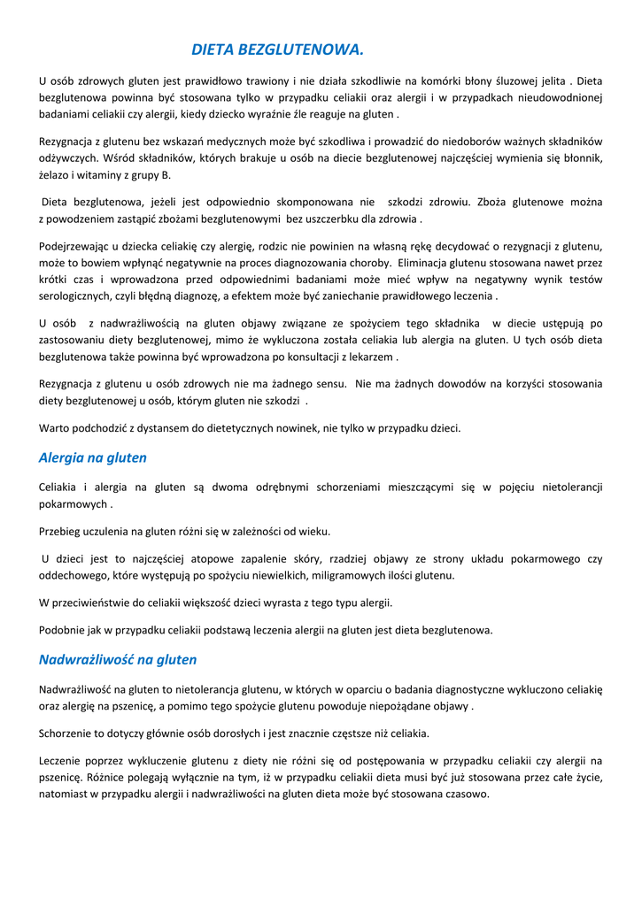 DIETA BEZGLUTENOWA. U osób zdrowych gluten jest prawidłowo trawiony i nie działa szkodliwie na komórki błony śluzowej jelita . Dieta bezglutenowa powinna być stosowana tylko w przypadku celiakii oraz alergii i w przypadkach nieudowodnionej badaniami celiakii czy alergii, kiedy dziecko wyraźnie źle reaguje na gluten . Rezygnacja z glutenu bez wskazań medycznych może być szkodliwa i prowadzić do niedoborów ważnych składników odżywczych. Wśród składników, których brakuje u osób na diecie bezglutenowej najczęściej wymienia się błonnik, żelazo i witaminy z grupy B. Dieta bezglutenowa, jeżeli jest odpowiednio skomponowana nie szkodzi zdrowiu. Zboża glutenowe można z powodzeniem zastąpić zbożami bezglutenowymi bez uszczerbku dla zdrowia . Podejrzewając u dziecka celiakię czy alergię, rodzic nie powinien na własną rękę decydować o rezygnacji z glutenu, może to bowiem wpłynąć negatywnie na proces diagnozowania choroby. Eliminacja glutenu stosowana nawet przez krótki czas i wprowadzona przed odpowiednimi badaniami może mieć wpływ na negatywny wynik testów serologicznych, czyli błędną diagnozę, a efektem może być zaniechanie prawidłowego leczenia . U osób z nadwrażliwością na gluten objawy związane ze spożyciem tego składnika w diecie ustępują po zastosowaniu diety bezglutenowej, mimo że wykluczona została celiakia lub alergia na gluten. U tych osób dieta bezglutenowa także powinna być wprowadzona po konsultacji z lekarzem . Rezygnacja z glutenu u osób zdrowych nie ma żadnego sensu. Nie ma żadnych dowodów na korzyści stosowania diety bezglutenowej u osób, którym gluten nie szkodzi . Warto podchodzić z dystansem do dietetycznych nowinek, nie tylko w przypadku dzieci. Alergia na gluten Celiakia i alergia na gluten są dwoma odrębnymi schorzeniami mieszczącymi się w pojęciu nietolerancji pokarmowych . Przebieg uczulenia na gluten różni się w zależności od wieku. U dzieci jest to najczęściej atopowe zapalenie skóry, rzadziej objawy ze strony układu pokarmowego czy oddechowego, które występują po spożyciu niewielkich, miligramowych ilości glutenu. W przeciwieństwie do celiakii większość dzieci wyrasta z tego typu alergii. Podobnie jak w przypadku celiakii podstawą leczenia alergii na gluten jest dieta bezglutenowa. Nadwrażliwość na gluten Nadwrażliwość na gluten to nietolerancja glutenu, w których w oparciu o badania diagnostyczne wykluczono celiakię oraz alergię na pszenicę, a pomimo tego spożycie glutenu powoduje niepożądane objawy . Schorzenie to dotyczy głównie osób dorosłych i jest znacznie częstsze niż celiakia. Leczenie poprzez wykluczenie glutenu z diety nie różni się od postępowania w przypadku celiakii czy alergii na pszenicę. Różnice polegają wyłącznie na tym, iż w przypadku celiakii dieta musi być już stosowana przez całe życie, natomiast w przypadku alergii i nadwrażliwości na gluten dieta może być stosowana czasowo. Celiakia Celiakia nie jest alergią, choć często jest z nią mylona. Celiakia (choroba trzewna) to trwająca całe życie immunologiczna choroba o podłożu genetycznym, charakteryzująca się nietolerancją glutenu, białka zapasowego zawartego w zbożach (pszenicy, życie, jęczmieniu, owsie). Jedyną metodą leczenia celiakii jest stosowanie przez całe życie ścisłej diety bezglutenowej. Dieta bezglutenowa – produkty dozwolone i zabronione Produktami naturalnie bezglutenowymi są: kukurydza, ryż, ziemniaki, soja, proso, gryka, tapioka, amarantus, maniok, soczewica, fasola, sago, sorgo, orzechy, a także mięso, owoce i warzywa. Za bezglutenowe uznaje się również produkty przetworzone, w których według ustaleń FAO/WHO zawartość glutenu nie przekracza 20 ppm (20 mg na kg) i oznacza się je międzynarodowym znakiem przekreślonego kłosa: Zabronione w diecie bezglutenowej są: pszenica (także orkisz), jęczmień, żyto i zwykły owies* i wszystkie produkty z ich dodatkiem. Produkty bez glutenu, mogące go zawierać oraz zawierające gluten. Grupa produktów Nie zawierają glutenu Mogą zawierać gluten Zawierają gluten Produkty zbożowe Zboża naturalnie bez glutenu: ryż biały i brązowy, kukurydza, gryka, proso, szarłat /amarantus/, quinoa, komosa ryżowa, sorgo, mączka chleba świętojańskiego, tapioka, karob (drzewo karobowe), maniok, teff, topinambur (słonecznik bulwiasty) mąki i kasze ze zbóż naturalnie bezglutenowych (np. kasza jaglana z prosa, gryczana, krakowska), płatki ryżowe, skrobia kukurydziana, ryżowa i z tapioki, gotowe Płatki śniadaniowe kukurydziane mogą zawierać słód jęczmienny, mąka kukurydziana, ryżowa, gryczana dostępne w sprzedaży ogólnej mogą być zanieczyszczone glutenem Pszenica (i jej dawne odmiany, np. orkisz, płaskurka), pszenżyto, jęczmień, żyto, zwykły owies (ze względu na zanieczyszczenia), mąka pszenna, żytnia, jęczmienna, płatki pszenne, jęczmienne, żytnie, owsiane, kasza manna, kuskus, kasza jęczmienna (pęczak, mazurska, perłowa), musli, kasze owsiane, kaszki błyskawiczne zbożowe i mleczno – zbożowe, makaron pszenny, makaron żytni, pierogi, pyzy, kopytka, naleśniki, pieczywo – każde – jeśli nie jest oznaczone jako bezglutenowe (chleb biały i razowy, bułki, bagietki, maca, pumpernikiel, pieczywo chrupkie, precle), pieczywo cukiernicze suche (herbatniki, ciastka, wafle, biszkopty, pierniczki, sucharki, paluszki itp.), ciasta, mieszanki mączne bezglutenowe, mąka sojowa, pieczywo i makarony z mąk bezglutenowych wykonane samodzielnie oraz kupne oznakowane znakiem „przekreślonego kłosa”, kaszki dla dzieci ryżowe i kukurydziane, chrupki kukurydziane( z zastrzeżeniami), popcorn, owies bezglutenowy ( z zastrzeżeniami), bułka tarta bezglutenowa ciastka, drożdżówki, pizza, bułka do hamburgera, bułka tarta, seitan – wegetariański substytut mięsa Mięso, ryby, jaja Mięso, ryby, drób, owoce morza, jaja, kawior – świeże