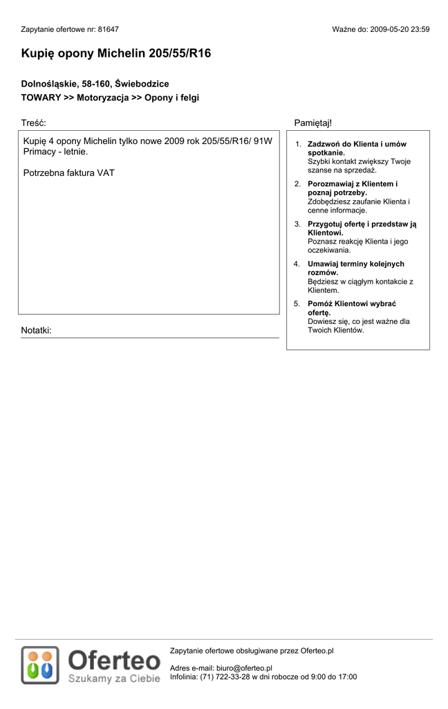 Zapytanie ofertowe nr: 81647 Ważne do: 2009-05-20 23:59 Kupię opony Michelin 205/55/R16 Dolnośląskie, 58-160, Świebodzice TOWARY >> Motoryzacja >> Opony i felgi Treść: Pamiętaj! Kupię 4 opony Michelin tylko nowe 2009 rok 205/55/R16/ 91W Primacy - letnie. 1. Zadzwoń do Klienta i umów spotkanie. Szybki kontakt zwiększy Twoje szanse na sprzedaż. Potrzebna faktura VAT 2. Porozmawiaj z Klientem i poznaj potrzeby. Zdobędziesz zaufanie Klienta i cenne informacje. 3. Przygotuj ofertę i przedstaw ją Klientowi. Poznasz reakcję Klienta i jego oczekiwania. Notatki: 4. Umawiaj terminy kolejnych rozmów. Będziesz w ciągłym kontakcie z Klientem. 5. Pomóż Klientowi wybrać ofertę. Dowiesz się, co jest ważne dla Twoich Klientów. Zapytanie ofertowe obsługiwane przez Oferteo.pl Adres e-mail: [email protected] Infolinia: (71) 722-33-28 w dni robocze od 9:00 do 17:00