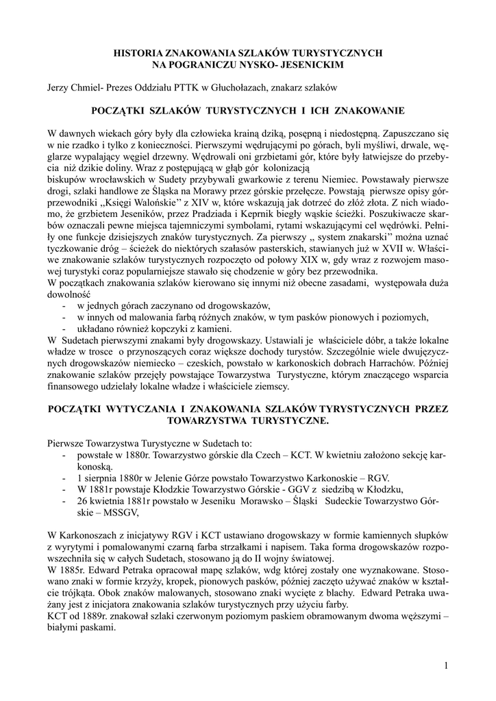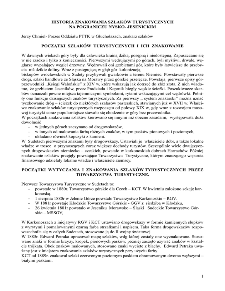 HISTORIA ZNAKOWANIA SZLAKÓW TURYSTYCZNYCH NA POGRANICZU NYSKO- JESENICKIM Jerzy Chmiel- Prezes Oddziału PTTK w Głuchołazach, znakarz szlaków POCZĄTKI SZLAKÓW TURYSTYCZNYCH I ICH ZNAKOWANIE W dawnych wiekach góry były dla człowieka krainą dziką, posępną i niedostępną. Zapuszczano się w nie rzadko i tylko z konieczności. Pierwszymi wędrującymi po górach, byli myśliwi, drwale, węglarze wypalający węgiel drzewny. Wędrowali oni grzbietami gór, które były łatwiejsze do przebycia niż dzikie doliny. Wraz z postępującą w głąb gór kolonizacją biskupów wrocławskich w Sudety przybywali gwarkowie z terenu Niemiec. Powstawały pierwsze drogi, szlaki handlowe ze Śląska na Morawy przez górskie przełęcze. Powstają pierwsze opisy górprzewodniki ,,Księgi Walońskie’’ z XIV w, które wskazują jak dotrzeć do złóż złota. Z nich wiadomo, że grzbietem Jeseników, przez Pradziada i Keprnik biegły wąskie ścieżki. Poszukiwacze skarbów oznaczali pewne miejsca tajemniczymi symbolami, rytami wskazującymi cel wędrówki. Pełniły one funkcje dzisiejszych znaków turystycznych. Za pierwszy ,, system znakarski’’ można uznać tyczkowanie dróg – ścieżek do niektórych szałasów pasterskich, stawianych już w XVII w. Właściwe znakowanie szlaków turystycznych rozpoczęto od połowy XIX w, gdy wraz z rozwojem masowej turystyki coraz popularniejsze stawało się chodzenie w góry bez przewodnika. W początkach znakowania szlaków kierowano się innymi niż obecne zasadami, występowała duża dowolność - w jednych górach zaczynano od drogowskazów, - w innych od malowania farbą różnych znaków, w tym pasków pionowych i poziomych, - układano również kopczyki z kamieni. W Sudetach pierwszymi znakami były drogowskazy. Ustawiali je właściciele dóbr, a także lokalne władze w trosce o przynoszących coraz większe dochody turystów. Szczególnie wiele dwujęzycznych drogowskazów niemiecko – czeskich, powstało w karkonoskich dobrach Harrachów. Później znakowanie szlaków przejęły powstające Towarzystwa Turystyczne, którym znaczącego wsparcia finansowego udzielały lokalne władze i właściciele ziemscy. POCZĄTKI WYTYCZANIA I ZNAKOWANIA SZLAKÓW TYRYSTYCZNYCH PRZEZ TOWARZYSTWA TURYSTYCZNE. Pierwsze Towarzystwa Turystyczne w Sudetach to: - powstałe w 1880r. Towarzystwo górskie dla Czech – KCT. W kwietniu założono sekcję karkonoską. - 1 sierpnia 1880r w Jelenie Górze powstało Towarzystwo Karkonoskie – RGV. - W 1881r powstaje Kłodzkie Towarzystwo Górskie - GGV z siedzibą w Kłodzku, - 26 kwietnia 1881r powstało w Jeseniku Morawsko – Śląski Sudeckie Towarzystwo Górskie – MSSGV, W Karkonoszach z inicjatywy RGV i KCT ustawiano drogowskazy w formie kamiennych słupków z wyrytymi i pomalowanymi czarną farba strzałkami i napisem. Taka forma drogowskazów rozpowszechniła się w całych Sudetach, stosowano ją do II wojny światowej. W 1885r. Edward Petraka opracował mapę szlaków, wdg której zostały one wyznakowane. Stosowano znaki w formie krzyży, kropek, pionowych pasków, później zaczęto używać znaków w kształcie trójkąta. Obok znaków malowanych, stosowano znaki wycięte z blachy. Edward Petraka uważany jest z inicjatora znakowania szlaków turystycznych przy użyciu farby. KCT od 1889r. znakował szlaki czerwonym poziomym paskiem obramowanym dwoma węższymi – białymi paskami. 1 W 1916r. wprowadzono inne kolory środkowego paska; zielony, niebieski i żółty. System ten, zwany paskowym, z pewnymi zmianami przetrwał do dnia dzisiejszego. W 1892r. RGV i KCT zawarły porozumienie w sprawie jednolitego znakowania szlaków w całych Karkonoszach tzw. Znakami geometrycznymi. Dopiero w 1935r. wprowadzono system ,,znakowania docelowego’’, stosowanego w Jesenikach i innych częściach Sudetów. MSSGV od początku swojej działalności, za jeden ze swoich najważniejszych celów przyjęło, wytyczanie szlaków turystycznych. Prace znakarskie rozpoczęto od głównego grzbietu Jeseników. W 1881r, pierwszym roku działalności MSSGV, udało się uzyskać pozwolenia właścicieli dóbr na oznakowane następujących szlaków: na Pradziada, Czerwonohorskie Sedlo, Serak, do Rejwizu. Do 1882r. na terenach najchętniej odwiedzanych przez turystów, powstała sieć szlaków turystycznych. Wytyczono i oznakowano szlaki w dolinach Jeseników, do Zlatych Hor, przez Rejwiz. Sekcja z Prudnika wyznakowała szlaki w Górach Opawskich, koncentrując się na Biskupiej Kopie i okolicach Prudnika. Pierwsze szlaki MSSGV znakowało poprzez przybijane do drzew, drewniane tabliczki w kształcie prostokąta o wymiarach 30cm x 18cm, podzielonego od prawego górnego rogu, do lewego dolnego, pomalowane na dwa kolory. Ostry kąt między przekątną i dłuższą przyprostokątną, wskazuje kierunek do określonego punktu docelowego, który miał przyporządkowany odpowiedni kolor. Obowiązywały następujące zasady: - wszystkie szlaki prowadzące do danego celu powinny mieć jeden charakterystyczny dla tego celu kolor. Np. Serak - niebieski trójkąt, Śnieżnik – biały, Pradziad, Rejwiz i Biskupia Kopa - czerwony. - Używano sześciu kolorów; czerwony, żółty, zielony, niebieski, biały i czarny. Tego typu znakowanie określano jako docelowe. W miarę możliwości malowano znak szlaku na kamieniach, a także ustawiano drogowskazy. Początek i koniec szlaku znajdował się najczęściej na stacji kolejowej, w centrum miejscowości, przy gospodzie, na szczycie góry. W Prudniku szlaki turystyczne miały swój początek przy parkowej altance. W Górach Opawskich metodą docelową wyznakowano gęstą sieć szlaków w okolicach Prudnika, Trzebiny, Lasu Prudnickiego, Pokrzywnej i Jarnołtówka. Cztery warianty szlaku zbiegały się w Dębowcu, skąd biało – czerwony szlak prowadził na Biskupią Kopę, przez Wieszczynę i stok Zamkowej Góry. W Lesie Prudnickim wyznakowano szlaki w barwach flagi miejskiej; biało 