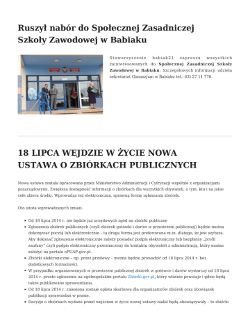 Ruszył nabór do Społecznej Zasadniczej Szkoły Zawodowej w Babiaku Stowarzyszenie babiak21 zaprasza wszystkich zainteresowanych do Społecznej Zasadniczej Szkoły Zawodowej w Babiaku. Szczegółowych informacji udziela sekretariat Gimnazjum w Babiaku tel.: 63) 27 11 776. 18 LIPCA WEJDZIE W ŻYCIE NOWA USTAWA O ZBIÓRKACH PUBLICZNYCH Nowa ustawa została opracowana przez Ministerstwo Administracji i Cyfryzacji wspólnie z organizacjami pozarządowymi. Zwiększa dostępność informacji o zbiórkach dla wszystkich obywateli, o tym, kto i na jakie cele zbiera środki. Wprowadza też elektroniczną, sprawną formę zgłaszania zbiórek. Oto istota wprowadzanych zmian: Od 18 lipca 2014 r. nie będzie już urzędowych zgód na zbiórki publiczne Zgłoszenia zbiórek publicznych (czyli zbiórek gotówki i darów w przestrzeni publicznej) będzie można dokonywać pocztą lub elektronicznie – ta druga forma jest preferowana m.in. dlatego, że jest szybsza. Aby dokonać zgłoszenia elektronicznie należy posiadać podpis elektroniczny lub bezpłatny „profil zaufany” czyli podpis elektroniczny przeznaczony do kontaktu obywateli z administracją, który można założyć na portalu ePUAP.gov.pl. Zbiórki elektroniczne – np. przez przelewy – można będzie prowadzić od 18 lipca 2014 r. bez dodatkowych formalności. W przypadku organizowanych w przestrzeni publicznej zbiórek w gotówce i darów wystarczy od 18 lipca 2014 r. proste zgłoszenie na ogólnopolskim portalu Zbiórki.gov.pl, który właśnie powstaje i gdzie będą także publikowane sprawozdania. Od 18 lipca 2014 r. zniesiona zostaje opłata skarbowa dla organizatorów zbiórek oraz obowiązek publikacji sprawozdań w prasie. Decyzje o zbiórkach wydane przed wejściem w życie nowej ustawy nadal będą obowiązywały – te zbiórki będą rozliczane na dotychczasowych zasadach. Ustawa jest opublikowana w Dzienniku Ustaw, link: http://dziennikustaw.gov.pl/DU/2014/498 Więcej informacji o: nowych zasadach zbiórek – na mac.gov.pl/zbiorki pracach nad projektem nowej ustawy o zbiórkach – mac.gov.pl/projekty/zbiorki-publiczne-po-nowemu, zgodach na zbiórki ogólnopolskie, wydanych przez MAC: mac.gov.pl/zbiorki-publiczne-decyzje-mac-napodstawie-ustawy-o-zbiorkach-publicznych-z-1933-r. tym, jak uzyskuje się bezpłatny podpis elektroniczny (profil zaufany) do kontaktów z administracją: www.cpi.gov.pl/profil_zaufany,164.html Karta dużej rodziny. Od 16 czerwca w gminach można składać wnioski o ogólnopolską Kartę Dużej Rodziny. Beneficjentem programu są członkowie rodziny wielodzietnej (min. troje dzieci) bez względu na jej dochód. Kartę wydaje wójt właściwy ze względu na miejsce zamieszkania rodziny. Posiadanie tego dokumentu może oznaczać dla rodzin tańsze bilety na wydarzenia kulturalne, wystawy, muzea, przejazdy komunikacją publiczną – w zależności od rodzaju i liczby podmiotów gospodarczych przystępujących do programu. Liczbę instytucji i firm, które zaoferują zniżki rodzinom będzie można znaleźć na stronie www.rodzina.gov.pl. Szczegółowych informacji o programie udzielają pracownicy Gminnego Ośrodka Pomocy Społecznej w Babiaku. Wakacje z Orlikiem Stowarzyszenie babiak21 wraz z animatorami sportu pragnie zaprosić wszystkich uczniów oraz dorosłych z terenu gminy Babiak na sportowe spędzanie wolnego czasu w okresie wakacji. Sportowe wakacje na orliku będą realizowane poprzez turnieje w takich dyscyplinach jak: koszykówka, tenis ziemny oraz siatkówka plażowa. Turnieje będą odbywać się z podziałem na dziewczyny/chłopcy oraz kategorie wiekowe: szkoły podstawowe, gimnazjum oraz kategoria open. Terminy następujących dyscyplin: Koszykówka (gra w 21): – Dziewczyny: szkoły podstawowe (3-4 lipiec 2014), gimnazjum (7-8 lipiec 2014), kategoria open (10-11 lipiec 2014) – Chłopcy: szkoły podstawowe (14-16 lipca 2014), gimnazjum (18-22 lipiec 2014), kategoria open (23-25 lipiec 2014) Tenis ziemny: – Dziewczyny: szkoły podstawowe (28-30 lipca 2014), gimnazjum (31-1 lipiec/sierpień 2014), kategoria open (4-6 sierpień 2014), – Chłopcy: szkoły podstawowe (7-10 sierpień 2014), gimnazjum (11-12 sierpień 2014), kategoria open (13-15 sierpień 2014) Siatkówka plażowa: – Dziewczyny: szkoły podstawowe (18-19 sierpień 2014), gimnazjum (20 sierpień 2014), kategoria open (10-11 lipiec 2014), – Chłopcy: szkoły podstawowe (25-26 sierpień), gimnazjum (27 sierpień 2014), kategoria open (23-25 lipca 2014), (28-29 sierpień 2014). Dla najlepszych czekają medale. Zapisy prowadzone są u animatorów orlika w Babiaku. Zakończenie zapisów na daną kategorie wiekową oraz dyscyplinę na 5 dni przed rozpoczęciem turnieju. Warunkiem rozpoczęcie danego turnieju jest udział co najmniej 5 osób/drużyn. Animatorzy sportu udzielą wszelkich szczegółów i zasad rozgrywania turnieju oraz zapewniają niezbędny sprzęt do przeprowadzenia danej dyscypliny. Liczymy na Waszą obecność i chęci! Harmorogram dyżurów radnych Rady Gminy Bbabiak. Radni mają dyżury w poniedziałki w godz. 13:00 – 14:00 w pokój nr 20 w Urzędzie Gminy w Babiaku. Harmonogram: Lp. Nazwisko i imię Data 1. Albin Roman 23.06.2014 r. 2. Dopierała Zbigniew Andrzej 30.06.2014 r. 3. Idczak Zenon Stanisław 07.07.2014 r. 4. Kruszyna Zygmunt 14.07.2014 r. 5. Krygier Henryk Antoni 6. Kwiatkowski Józef 28.07.2014 r. 7. Radowska Wanda 04.08.2014 r. 8. Simiński Szymon 11.08.2014 r. 9. Świętoń Bogdan 18.08.2014 r. 10. Witkowska Jadwiga 25.08.2014 r. 21.07.2014 r. Przewodniczący Rady /-/ Ireneusz Wiśniewski XXXVIII Sesja Rady Gminy Babiak. XXXVIII SESJA RADY GMINY BABIAK odbędzie się w dniu 25 czerwca 2014 r. tj. środa, o godz. 13:00 w sali Gminnego Ośrodka Kultury i Biblioteki Publicznej w Babiaku z następującym porządkiem obrad: 1. Otwarcie Sesji Rady Gminy oraz stwierdzenie prawomocności obrad. 2. Prezentacja porządku obrad Sesji. 3. Przyjęcie Protokółu nr XXXVII/14 poprzedniej ses