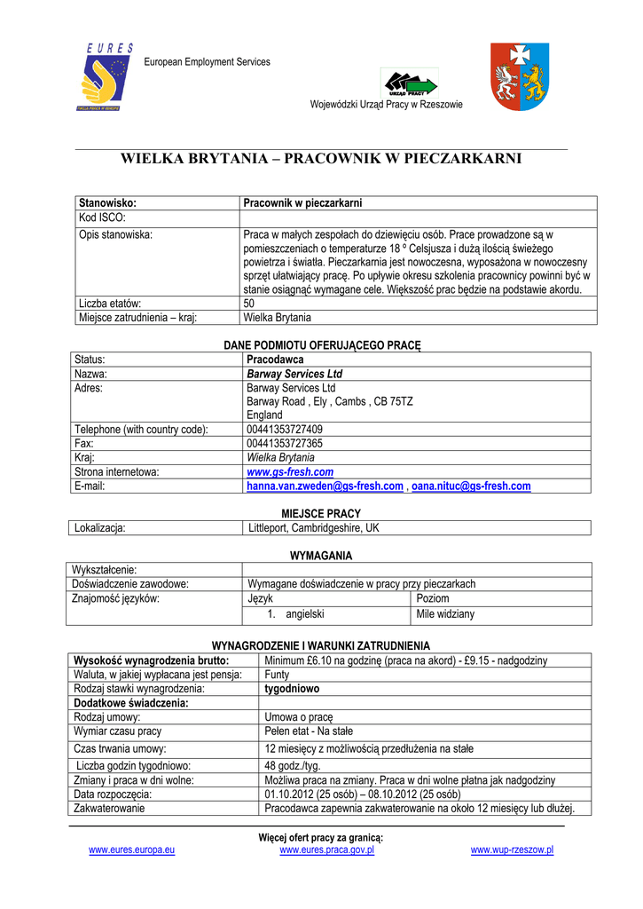 European Employment Services Wojewódzki Urząd Pracy w Rzeszowie WIELKA BRYTANIA – PRACOWNIK W PIECZARKARNI Stanowisko: Kod ISCO: Opis stanowiska: Liczba etatów: Miejsce zatrudnienia – kraj: Status: Nazwa: Adres: Telephone (with country code): Fax: Kraj: Strona internetowa: E-mail: Lokalizacja: Pracownik w pieczarkarni Praca w małych zespołach do dziewięciu osób. Prace prowadzone są w pomieszczeniach o temperaturze 18 º Celsjusza i dużą ilością świeżego powietrza i światła. Pieczarkarnia jest nowoczesna, wyposażona w nowoczesny sprzęt ułatwiający pracę. Po upływie okresu szkolenia pracownicy powinni być w stanie osiągnąć wymagane cele. Większość prac będzie na podstawie akordu. 50 Wielka Brytania DANE PODMIOTU OFERUJĄCEGO PRACĘ Pracodawca Barway Services Ltd Barway Services Ltd Barway Road , Ely , Cambs , CB 75TZ England 00441353727409 00441353727365 Wielka Brytania www.gs-fresh.com [email protected] , [email protected] MIEJSCE PRACY Littleport, Cambridgeshire, UK WYMAGANIA Wykształcenie: Doświadczenie zawodowe: Znajomość języków: Wymagane doświadczenie w pracy przy pieczarkach Język Poziom 1. angielski Mile widziany WYNAGRODZENIE I WARUNKI ZATRUDNIENIA Wysokość wynagrodzenia brutto: Minimum £6.10 na godzinę (praca na akord) - £9.15 - nadgodziny Waluta, w jakiej wypłacana jest pensja: Funty Rodzaj stawki wynagrodzenia: tygodniowo Dodatkowe świadczenia: Rodzaj umowy: Umowa o pracę Wymiar czasu pracy Pełen etat - Na stałe Czas trwania umowy: 12 miesięcy z możliwością przedłużenia na stałe Liczba godzin tygodniowo: 48 godz./tyg. Zmiany i praca w dni wolne: Możliwa praca na zmiany. Praca w dni wolne płatna jak nadgodziny Data rozpoczęcia: 01.10.2012 (25 osób) – 08.10.2012 (25 osób) Zakwaterowanie Pracodawca zapewnia zakwaterowanie na około 12 miesięcy lub dłużej. www.eures.europa.eu Więcej ofert pracy za granicą: www.eures.praca.gov.pl www.wup-rzeszow.pl Mieszkanie w hotelu w stylu akademika. Pokoje 6 osobowe. Pokoje są wyposażone w łóżka, stoły, krzesła, lodówkę, stoliki, szafy. Jednak mieszkańcy proszeni są o zabranie własnej pościeli i poduszek. Toalety, prysznice i pomieszczenia kuchenne są ogólnodostępne. W kuchniach można przygotowywać własne posiłki. Obecna opłata za zakwaterowanie wynosi £ 33,11 na tydzień, łącznie z mediami. SPOSÓB SKŁADANIA DOKUMENTÓW APLIKACYJNYCH Wymagane dokumenty W A Ż N E CV wysłane mailem. KONIECZNE JEST WYPEŁNIENIE ANKIETY NA STRONIE INTERNETOWEJ PRACODAWCY https://mobile.gsfresh.com/OnlineRec/default.aspx?Clie nt=Gs Zakładka Temp seasonal op- Barway 2012 Język, w którym muszą być sporządzone przedkładane dokumenty: Do kogo należy wysłać dokumenty Gdzie należy wysłać dokumenty: Angielski lub polski Pracodawca – Dział kadr [email protected] [email protected] do wiadomości: [email protected] i [email protected] KOORDYNATOR Wojewódzki Urząd Pracy w Rzeszowie Data publikacji: Termin przedkładania podań o pracę / zakończenia ważności oferty: WAŻNOŚĆ 09.08.2012 30.09.2012 Uprzejmie informujemy, że skontaktujemy się wyłącznie z wybranymi kandydatami. Urząd Pracy dokłada wszelkich starań, aby oferty pracy będące w zasobach urzędu, były rzetelne i wiarygodne. Ponieważ wszystkie oferty pracy pochodzą od osób trzecich Urząd Pracy zastrzega, że odpowiedzialność za ewentualne rozbieżności pomiędzy warunkami pracy zaprezentowanymi w niniejszej ofercie a warunkami zaproponowanymi przez potencjalnego pracodawcę ponosi pracodawca. Stosunek pracy z pracodawcą zagranicznym będzie zawarty w ramach prawa obowiązującego w kraju zatrudnienia. Oznacza to, że wszelkie roszczenie z tytułu nie wywiązywania się pracodawcy z warunków zawartych w umowie o pracę, dochodzić można wyłącznie w sądzie pracy w kraju zatrudnienia. W sytuacjach losowych pomoc polskich placówek konsularnych ogranicza się do ewentualnego udzielenia doraźnej pomocy (np. kredytu na zakup biletu powrotnego do Polski ). Na podstawie ustawy o ochronie danych osobowych z dnia 29 sierpnia 1997 r. (Dz. U. z 2002 r. Nr 101, poz. 926 ze zm.) informujemy, że administratorem danych osobowych wskazanych w dokumentach przekazanych w odpowiedzi na ofertę pracy jest pracodawca zagraniczny / Wojewódzki Urząd Pracy w Rzeszowie, ul. Lisa-Kuli 20,35-025 Rzeszów / Dane osobowe wskazane dobrowolnie w ww. dokumentach będą przetwarzane i udostępniane publicznym służbom zatrudnienia, pracodawcom lub podmiotom reprezentującym pracodawców do celów związanych z pośrednictwem pracy w ramach sieci EURES, na podstawie ustawy z dnia 20 kwietnia 2004 r. o promocji zatrudnienia i instytucjach rynku pracy (Dz. U. z 2008 r. Nr 69, poz. 415 ze zm.) przez okres konieczny do osiągnięcia celu określonego w przedmiotowej ustawie. Osobie, której dane osobowe dotyczą przysługuje prawo dostępu do ich treści i prawo ich poprawiania. www.eures.europa.eu Więcej ofert pracy za granicą: www.eures.praca.gov.pl www.wup-rzeszow.pl