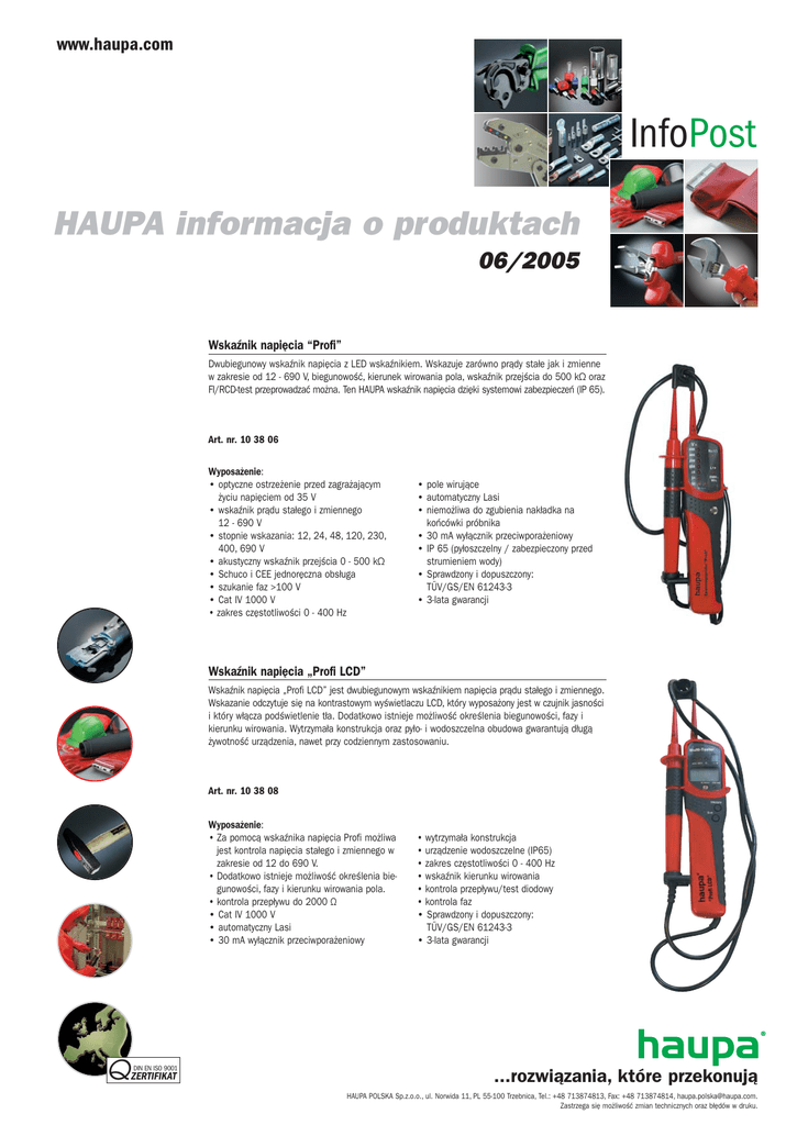 www.haupa.com InfoPost HAUPA informacja o produktach 06/2005 Wskaźnik napięcia “Profi” Dwubiegunowy wskaźnik napięcia z LED wskaźnikiem. Wskazuje zarówno prądy stałe jak i zmienne w zakresie od 12 - 690 V, biegunowość, kierunek wirowania pola, wskaźnik przejścia do 500 kΩ oraz FI/RCD-test przeprowadzać można. Ten HAUPA wskaźnik napięcia dzięki systemowi zabezpieczeń (IP 65). Art. nr. 10 38 06 Wyposażenie: • optyczne ostrzeżenie przed zagrażającym życiu napięciem od 35 V • wskaźnik prądu stałego i zmiennego 12 - 690 V • stopnie wskazania: 12, 24, 48, 120, 230, 400, 690 V • akustyczny wskaźnik przejścia 0 - 500 kΩ • Schuco i CEE jednoręczna obsługa • szukanie faz >100 V • Cat IV 1000 V • zakres częstotliwości 0 - 400 Hz • pole wirujące • automatyczny Lasi • niemożliwa do zgubienia nakładka na końcówki próbnika • 30 mA wyłącznik przeciwporażeniowy • IP 65 (pyłoszczelny / zabezpieczony przed strumieniem wody) • Sprawdzony i dopuszczony: TÜV/GS/EN 61243-3 • 3-lata gwarancji Wskaźnik napięcia „Profi LCD” Wskaźnik napięcia „Profi LCD” jest dwubiegunowym wskaźnikiem napięcia prądu stałego i zmiennego. Wskazanie odczytuje się na kontrastowym wyświetlaczu LCD, który wyposażony jest w czujnik jasności i który włącza podświetlenie tła. Dodatkowo istnieje możliwość określenia biegunowości, fazy i kierunku wirowania. Wytrzymała konstrukcja oraz pyło- i wodoszczelna obudowa gwarantują długą żywotność urządzenia, nawet przy codziennym zastosowaniu. Art. nr. 10 38 08 Wyposażenie: • Za pomocą wskaźnika napięcia Profi możliwa jest kontrola napięcia stałego i zmiennego w zakresie od 12 do 690 V. • Dodatkowo istnieje możliwość określenia biegunowości, fazy i kierunku wirowania pola. • kontrola przepływu do 2000 Ω • Cat IV 1000 V • automatyczny Lasi • 30 mA wyłącznik przeciwporażeniowy Q DIN EN ISO 9001 ZERTIFIKAT • wytrzymała konstrukcja • urządzenie wodoszczelne (IP65) • zakres częstotliwości 0 - 400 Hz • wskaźnik kierunku wirowania • kontrola przepływu/test diodowy • kontrola faz • Sprawdzony i dopuszczony: TÜV/GS/EN 61243-3 • 3-lata gwarancji ...rozwiązania, które przekonują HAUPA POLSKA Sp.z.o.o., ul. Norwida 11, PL 55-100 Trzebnica, Tel.: +48 713874813, Fax: +48 713874814, [email protected]. Zastrzega się możliwość zmian technicznych oraz błędów w druku. www.haupa.com InfoPost HAUPA “Multi Check” - Wysokowydajny cyfrowy miernik uniwersalny ze zintegrowanym pomiarem temperatury HAUPA “Multi Clamp” - Miniaturowe szczypce prądowe AC/DC 600 V Cyfrowy miernik uniwersalny HAUPA z funkcją testu baterii. Dzięki funkcji automatycznego ustawiania odpada uciążliwe przełączanie. Dodatkowo można ręcznie włączyć podświetlenie tła. Urządzenie posiada ponadto funkcję automatycznego włączania i wyłączania i wskaźnik wyczerpania baterii. Podczas testowania baterii następuje ich obciążenie i w ten sposób możliwe jest dokładne wskazanie. Miniaturowy cyfrowy amperomierz szczypcowy wyposażony jest w czytelny wyświetlacz LCD i wskaźnik graficzny. Ręczny i automatyczny wybór zakresu pomiarowego oraz podświetlenie tła umożliwiają wielostronne i bezpieczne zastosowanie. Torba z tworzywa sztucznego wchodząca w skład urządzenia bezpiecznie chroni urządzenie wraz z oprzyrządowaniem, również podczas transportu. Osadzenie urządzenia w futerale z odchylnym wspornikiem umożliwia jego zastosowanie również w niesprzyjających warunkach. Art. nr. 10 38 10 Cyfrowy miernik uniwersalny HAUPA posiada zakres pomiaru temperatury do 1000°C oraz tester hFE do tranzystorów. Wyposażenie: • zakres napięcia stałego: do 600 V ±1% • zakres napięcia zmiennego: do 600 V ±1% • zakres prądu zmiennego: do 400 A ±2% • rozwarcie szczypiec maks. 28 mm • zakres pomiaru oporu: do 400 ±1% • automatyczny i ręczny wybór zakresu pomiarowego • funkcja Datahold • akustyczny test przepływu • podświetlenie tła • dołączone oprzyrządowanie: podręczny futerał, przewody pomiarowe, bateria • Sprawdzony i dopuszczony: TÜV/GS IEC/EN 61010-1 • 3-lata gwarancji Art. nr. 10 38 12 Wyposażenie: • wyświetlacz: • napięcie zmienne: • napięcie stałe: • prąd zmienny: • prąd stały: • prąd zmienny przy opt. szczypcach: • prąd stały przy opt. szczypcach: • opór: • temperatura: • test baterii: 16 mm LCD, 31/2 cyfrowy 200 m, 2, 20, 200, 600 V ±0,8% 200 m, 2, 20, 200, 600 V ±0,7% 200 µ, 2 m, 20 m, 200 m, 2, 10 A ±3,0% 200 µ, 2 m, 20 m, 200 m, 2, 10 A ±2,0% 200, 2000 A ±1,5% 200, 2000 A ±1,2% Wskaźnik przejścia "Control" 200, 2000, 20 k, 200 k, 20 MΩ ±1,2%, 20 MΩ ±2,0% -20°C - +1000°C, 0°F - + 1800°F ±3,0% 1,5 V (prąd testowy 50 mA), 3,0 V (prąd testowy 30 mA) 9,0 V (prąd testowy 12 mA) • test przepływu: sygnał akustyczny < 50 Ω • test diodowy: napięcie zwrotne w mV • test tranzystorów: współczynnik wzmocnienia hFE • kategoria przepięcia: CAT III 600 V • napięcie robocze: 3 x 1,5 V typ AAA Micro • wymiary: 158 x 74 x 31 mm • waga: 220 g z bateriami • zakres dostawy: 2 szt. przewodów pomiarowych, 1 szt. instrukcja obsługi 3 szt. baterii typu AAA Micro • Sprawdzony i TÜV/GS IEC/EN 61010 dopuszczony: • gwarancji: 3-lata Wskaźnik napięcia “Basic” Dwubiegunowy wskaźnik napięcia wskazuje prąd stały i zmienny w zakresie od 6-400 V w siedmiu zakresach przez LED (6, 12, 24, 50, 120, 230 i 400). Określenie polaryzacji i fazy przeciwnej przewodowi ochronnemu jest również możliwe. Korpus z gumowaną częścią chwytną leży dopasowany w ręce. “Basic” działa bez baterii. Pobiera potrzebne do funkcjonowania napięcie z obiektu testowanego. Art. nr. 10 38 00 Wyposażenie: • prąd stały i zmienny od 6 - 400 V przez LED • wskazanie faz przeciwnych do przewodu ochronnego • wskaźnik polaryzacji • rodzaj zabezpieczenia I