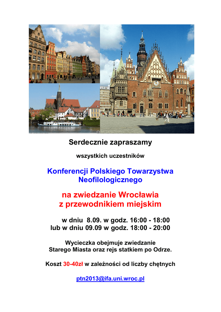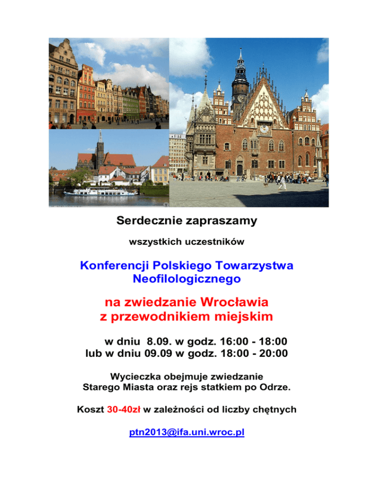 Serdecznie zapraszamy wszystkich uczestników Konferencji Polskiego Towarzystwa Neofilologicznego na zwiedzanie Wrocławia z przewodnikiem miejskim w dniu 8.09. w godz. 16:00 - 18:00 lub w dniu 09.09 w godz. 18:00 - 20:00 Wycieczka obejmuje zwiedzanie Starego Miasta oraz rejs statkiem po Odrze. Koszt 30-40zł w zależności od liczby chętnych [email protected]