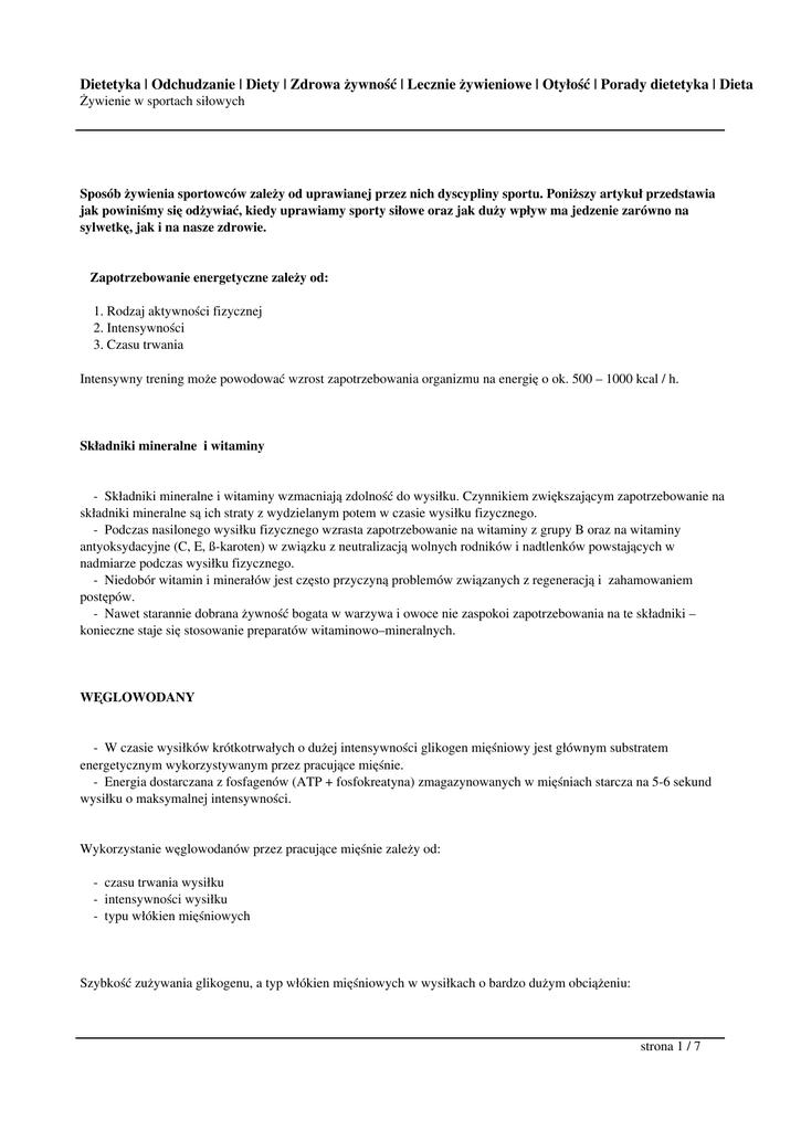 Dietetyka | Odchudzanie | Diety | Zdrowa żywność | Lecznie żywieniowe | Otyłość | Porady dietetyka | Dieta Żywienie w sportach siłowych Sposób żywienia sportowców zależy od uprawianej przez nich dyscypliny sportu. Poniższy artykuł przedstawia jak powiniśmy się odżywiać, kiedy uprawiamy sporty siłowe oraz jak duży wpływ ma jedzenie zarówno na sylwetkę, jak i na nasze zdrowie. Zapotrzebowanie energetyczne zależy od: 1. Rodzaj aktywności fizycznej 2. Intensywności 3. Czasu trwania Intensywny trening może powodować wzrost zapotrzebowania organizmu na energię o ok. 500 – 1000 kcal / h. Składniki mineralne i witaminy - Składniki mineralne i witaminy wzmacniają zdolność do wysiłku. Czynnikiem zwiększającym zapotrzebowanie na składniki mineralne są ich straty z wydzielanym potem w czasie wysiłku fizycznego. - Podczas nasilonego wysiłku fizycznego wzrasta zapotrzebowanie na witaminy z grupy B oraz na witaminy antyoksydacyjne (C, E, ß-karoten) w związku z neutralizacją wolnych rodników i nadtlenków powstających w nadmiarze podczas wysiłku fizycznego. - Niedobór witamin i minerałów jest często przyczyną problemów związanych z regeneracją i zahamowaniem postępów. - Nawet starannie dobrana żywność bogata w warzywa i owoce nie zaspokoi zapotrzebowania na te składniki – konieczne staje się stosowanie preparatów witaminowo–mineralnych. WĘGLOWODANY - W czasie wysiłków krótkotrwałych o dużej intensywności glikogen mięśniowy jest głównym substratem energetycznym wykorzystywanym przez pracujące mięśnie. - Energia dostarczana z fosfagenów (ATP + fosfokreatyna) zmagazynowanych w mięśniach starcza na 5-6 sekund wysiłku o maksymalnej intensywności. Wykorzystanie węglowodanów przez pracujące mięśnie zależy od: - czasu trwania wysiłku - intensywności wysiłku - typu włókien mięśniowych Szybkość zużywania glikogenu, a typ włókien mięśniowych w wysiłkach o bardzo dużym obciążeniu: strona 1 / 7 Dietetyka | Odchudzanie | Diety | Zdrowa żywność | Lecznie żywieniowe | Otyłość | Porady dietetyka | Dieta Żywienie w sportach siłowych - najszybciej glikogen zużywany jest we włóknach typu II X - po zaprzestaniu wysiłku z powodu wyczerpania stwierdza się niemal całkowite zużycie glikogenu we włóknach typu II X - we włóknach typu II A zużyte jest ok. 70 % glikogenu - najwolniej glikogen zużywany jest we włóknach typu I - zużycie glikogenu po zaprzestaniu wysiłku z powodu wyczerpania szacuje się na ok. 25% Wysiłki statycze - Jeżeli siła skurczu przewyższa 20% maksymalnej dowolnej siły skurczu, dochodzi do zamknięcia dopływu krwi do włókien mięśniowych - Dostaje odcięty dowóz tlenu, substratów energetycznych, hormonów – jedynym źródłem energii może być tylko mięśniowy glikogen. - Dzienna podaż energii z węglowodanów nie powinna być mniejsza niż 55 %, co oznacza około 4-6 g na kg / m.c. Węglowadny dzielą sie na: 1. Węglowodany proste wchłaniają się bardzo szybko i charakteryzują się wysokim indeksem glikemicznym (gwałtownie podnoszą poziom cukru we krwi) 2. Węglowodany złożone wchłaniają się powoli i charakteryzują się niskim indeksem glikemicznym (w umiarkowany sposób zwiększają poziom cukru we krwi) - śliwki, brzoskwinie, grejpfruty, ziemniaki i soczewica. BIAŁKO - Sportowcy trenujący dyscypliny siłowo-wytrzymałościowe mogą spożywać ilości białka zwiększone do 15% - Wg. norm przyjętych w USA i Kanadzie zapotrzebowanie na białko u ludzi o siedzącym trybie życia powinno wynosić 0,8g/kg m.c. - Zalecana zawartość białka w diecie nie jest jednoznaczna - Zwiększenie dawki białka w diecie do ilości 2,8g/kg m.c. powoduje większy przyrost masy mięśniowej w porównaniu z 1,4 g/kg m.c. Jednak w innych badaniach nie wykazano różnic w przyroście. - Rekomenduje się, by dzienne spożycie wynosiło 1,2-1,7 g/kg masy ciała. Wyższa podaż powinna być u trenującej młodzieży. - Dzienne zapotrzebowanie na białko dla aktywnych kulturystów wynosi 1,8-2,0g. - Aminokwasy nie są magazynowane, toteż nadmierna konsumpcja obciąża ustrój. Wysiłek zwiększa katabolizm białek i hamuje ich syntezę w mięśniach, wątrobie, ścianie jelit. W okresie powysiłkowej odnowy dochodzi do znacznego wzrostu syntezy białka w tych tkankach. W czasie wysiłku mięśnie utleniają strona 2 / 7 Dietetyka | Odchudzanie | Diety | Zdrowa żywność | Lecznie żywieniowe | Otyłość | Porady dietetyka | Dieta Żywienie w sportach siłowych zwiększone ilości aminokwasów o rozgałęzionym łańcuchu, głównie leucyny. Podawanie glukozy i insulina zmniejszają utlenianie tych aminokwasów.Gdy podaż przewyższa zapotrzebowanie, białka ulegają przekształceniu w węglowodany i tłuszcze. Wartość kaloryczna diety kulturysty o masie ciała 100 kg wynosi ok. 4000 kcal. 600 kcal dostarczają białka, zawartość białka w diecie powinna wynosić 150 gramów. Produkty wysokobiałkowe: - Mięso, wędliny, ryby 15-30% - Strączkowe suche 21-25% - Mleko, napoje mleczne 1-4% - Sery twarogowe 16-21% - Jaja 13% W przypadku diety niskotłuszczowej należy spożywać białka ze źródeł o małej zawartości tłuszczu: Zalecane do jedzenia - Ryby (tuńczyk, dorsz, mintaj) - Drób ( mięso z piersi kurczaka, indyk) - Białka z jajek - Warzywa i owoce - Mleko odtłuszczone Nie zalecane - Wołowina - Wieprzowina - Żółtka jajek - Słodycze Uzupełniając straty białka po treningu w przedziale 2h : - dieta powinna obfitować w produkty zwierzęce o niskiej zawartości tłuszczu - potrawy zawierające pełnowartościowe białko należy oddzielać od produktów wysokobłonnikowych. - popularną metodą stało się przyjęcie po wysiłku odżywki białkowej lub białkowo- węglowodanowej. TŁUSZCZE - Tłuszcz stanowi drugi, oprócz węglowodanów substrat energetyczny dla pracujących mięśni. - Zalecane dzienne spożycie tłuszczu nie powinno przekracza
