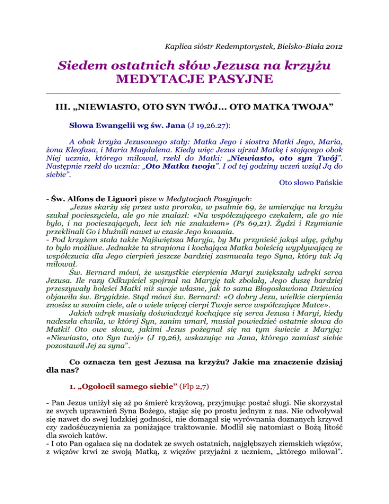 Kaplica sióstr Redemptorystek, Bielsko-Biała 2012 Siedem ostatnich słów Jezusa na krzyżu MEDYTACJE PASYJNE ___________________________________________________________________________ III. „NIEWIASTO, OTO SYN TWÓJ... OTO MATKA TWOJA” Słowa Ewangelii wg św. Jana (J 19,26.27): A obok krzyża Jezusowego stały: Matka Jego i siostra Matki Jego, Maria, żona Kleofasa, i Maria Magdalena. Kiedy więc Jezus ujrzał Matkę i stojącego obok Niej ucznia, którego miłował, rzekł do Matki: „Niewiasto, oto syn Twój”. Następnie rzekł do ucznia: „Oto Matka twoja”. I od tej godziny uczeń wziął Ją do siebie”. Oto słowo Pańskie - Św. Alfons de Liguori pisze w Medytacjach Pasyjnych: „Jezus skarży się przez usta proroka, w psalmie 69, że umierając na krzyżu szukał pocieszyciela, ale go nie znalazł: «Na współczującego czekałem, ale go nie było, i na pocieszających, lecz ich nie znalazłem» (Ps 69,21). Żydzi i Rzymianie przeklinali Go i bluźnili nawet w czasie Jego konania. - Pod krzyżem stała także Najświętsza Maryja, by Mu przynieść jakąś ulgę, gdyby to było możliwe. Jednakże ta strapiona i kochająca Matka boleścią wypływającą ze współczucia dla Jego cierpień jeszcze bardziej zasmucała tego Syna, który tak Ją miłował. Św. Bernard mówi, że wszystkie cierpienia Maryi zwiększały udręki serca Jezusa. Ile razy Odkupiciel spojrzał na Maryję tak zbolałą, Jego duszę bardziej przeszywały boleści Matki niż swoje własne, jak to sama Błogosławiona Dziewica objawiła św. Brygidzie. Stąd mówi św. Bernard: «O dobry Jezu, wielkie cierpienia znosisz w swoim ciele, ale o wiele więcej cierpi Twoje serce współczujące Matce». Jakich udręk musiały doświadczyć kochające się serca Jezusa i Maryi, kiedy nadeszła chwila, w której Syn, zanim umarł, musiał powiedzieć ostatnie słowa do Matki! Oto owe słowa, jakimi Jezus pożegnał się na tym świecie z Maryją: «Niewiasto, oto Syn twój» (J 19,26), wskazując na Jana, którego zamiast siebie pozostawił Jej za syna”. Co oznacza ten gest Jezusa na krzyżu? Jakie ma znaczenie dzisiaj dla nas? 1. „Ogołocił samego siebie” (Flp 2,7) - Pan Jezus uniżył się aż po śmierć krzyżową, przyjmując postać sługi. Nie skorzystał ze swych uprawnień Syna Bożego, stając się po prostu jednym z nas. Nie odwoływał się nawet do swej ludzkiej godności, nie domagał się wyrównania doznanych krzywd czy zadośćuczynienia za poniżające traktowanie. Modlił się natomiast o Bożą litość dla swoich katów. - I oto Pan ogałaca się na dodatek ze swych ostatnich, najgłębszych ziemskich więzów, z więzów krwi ze swoją Matką, z więzów przyjaźni z uczniem, „którego miłował”. Porzuciwszy wszystko, nie ma już nic, z czym mógłby stanąć w obliczu Ojca: ani godności, ani praw, ani odzienia, ani matki, ani uczniów. Wyzbył się siebie bez reszty. Nie ma zatem już nic. Wszystkie więzy zostały zerwane, nie wyłączając tych najdroższych, które Go łączyły z Matką i gronem uczniów. Więź krwi nie jest tu najistotniejsza. Przypomnijmy sobie, co sam oświadczył: „Bo kto pełni wolę Ojca mojego, który jest w niebie, ten jest Mi bratem, siostrą i matką” (Mt 12,4.50). 2. Więzy zerwane, więzy nowe - Każdemu cierpieniu towarzyszy płodność. Można do tego przyłożyć analogię do bólów porodu. Gdy więzy łączące Jezusa z Maryją i św. Janem zostają zerwane, ściślejszy się staje związek Matki z uczniem. - U stóp krzyża zostają sobie nawzajem powierzeni. „I od tej godziny uczeń wziął Ją do siebie” (J 19,27), w oczywisty sposób przyjmując Maryję nie tylko pod swój dach, ale i do swojego serca. Tak oto Ten, który z miłości wyrzekł się jednych więzów, mocą tej samej miłości sprawia, że tworzą się więzy nowe, chociaż w innym miejscu. - W scenie tej widać podobieństwo do zaślubin: Maryja i uczeń zostali sobie podarowani przez Syna Bożego. Teraz więc to, co sam Bóg połączył, nie może zostać przez nikogo rozdzielone. Maryja i Kościół pozostaną już nierozłączni. Ona otwiera się teraz na inne macierzyństwo: w miejsce Jedynaka będzie mieć odtąd niezliczenie wielu synów. - I tak jak za pierwszym razem, gdy godziła się Go począć, dokonuje się ten nowy cud mocą jednego „oto”. Tym razem już nie anioł zwraca się do niej w ten sposób, ale sam Syn Boży. - Jej płodność nie będzie ograniczona do jednego pokolenia, ponieważ stanie się płodnością wszystkich czasów, obejmując całe generacje dzieci Bożych. Zawiera ona bowiem w sobie tę samą wiarę, tę samą skałę, na której może się oprzeć, co przed trzydziestu paru laty. - Przez wiarę Maryja stała się Matką Syna Bożego i przez tę samą wiarę staje się teraz Matką wspólnoty wierzących. 3. Kościół posiada Matkę - I tak św. Jan wziął Maryję do siebie. W tym prostym zdaniu kryje się więcej znaczeń. Przede wszystkim dom Jana, gdzie Maryja wchodzi, jest nie tylko siedzibą materialną, bo jest nim również jego serce. - W greckim określeniu „do siebie” zawarta jest głębsza treść: św. Jan ma odtąd Matkę, a tym samym ma Ją i cały Kościół. Stykamy się w tym miejscu z wielką tajemnicą. - Wziąć Maryję do siebie oznacza zachwycić się jej duchowym pięknem, pozwolić, by ono nas kształtowało. - Kościół zbudowany jest na słowie Bożym, na tajemnicy paschalnej Chrystusa i na sakramentach, które uobecniają to misterium pośród nas. Stwierdzenie, że Kościół posiada Matkę, nie jest jednak tylko jakąś banalną przenośną. To fakt, że nie Ona nas zbawiła, że nie jest pośredniczką w tym samym znaczeniu, w jakim pośredniczy u Ojca Pan Jezus. A jednak Jej matkowanie Kościołowi nie jest też tylko pobożnym życzeniem ani uroczym obrazkiem z okolicznościowych laurek. To, że Kościół posiada Matkę, wycisnęło na naszej świadomości bycia Kościołem