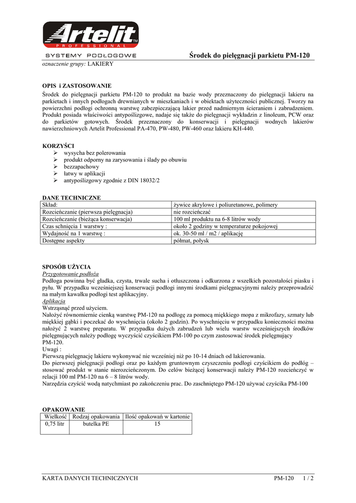 Środek do pielęgnacji parkietu PM-120 oznaczenie grupy: LAKIERY OPIS i ZASTOSOWANIE Środek do pielęgnacji parkietu PM-120 to produkt na bazie wody przeznaczony do pielęgnacji lakieru na parkietach i innych podłogach drewnianych w mieszkaniach i w obiektach użyteczności publicznej. Tworzy na powierzchni podłogi ochronną warstwę zabezpieczającą lakier przed nadmiernym ścieraniem i zabrudzeniem. Produkt posiada właściwości antypoślizgowe, nadaje się także do pielęgnacji wykładzin z linoleum, PCW oraz do parkietów gotowych. Środek przeznaczony do konserwacji i pielęgnacji wodnych lakierów nawierzchniowych Artelit Professional PA-470, PW-480, PW-460 oraz lakieru KH-440. KORZYŚCI wysycha bez polerowania produkt odporny na zarysowania i ślady po obuwiu bezzapachowy łatwy w aplikacji antypoślizgowy zgodnie z DIN 18032/2 DANE TECHNICZNE Skład: Rozcieńczanie (pierwsza pielęgnacja) Rozcieńczanie (bieżąca konserwacja) Czas schnięcia 1 warstwy : Wydajność na 1 warstwę : Dostępne aspekty żywice akrylowe i poliuretanowe, polimery nie rozcieńczać 100 ml produktu na 6-8 litrów wody około 2 godziny w temperaturze pokojowej ok. 30-50 ml / m2 / aplikację półmat, połysk SPOSÓB UŻYCIA Przygotowanie podłoża Podłoga powinna być gładka, czysta, trwale sucha i otłuszczona i odkurzona z wszelkich pozostałości piasku i pyłu. W przypadku wcześniejszej konserwacji podłogi innymi środkami pielęgnacyjnymi należy przeprowadzić na małym kawałku podłogi test aplikacyjny. Aplikacja Wstrząsnąć przed użyciem. Nałożyć równomiernie cienką warstwę PM-120 na podłogę za pomocą miękkiego mopa z mikrofazy, szmaty lub miękkiej gąbki i poczekać do wyschnięcia (około 2 godzin). Po wyschnięciu w przypadku konieczności można nałożyć 2 warstwę preparatu. W przypadku dużych zabrudzeń lub wielu warstw wcześniejszych środków pielęgnujących należy podłogę wyczyścić czyścikiem PM-100 po czym zastosować środek pielęgnujący PM-120. Uwagi : Pierwszą pielęgnację lakieru wykonywać nie wcześniej niż po 10-14 dniach od lakierowania. Do pierwszej pielęgnacji podłogi oraz po każdym gruntownym czyszczeniu podłogi czyścikiem do podłóg – stosować produkt w stanie nierozcieńczonym. Do celów bieżącej konserwacji należy PM-120 rozcieńczyć w relacji 100 ml PM-120 na 6 – 8 litrów wody. Narzędzia czyścić wodą natychmiast po zakończeniu prac. Do zaschniętego PM-120 używać czyścika PM-100 OPAKOWANIE Wielkość Rodzaj opakowania Ilość opakowań w kartonie 0,75 litr butelka PE 15 KARTA DANYCH TECHNICZNYCH PM-120 1/2 Środek do pielęgnacji parkietu PM-120 PRZECHOWYWANIE Przechowywać w oryginalnie zamkniętych opakowaniach, w temperaturze powyżej +5oC przez okres 12 miesięcy od daty produkcji. Chronić przed mrozem. Data produkcji i nr partii na opakowaniu. Selena S.A., Wrocław, ul. Wyścigowa 56E, www.artelit.pl , infolinia: 0801 350 500 Aktualizacja 11.10.2010 Publikacja niniejszej kart technicznej powoduje utratę ważności poprzedniej jej wersji Powyższe dane, zalecenia i wskazówki opierają się na naszej najlepszej wiedzy, badaniach oraz doświadczeniach i zostały udzielone w dobrej wierze zgodnie z zasadami obowiązującymi w naszej firmie i u naszych dostawców. Zaproponowane sposoby postępowania uznane są za powszechne, jednak każdy z użytkowników tego materiału powinien upewnić się na wszelkie możliwe sposoby, włącznie ze sprawdzeniem produktu końcowego w odpowiednich warunkach, o przydatności dostarczanych materiałów dla osiągnięcia celów przez niego zamierzonych. Ani Spółka, ani jej upoważnieni przedstawiciele nie mogą ponosić odpowiedzialności za jakiekolwiek straty poniesione na skutek nieprawidłowego, bądź błędnego użycia jej materiałów KARTA DANYCH TECHNICZNYCH PM-120 2/2